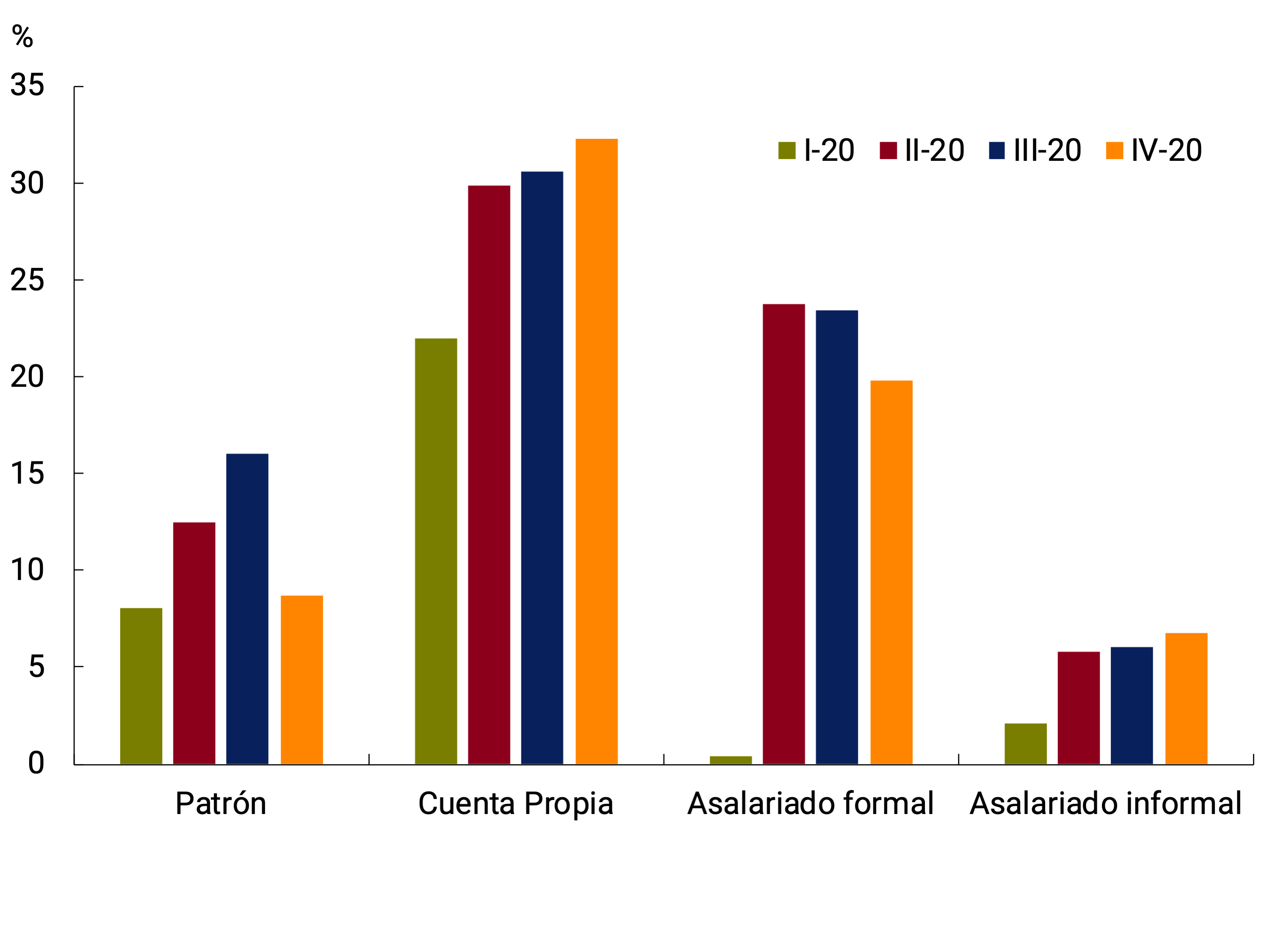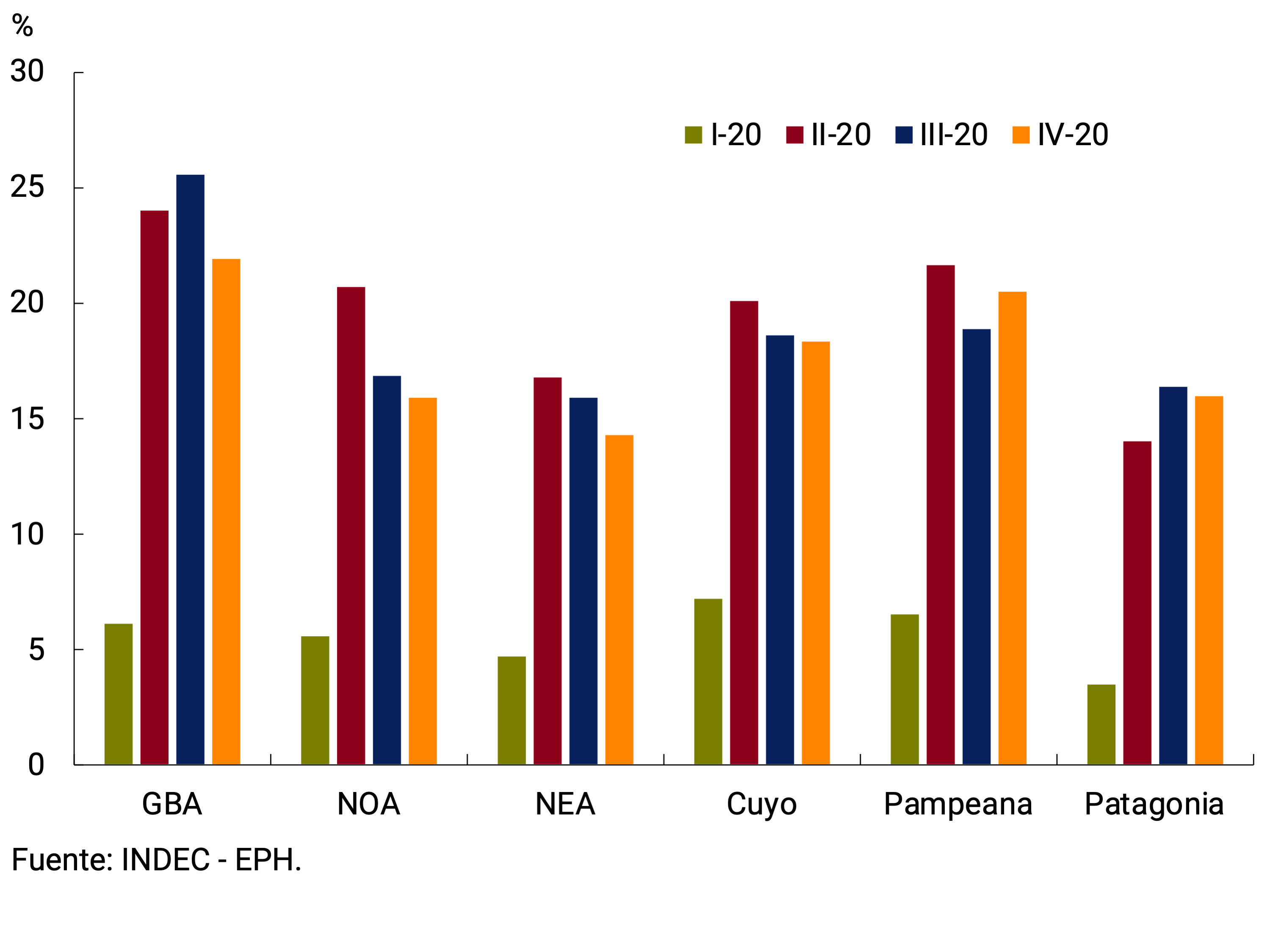 Los indicadores de ocupación laboral acompañaron la recuperación económica, aunque en su mayoría todavía no retornaron a su nivel prepandemia. Al cuarto trimestre de 2020 la tasa de empleo mostró una mejora en simultáneo con el proceso de normalización de la tasa de actividad13. La población económicamente activa creció hasta 45%, 2,7 p.p. respecto del trimestre anterior, pero con una merma de 2,2 p.p. en términos interanuales. En el cuarto trimestre de 2020 se contabilizaron 3,1 millones de personas que volvieron a acceder a un empleo, recuperando de esta manera el 79% de los puestos perdidos durante el segundo trimestre de 2020. Las modalidades de empleo que resultaron más afectadas durante 2020 fueron las más dinámicas: se reincorporaron al mercado de trabajo 1,4 millones de asalariadas/os no registrados y 1,9 millones de no asalariadas/os (trabajo por cuenta propia y patrones). La adaptación del mercado laboral a la pandemia implicó también nuevas tendencias respecto a la modalidad de trabajo (ver Apartado 3. Cambios en las metodologías de trabajo: El teletrabajo en Argentina). Finalmente, la tasa de desocupación se ubicó en 11,0%, 2,1 p.p. inferior a la tasa del segundo trimestre y 2,1 p.p. superior a la del cuarto trimestre de 2019, tanto por el aumento interanual de los desocupados como por el efecto de reducción de la Población Económicamente Activa (PEA).