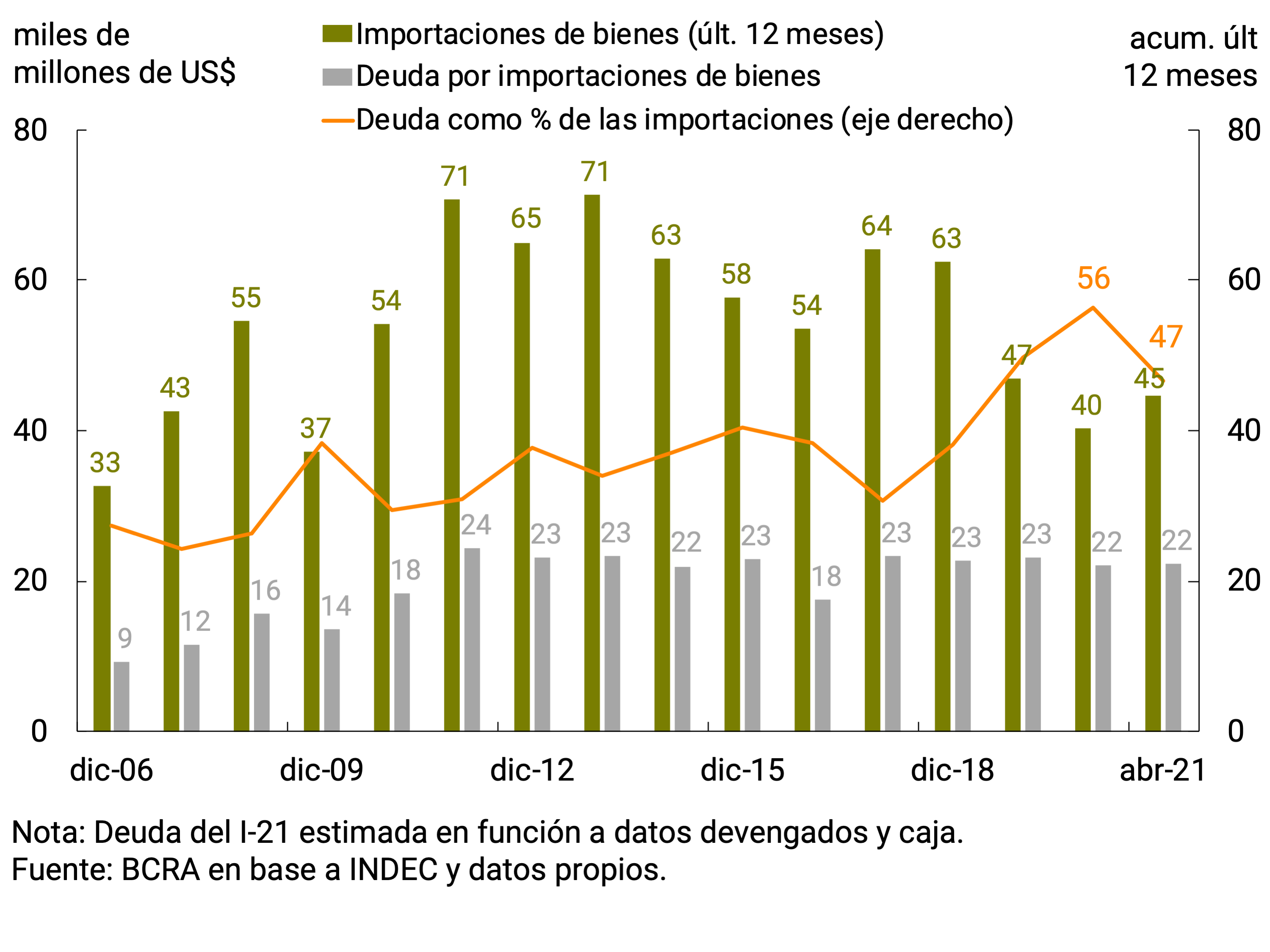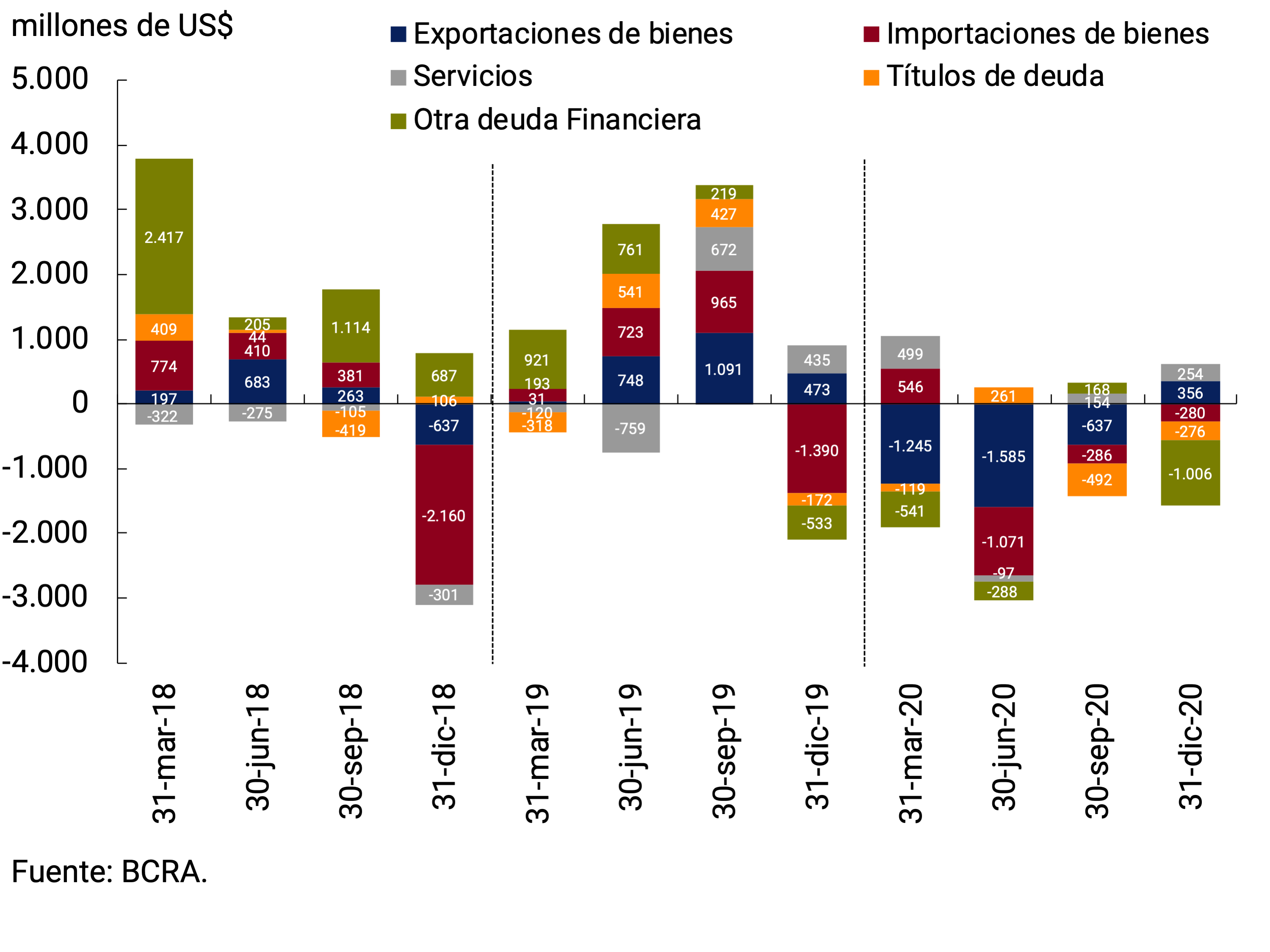 En el mismo sentido, la deuda de importaciones de bienes resultó en cancelaciones netas de US$1.092 millones en 2020 (ver Gráfico 2). Luego de un primer trimestre de 2020, en el cual aumentó la deuda en unos US$546 millones, se observó una aceleración en los pagos de importaciones a través del mercado de cambios en relación con las importaciones, lo que propició las cancelaciones de esta clase de deuda, resultando en una significativa caída de la misma en el segundo trimestre de unos US$1.100 millones. En este contexto, el BCRA mediante la Comunicación A7030 de mayo de 2020, reguló los pagos de obligaciones comerciales con el exterior, estableciendo que, aunque con ciertas excepciones, los importadores requirieran conformidad previa del Banco Central para efectuar pagos de importaciones de bienes por encima del valor de sus importaciones, en ambos casos acumulados desde el 1 de enero de 2020. Desde julio de 2020, la normativa se fue perfeccionando, atendiendo a las necesidades comerciales particulares de distintos sectores productivos. Los efectos de los cambios normativos impactaron con mayor intensidad en el último trimestre del año, reduciendo los niveles de cancelación de deuda de importaciones observada en los trimestres previos, aunque persistió la reducción de financiamiento mediante otras formas de pago que no se efectúan a través del mercado de cambios, tales como la capitalización o condonación de deuda, el uso de fondos en el exterior de libre disponibilidad, entre otros.