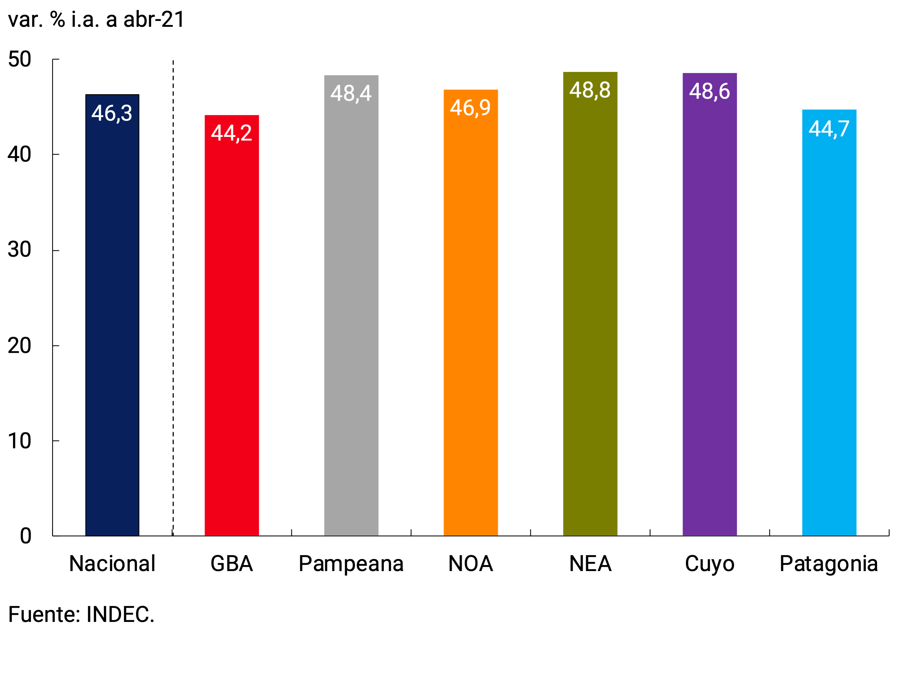 Con datos a abril 2021, la inflación a nivel nacional promedió una suba acumulada en los últimos doce meses de 46,3% i.a. Al interior del país, la dispersión de los registros interanuales resultó algo mayor que en el pasado (con un desvío estándar de 1,9 p.p. y un coeficiente de variación de 4%), manteniendo una tendencia similar entre las diferentes regiones, con un rango de registros que oscilan entre un mínimo 44,2% i.a. para el GBA y un máximo de 48,8% en el noreste (ver Gráfico 1). A nivel regional, los índices de precios pueden presentar discrepancias en sus tasas de variación en el corto plazo, aunque suelen converger hacia una tendencia similar.
