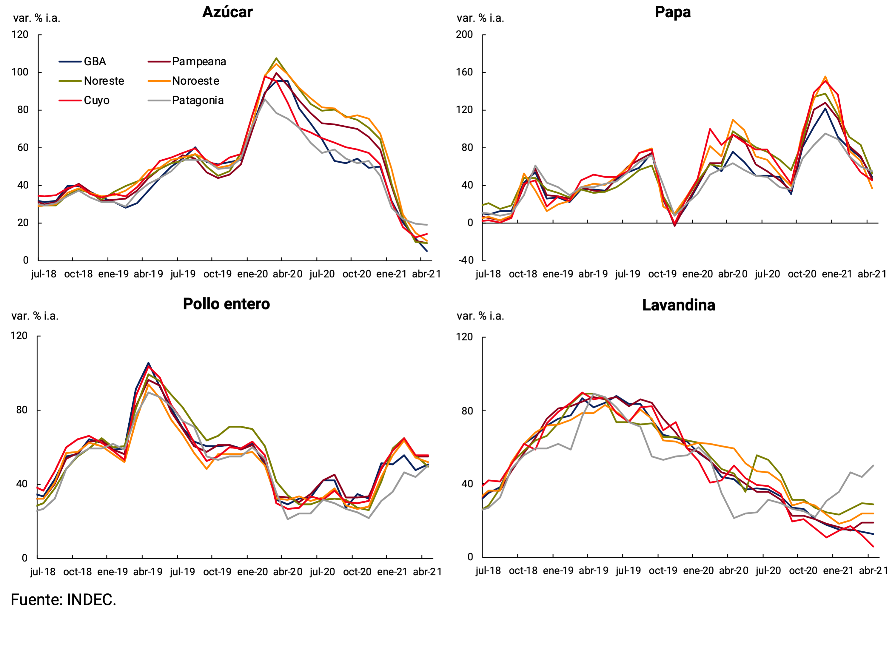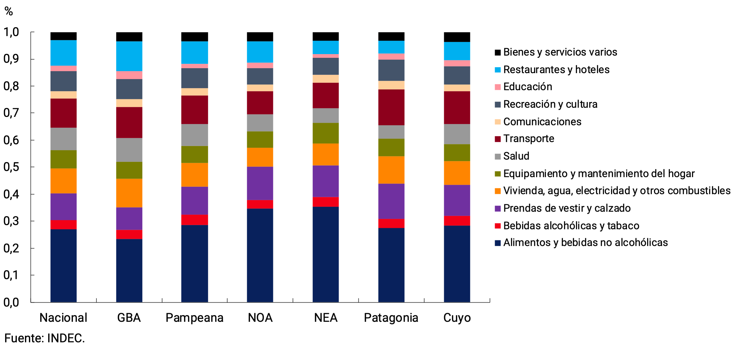 El Índice de Precios al Consumidor (IPC) de cobertura nacional elaborado por el Instituto Nacional de Estadística y Censos es un indicador representativo de la evolución de precios minoristas de la canasta de consumo de los hogares en todo el país. Para su elaboración se relevan precios en 39 aglomerados urbanos que comprenden la Ciudad Autónoma de Buenos Aires (CABA) y 24 partidos del conurbano bonaerense —que conforman el Gran Buenos Aires (GBA)—, todas las capitales provinciales y otras localidades de mayor población. Esta información se agrupa en 6 regiones: GBA, Pampeana, Noroeste Argentino (NOA), Noreste Argentino (NEA), Cuyo y Patagonia. Desde el punto de vista técnico, el IPC se construye mediante un promedio ponderado de índices regionales, que participan en el IPC de cobertura nacional según la importancia del gasto urbano de la región en el gasto total urbano a nivel nacional . La región del GBA y la Pampeana tienen el mayor peso en el indicador nacional, concentrando casi el 80% del gasto total de los hogares urbanos .