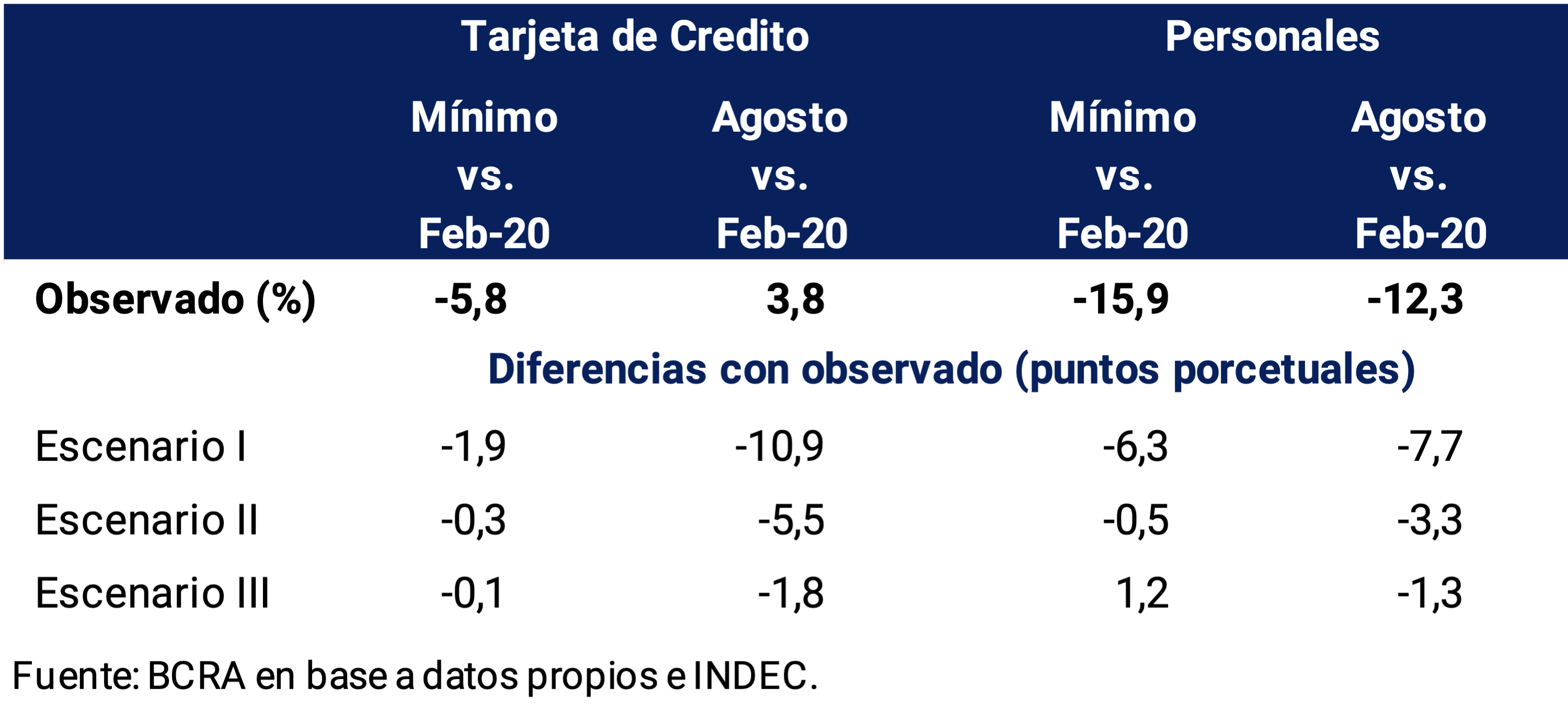 La segunda columna realiza una comparación similar, pero tomando como referencia el mes de agosto de 2020; que como se observa en el Gráfico 1, es el mes donde estos préstamos comienzan a estabilizarse luego de revertir el mínimo de mayo (y además es el mes a partir del cual se estabilizaron las tasas de interés). En agosto los créditos con tarjeta se habían recuperado por encima del nivel de febrero, siendo un 3,8% mayores que en ese mes. Sin embargo, de los resultados del Escenario I se desprende que, si las tasas no hubiesen disminuido, los créditos en agosto habrían estado en un nivel casi 11 p.p. por debajo del observado en ese mismo mes (equivalente a 7% menos que en febrero). En otras palabras, si bien la recuperación de la actividad que comenzó a partir de mayo podría dar cuenta de un incremento de los préstamos, este efecto es relativamente marginal. Si consideramos el Escenario II, esa diferencia se acorta a la mitad. Y si además consideramos los cambios en los parámetros (influidos en parte por el conjunto de políticas económicas, como se mencionó anteriormente) la diferencia con el observado es de sólo 1,8 p.p. (esto es, en agosto el nivel de crédito por tarjeta hubiese sido 2% mayor al de febrero)57. Así, la dinámica de las tasas no solo contribuyó a acotar la caída máxima de estos préstamos, sino que resultó también fundamental para la recuperación posterior.
