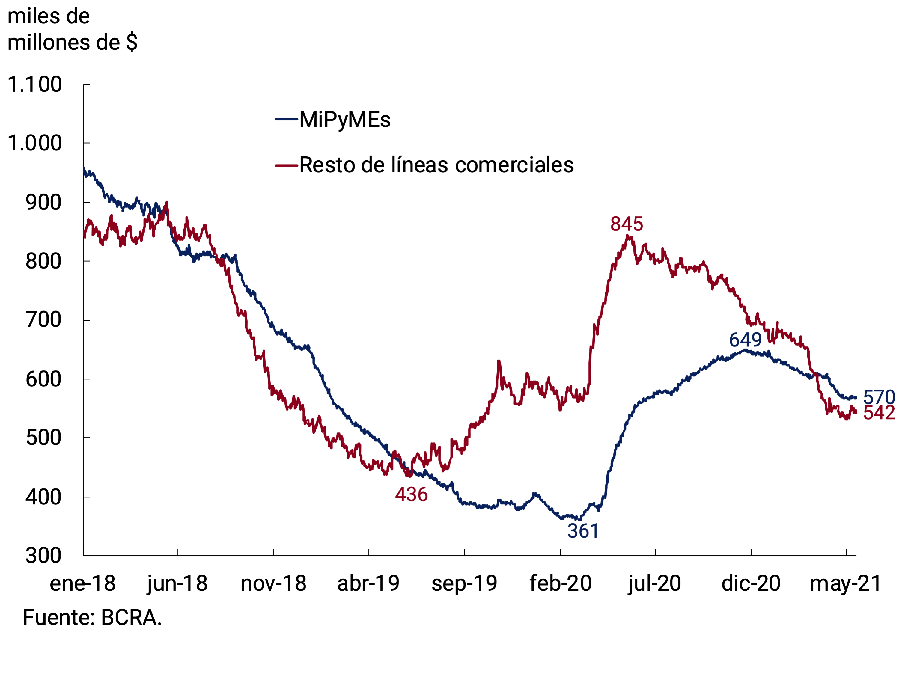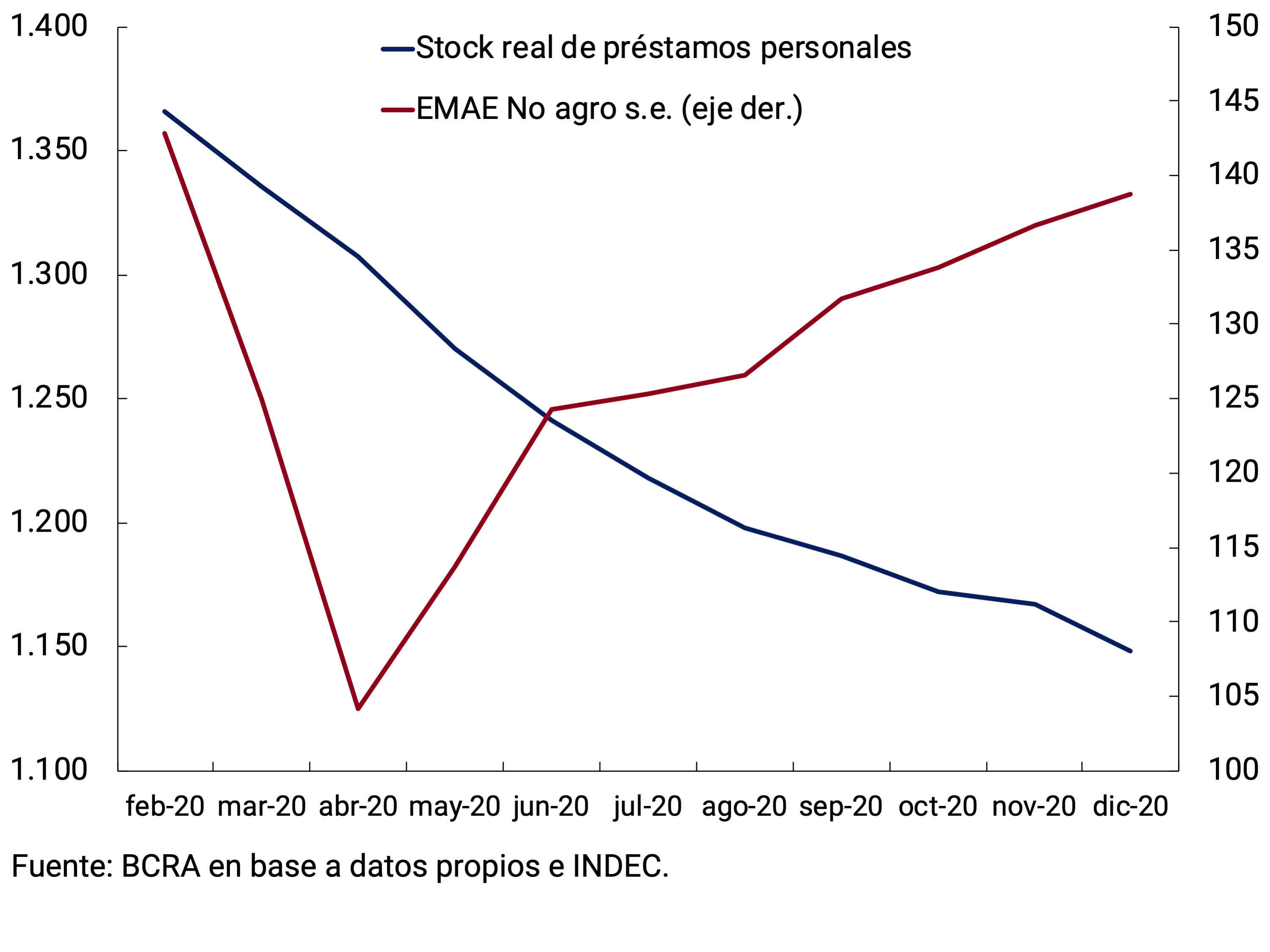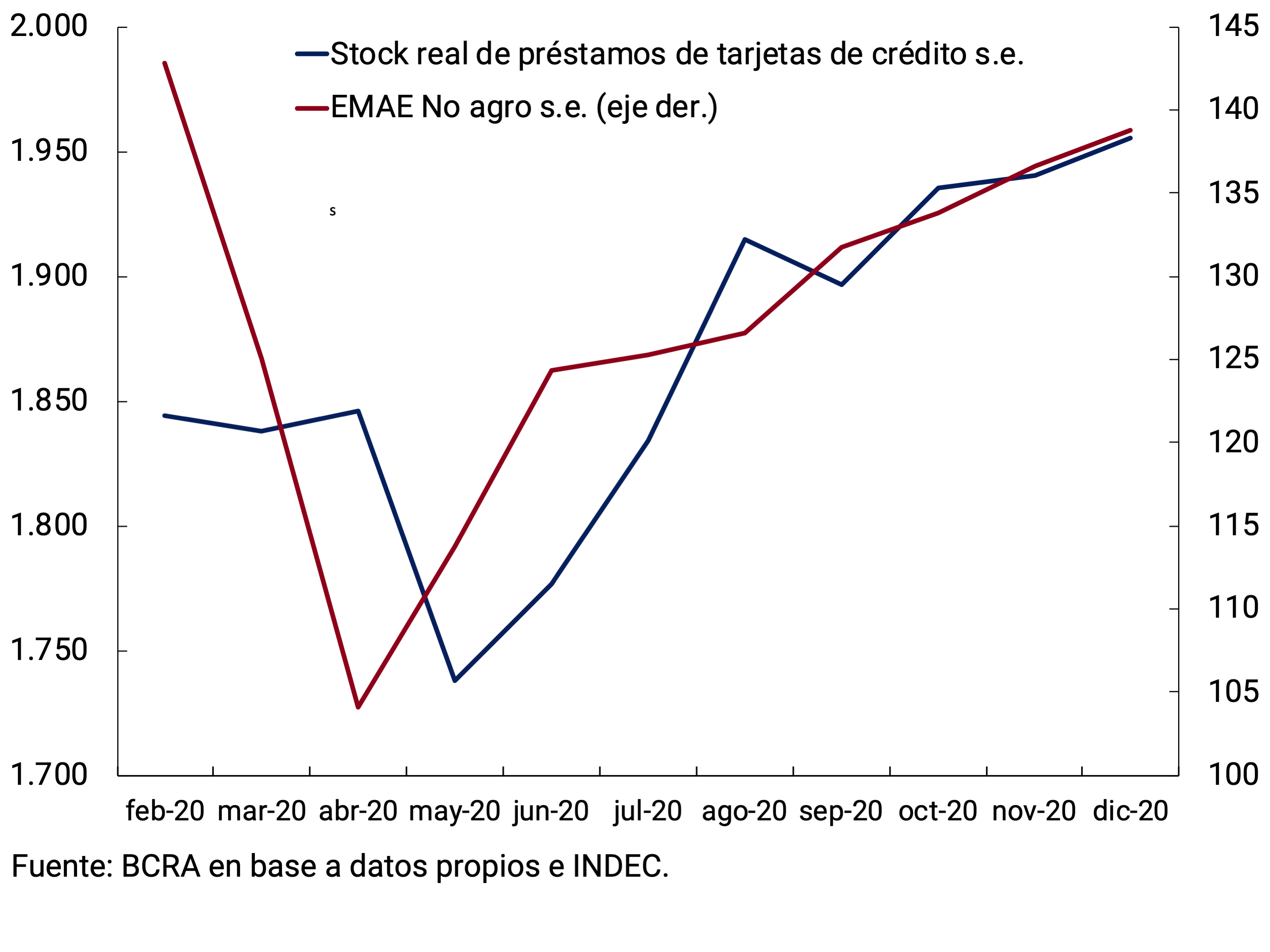 En ese contexto de normalización de la economía, el BCRA continuó contribuyendo al proceso de recuperación económica a través del sostenimiento de líneas de crédito tanto para fines productivos como de fomento al consumo privado18 (ver Capítulo 7. Política Monetaria). En igual sentido contribuyeron las recientes medidas implementadas por el Gobierno Nacional orientadas a la promoción de sectores estratégicos19.