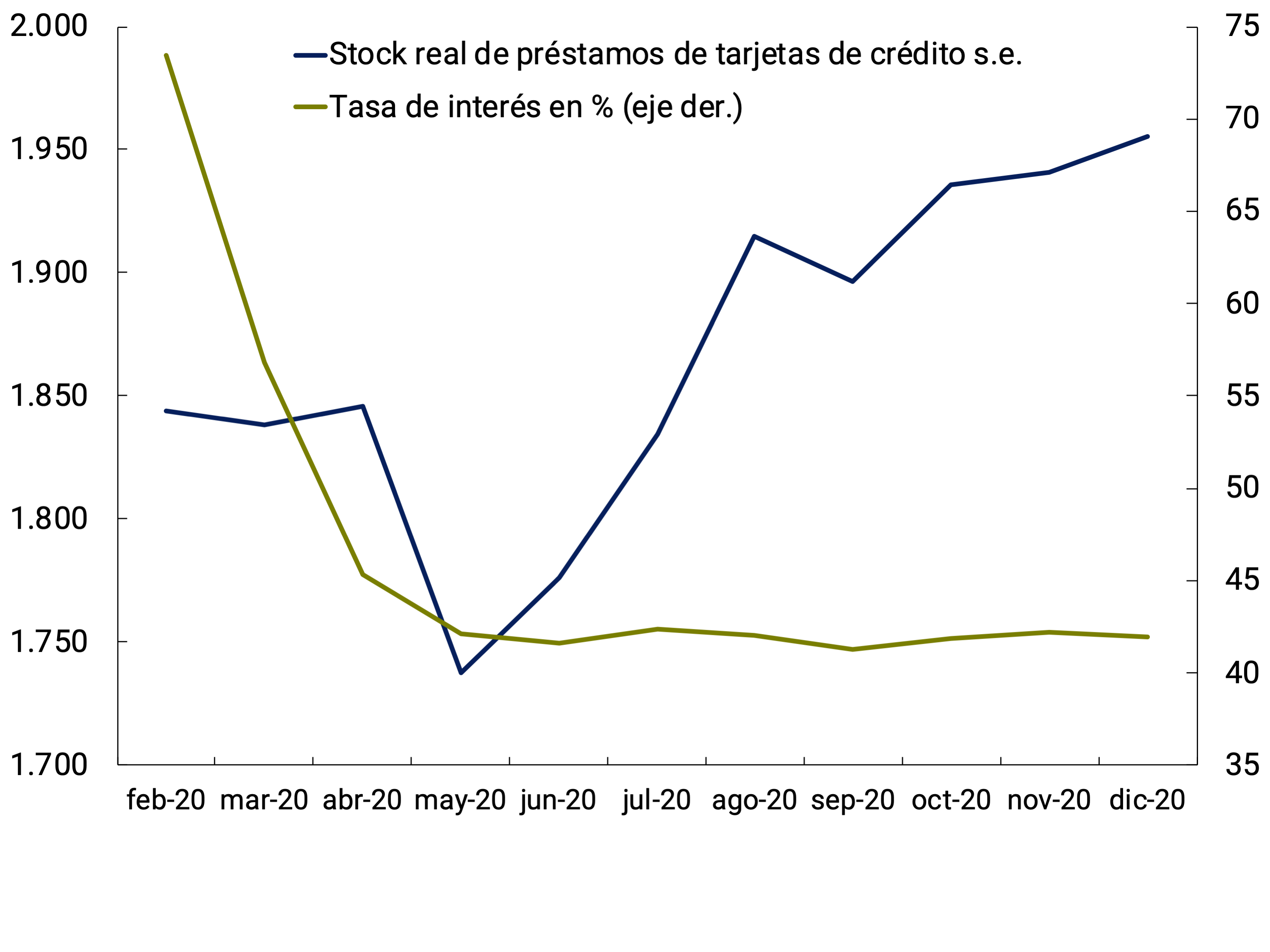 54 A partir de Mayo 2020 la serie de préstamos de tarjeta de crédito incluye las financiaciones en pesos “Crédito a Tasa Cero” previstas en el Decreto N° 332/2020 (y modificatorios). Éstas, según la omunicación A6993/2020C del BCRA deberán ser acreditadas en la tarjeta de crédito –emitida por la entidad– del solicitante de la financiación, a todos los clientes que las soliciten. Para realizar el análisis, se excluyeron estos montos otorgados del stock total ya que, aun siendo contabilizados dentro de la categoría tarjeta de crédito, no son comparables con los que habitualmente se incluyen en ese grupo. Por ejemplo, en el mes de Agosto de 2020 éstos representaban más del 7% del stock total de préstamos por tarjeta de crédito. De la misma manera, la series de tasa de interés de tarjeta de crédito se construye como un promedio ponderado de las tasas correspondientes solo a préstamos con tasa positiva.