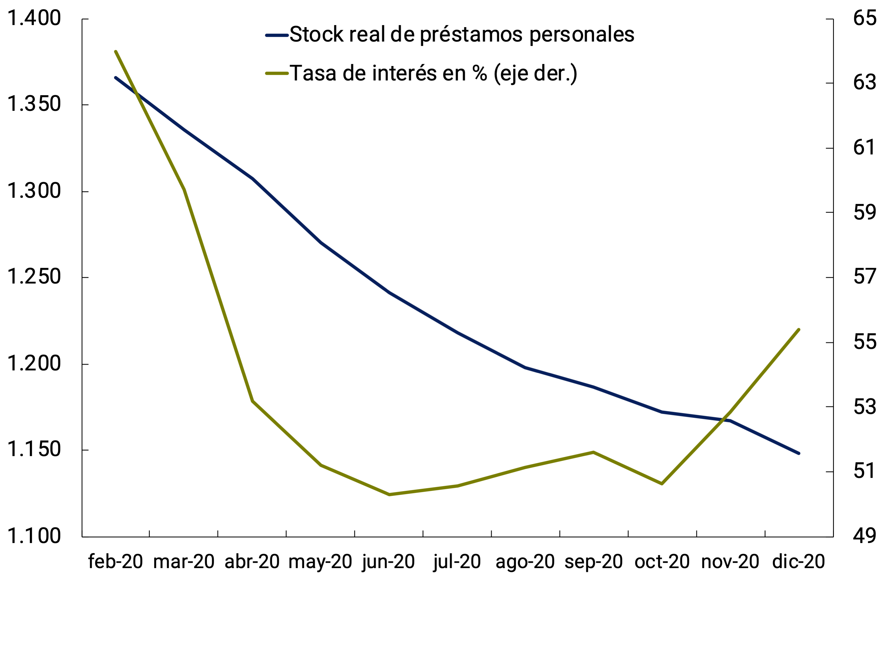 Ante shocks contractivos como el experimentado a partir de marzo de 2020 producto de la pandemia de COVID-19, las personas intentan recurrir al crédito para suavizar parte de los efectos negativos sobre sus ingresos. En esos contextos, la implementación por parte del Banco Central de políticas que reducen las tasas de interés e impulsan la oferta de crédito resultan fundamentales para que el sistema financiero cumpla un rol contracíclico. En este apartado se intenta cuantificar el efecto de la reducción de tasas de interés en los préstamos más directamente relacionados con el consumo: los de tarjeta de crédito y los personales.