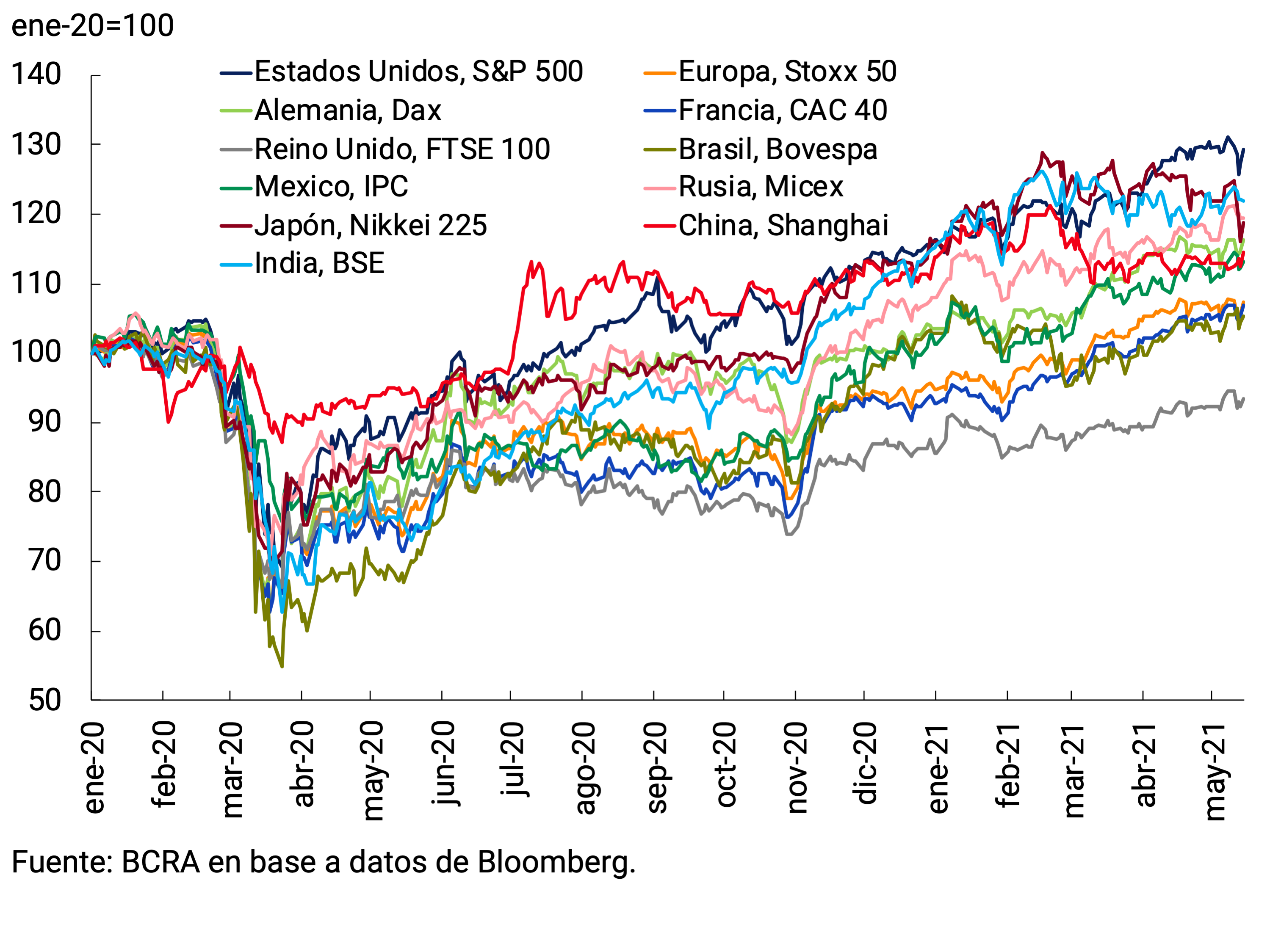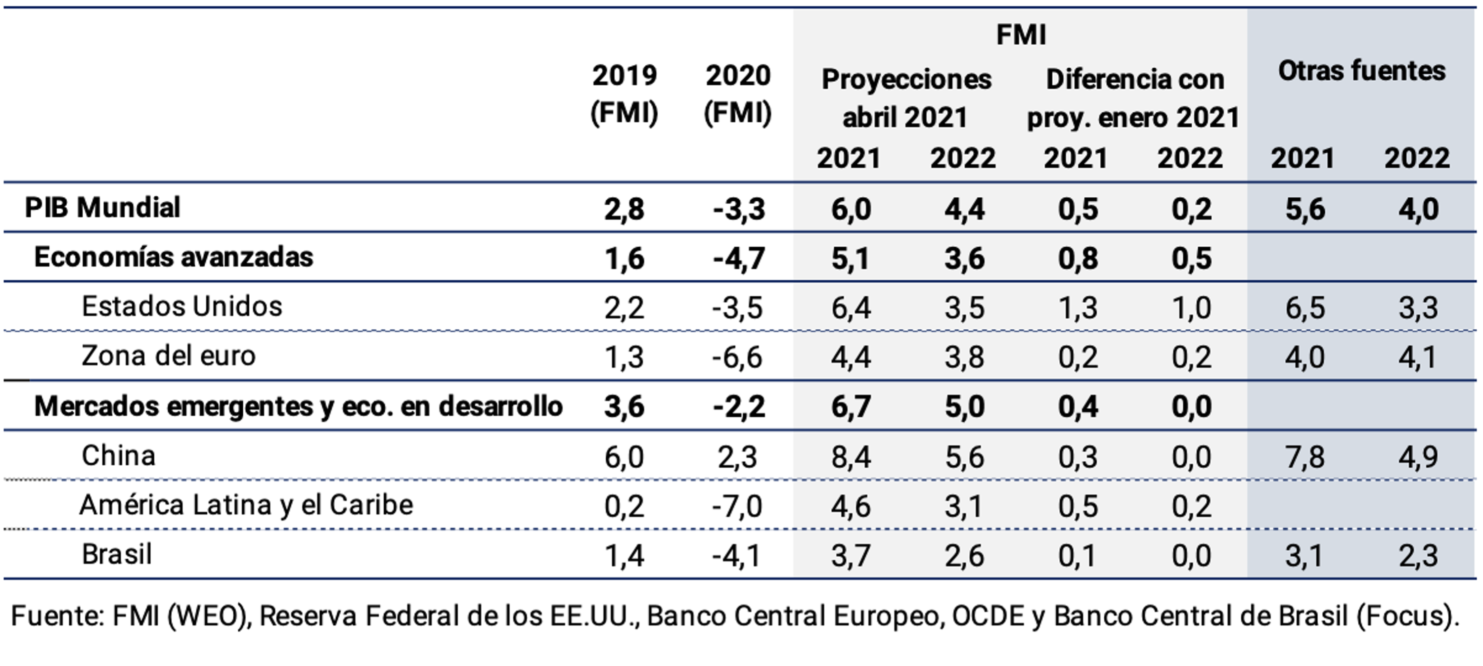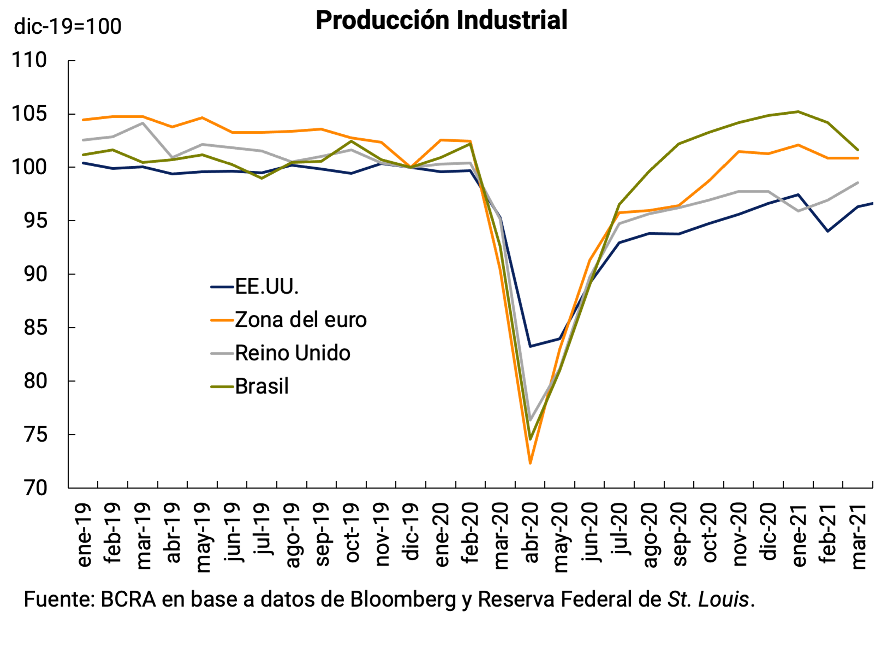 La recuperación económica global prosigue, pero a ritmo incierto y heterogéneo. Durante el primer trimestre de 2021 la actividad mostró aún el impacto de los rebrotes en muchos países: el crecimiento se aceleró en Estados Unidos, se desaceleró en China y el PIB se contrajo en la zona del euro y Brasil (por mencionar a los principales socios comerciales de la Argentina). A medida que avance la vacunación y se implementen políticas monetarias y fiscales expansivas —como las anunciadas recientemente en Estados Unidos—, la recuperación tomará nuevo impulso. Esto se refleja en las expectativas y las revisiones al alza de los pronósticos de crecimiento, con el FMI previendo un crecimiento global de 6% este año.