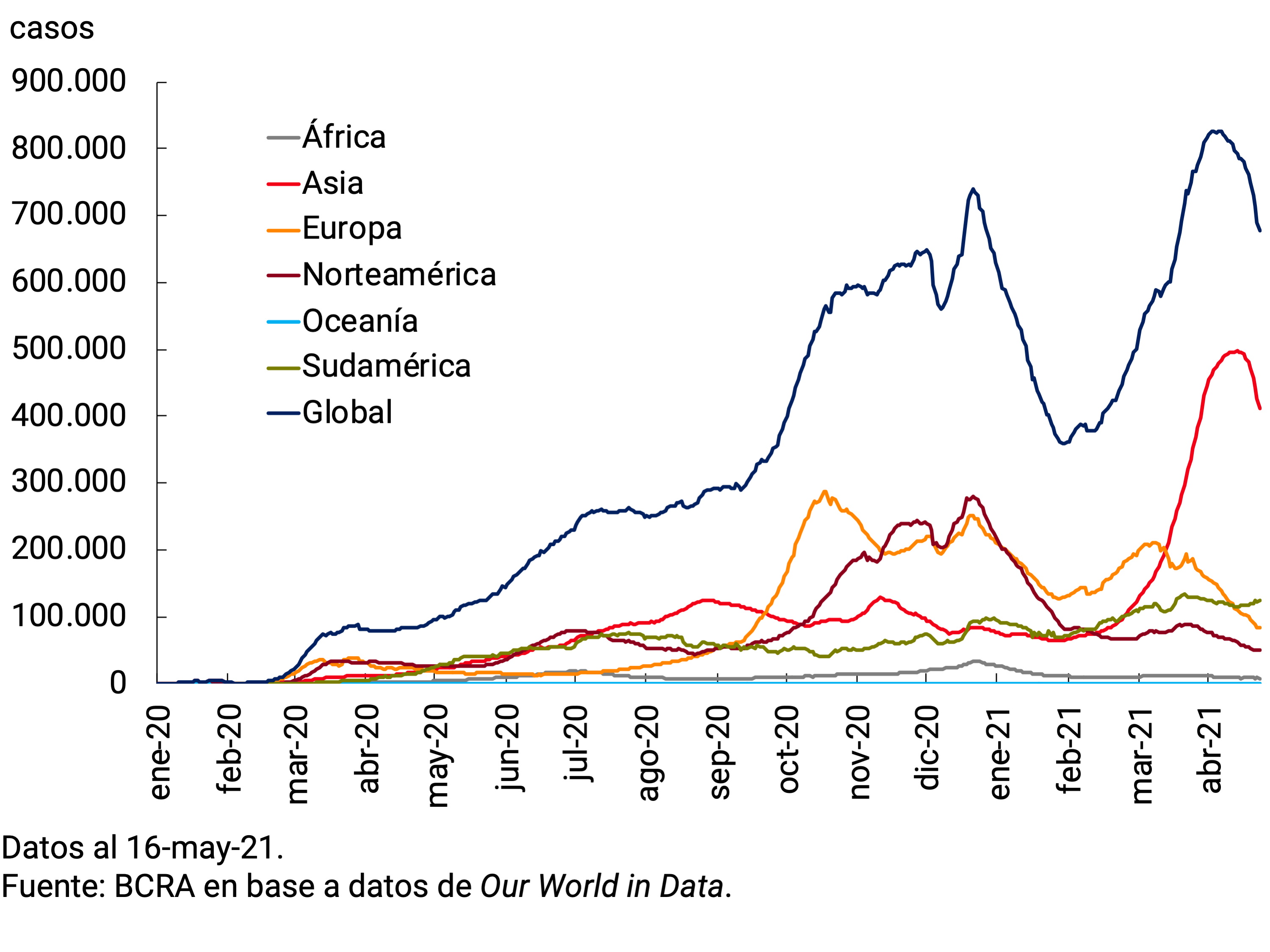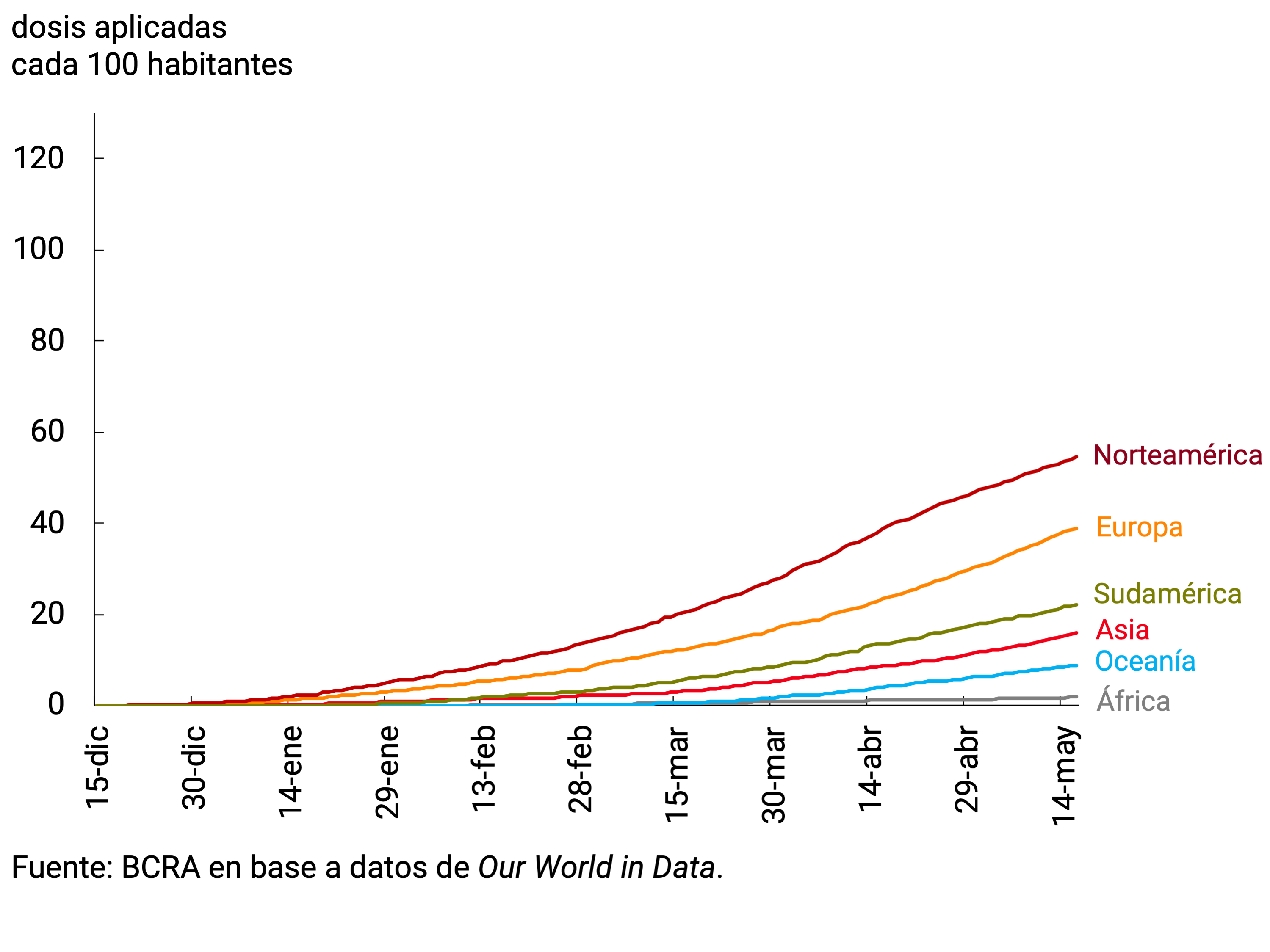 Desde el IPOM anterior, se volvió a intensificar el ritmo global de contagios de COVID-19, con el foco de la pandemia desplazándose primero a Latinoamérica (principalmente Brasil) y luego a India. A inicios de mayo de 2021, los casos registrados alcanzaban su máximo desde el comienzo de la crisis sanitaria (más 5,7 millones semanales). La vacunación avanza a un ritmo lento y con marcadas diferencias entre países de altos y bajos ingresos.