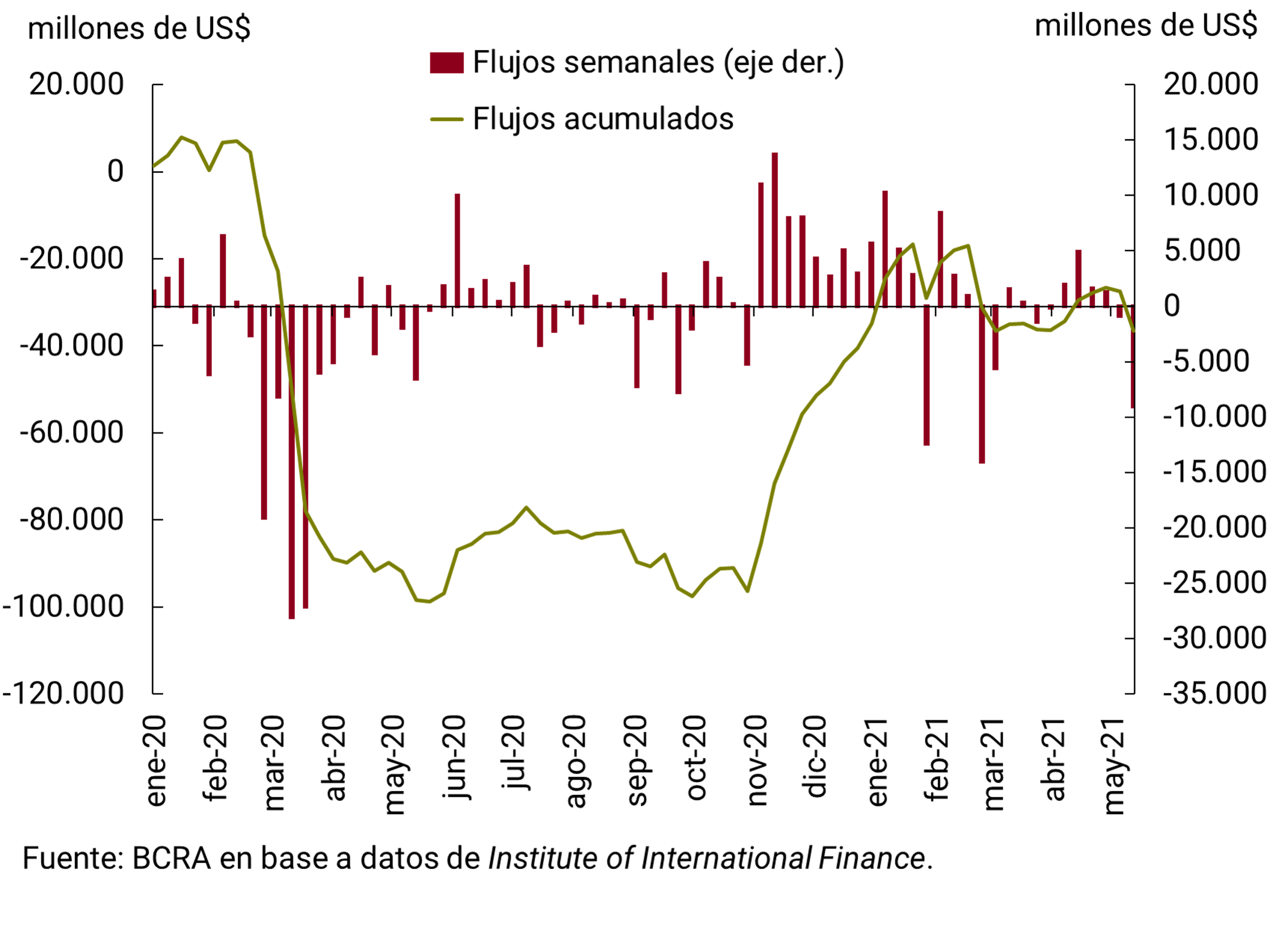Los flujos de capitales hacia países emergentes fueron negativos en US$18 mil millones desde el cierre del IPOM anterior, aunque acumulan una entrada neta de US$4 mil millones en el año, no habiéndose recuperado totalmente desde la fuerte salida que se dio a comienzos de la pandemia (ver Gráfico 2.10b). Los episodios de salidas de capitales de fines de febrero y de fines de marzo de este año se dieron a la par de subas de tasas en los Estados Unidos. Estos eventos afectan especialmente a los países en desarrollo.
