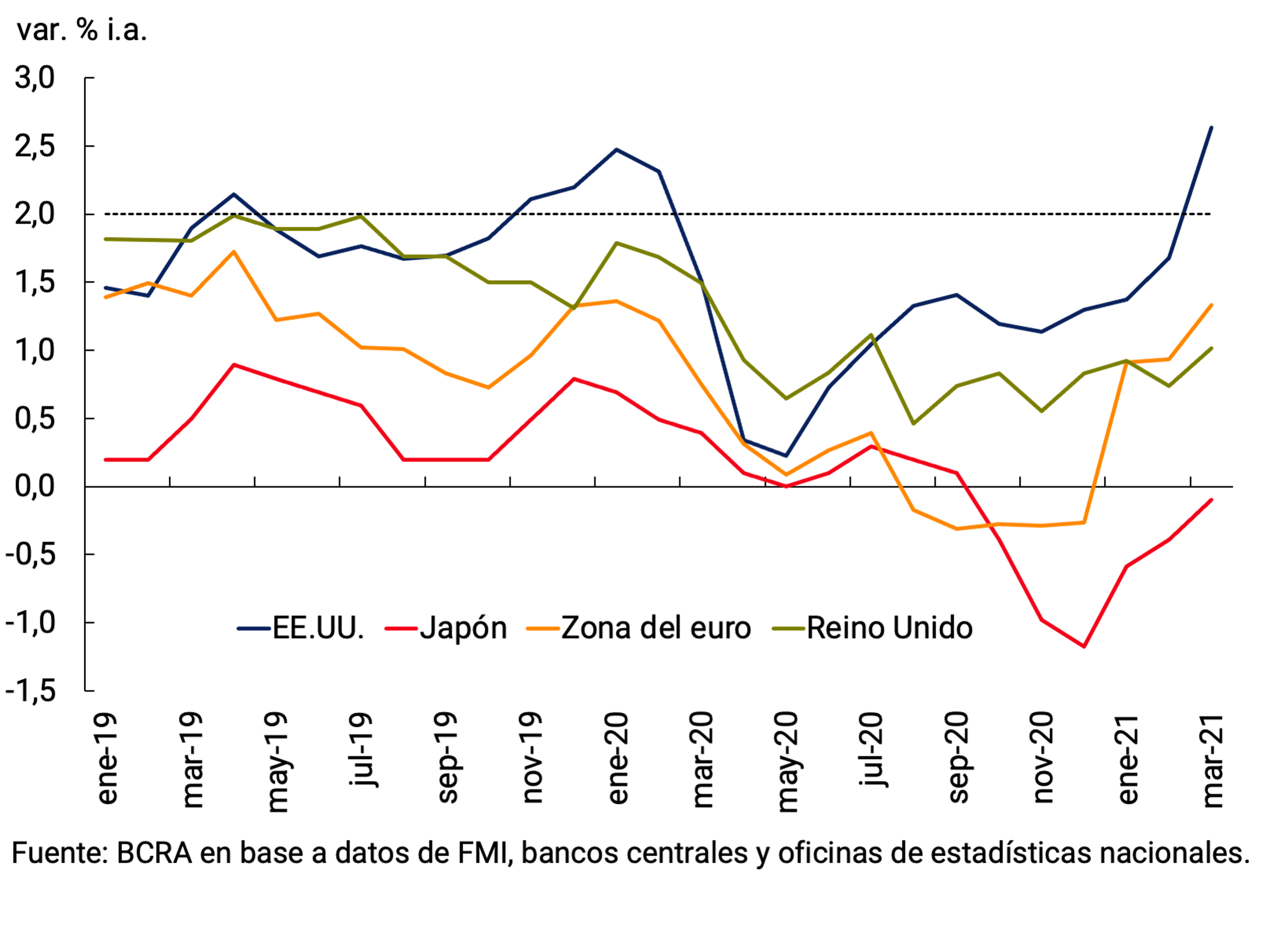 Por su parte, las autoridades de la Reserva Federal de los Estados Unidos (Fed) señalaron en varias ocasiones que sostendrán el sesgo expansivo de su política monetaria, no previendo un alza de tasas de interés hasta 2024; sin embargo, algunos analistas esperan tal acción en 2023. La razón que motivó esta proyección de los analistas es que la mejoría de la economía de los Estados Unidos está siendo más rápida de lo previsto, en parte debido al paquete de estímulo fiscal recientemente aprobado. La Fed mejoró sus propias proyecciones para la economía, pronosticando un crecimiento para este año de 6,5% (comparado con 4,2% de su proyección anterior en diciembre), el mayor aumento del PIB desde 1984. Las proyecciones respecto del desempleo son de 4,5% para fin de año (respecto de la proyección anterior de 5%). En cuanto a la inflación, la Fed predice para el deflactor del gasto de los hogares subyacente un aumento para 2021 de 2,2% (contra 1,8% proyectado en diciembre pasado; 2,4% para el nivel general) y por encima de la meta de 2%.