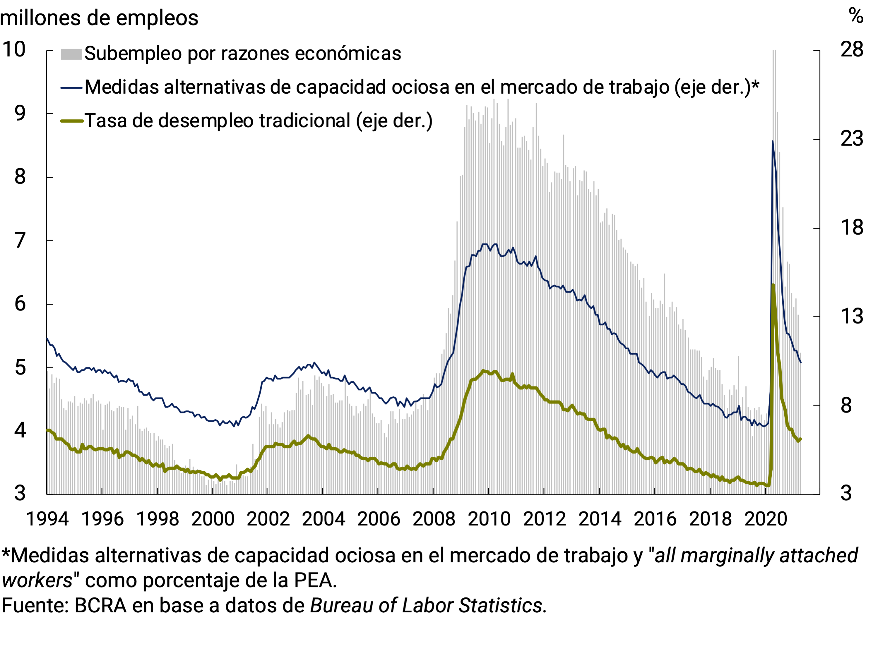 Varios factores explicarían por qué, a pesar de estas mejores proyecciones, la Fed no aumenta el objetivo sobre la tasa de interés de fondos federales. En primer lugar, de sus propias proyecciones surge que esperan que la mayor inflación sea sólo temporal, puesto que proyectan una inflación de 2% para 2022 y de 2,1% para 2023. Además, la Fed tiene un mandato dual: estabilidad y máximo empleo. En este sentido, los indicadores del mercado laboral, especialmente las medidas más amplias de desempleo y las de subempleo, aún están lejos de los valores prepandemia (ver Gráfico 2.12).