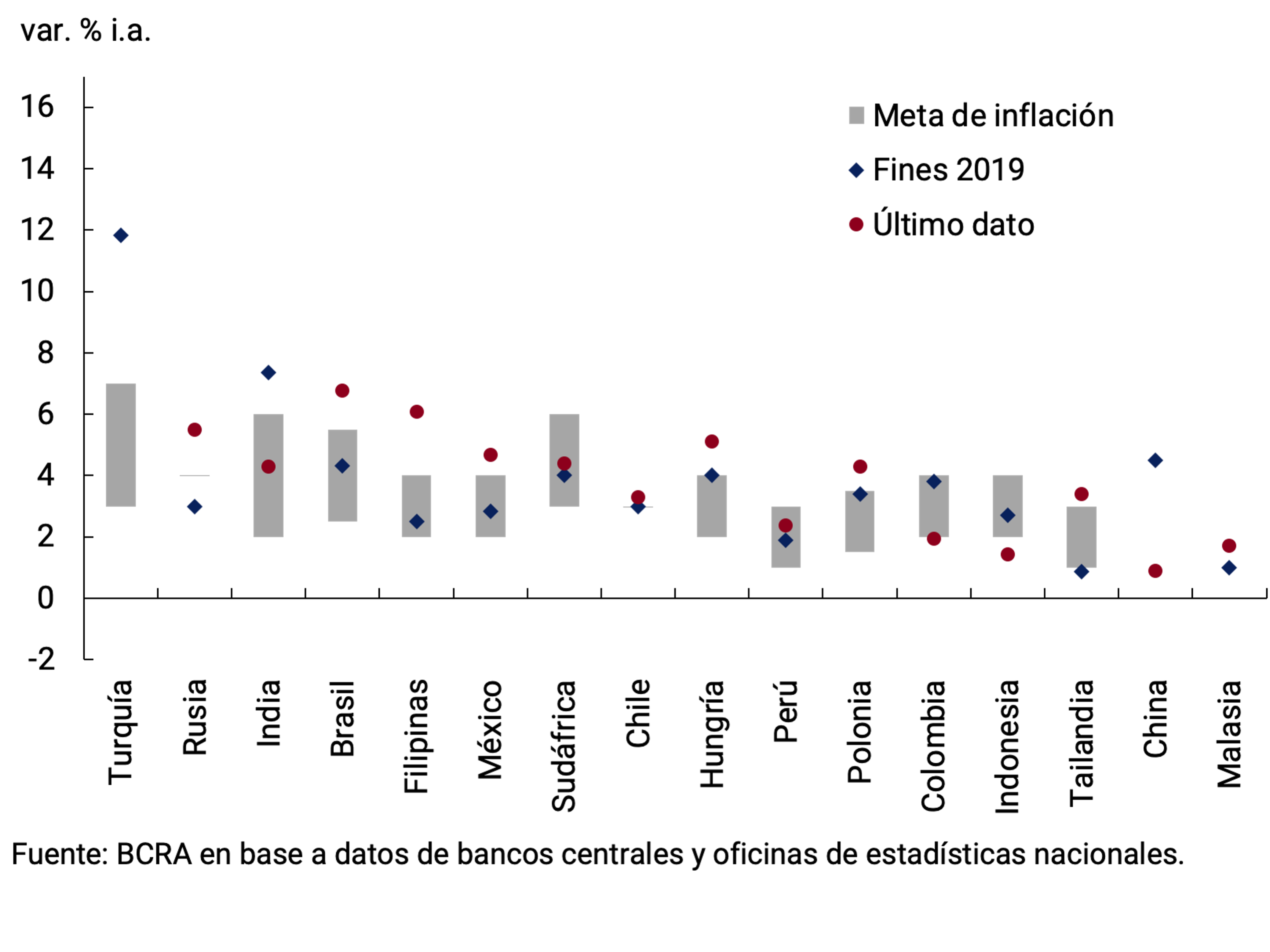 Algunos países emergentes empiezan a enfrentar un espacio más limitado de política monetaria: registran mayor inflación (ver Gráfico 2.13a), acusando el impacto de fuertes depreciaciones de sus monedas y/o mayores precios de las materias primas. Así, subieron las tasas de interés de política monetaria en Turquía, Rusia y Brasil (ver Gráfico 2.13b). A su vez, analistas del sector privado prevén medidas contractivas de la autoridad monetaria de Chile para fin de año.