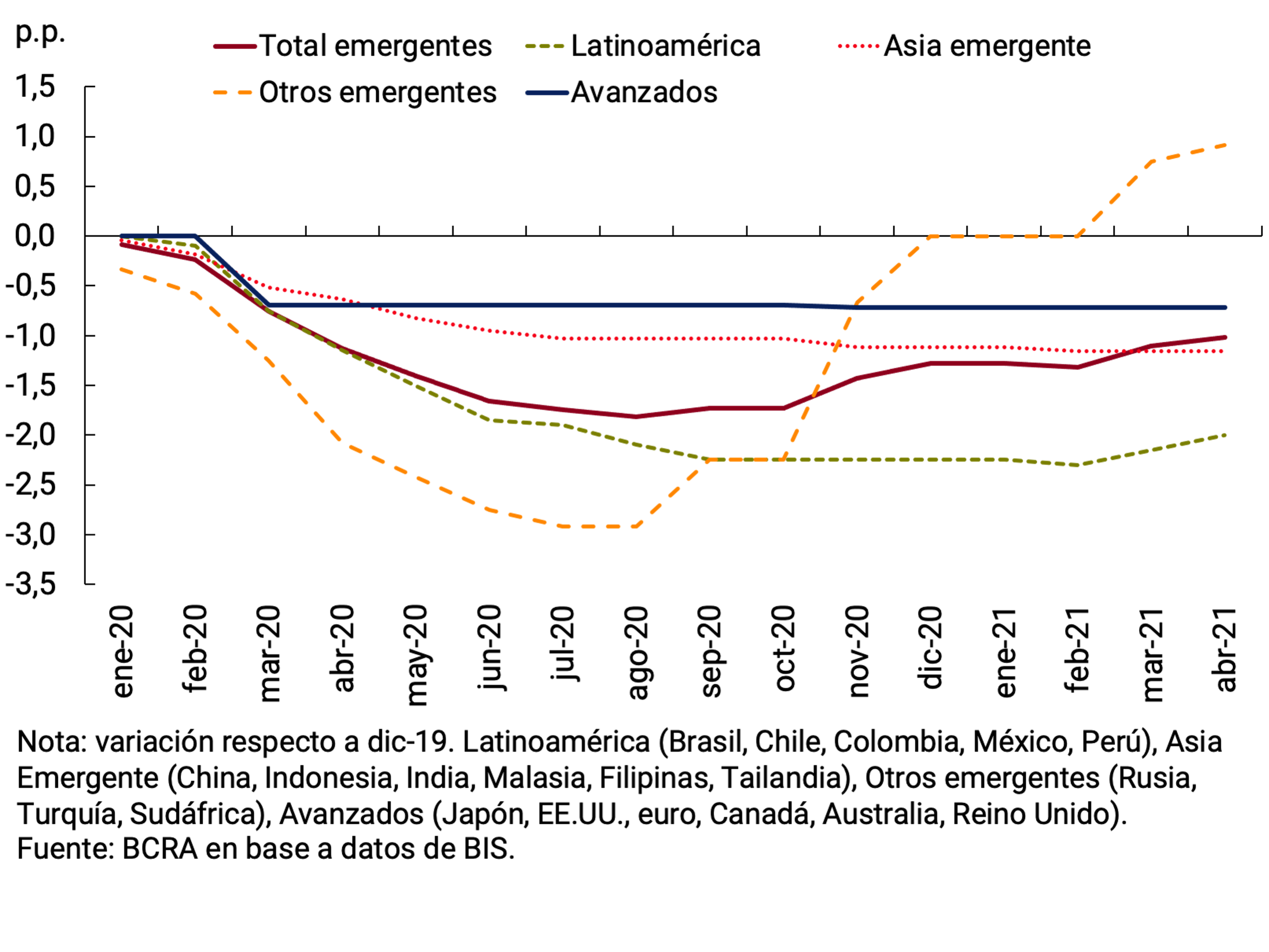 Los bancos centrales de países avanzados mantuvieron su ritmo de compra de activos, con la inflación manteniéndose dentro de su rango de tolerancia (ver Gráfico 2.11). Algunas excepciones fueron el Banco Central Europeo, el de Canadá, y el de Suecia. El primero incrementó desde mediados de marzo el ritmo semanal de su compra de activos para evitar un empinamiento de la curva de rendimientos de los bonos soberanos de la región, que podría afectar el nivel de actividad. Por su parte, el Banco Central de Canadá anunció una reducción de las compras semanales de activos tras mejorar la proyección de crecimiento de la economía canadiense en 2021 en 2,5 p.p. (de 4% a 6,5%), siendo de esta manera el primer país del G7 en comenzar a revertir sus políticas monetarias no convencionales. También la autoridad monetaria de Suecia decidió reducir su programa de compra de activos desde el tercer trimestre de 2021, debido a una recuperación del nivel de actividad mayor a la esperada.