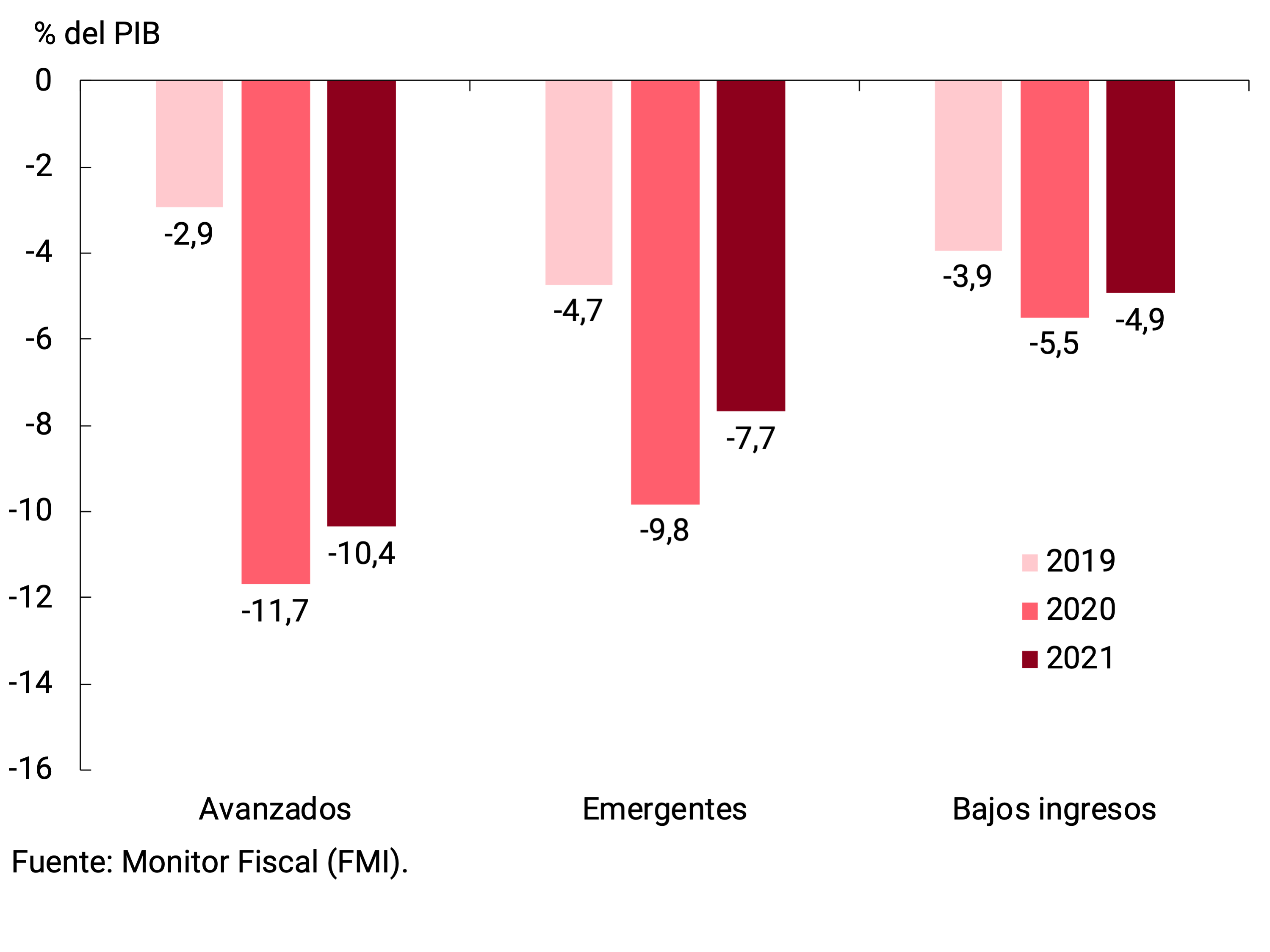 Luego de las fuertes subas de los déficits fiscales registradas durante 2020 como consecuencia de la respuesta a la pandemia, para este año el organismo internacional prevé que la mayoría de los países experimenten desequilibrios menores en sus cuentas públicas a medida que los ingresos tributarios aumenten y algunos gastos disminuyan automáticamente con la recuperación y vayan expirando las medidas relacionadas con la pandemia (ver Gráfico 2.14a).