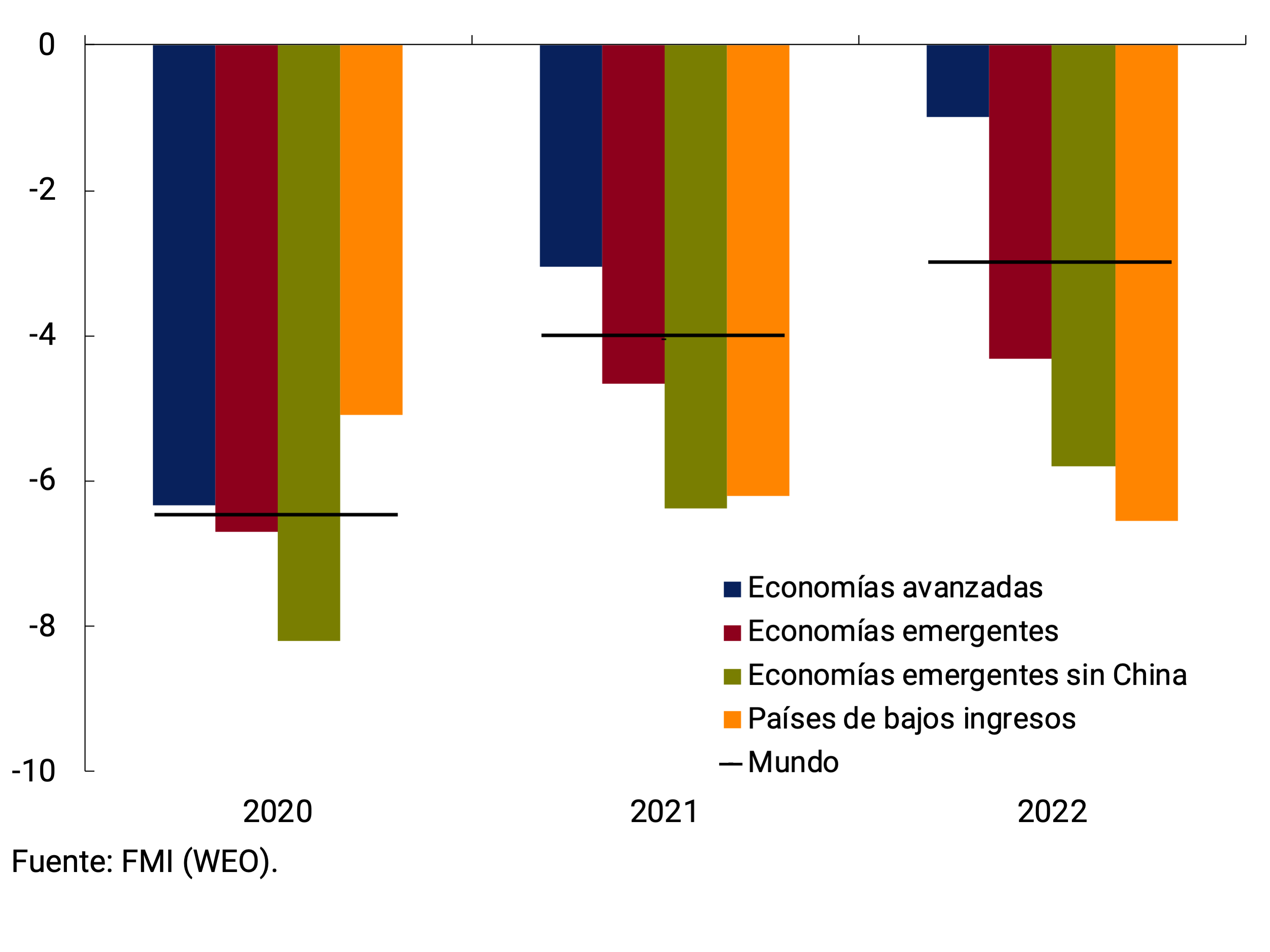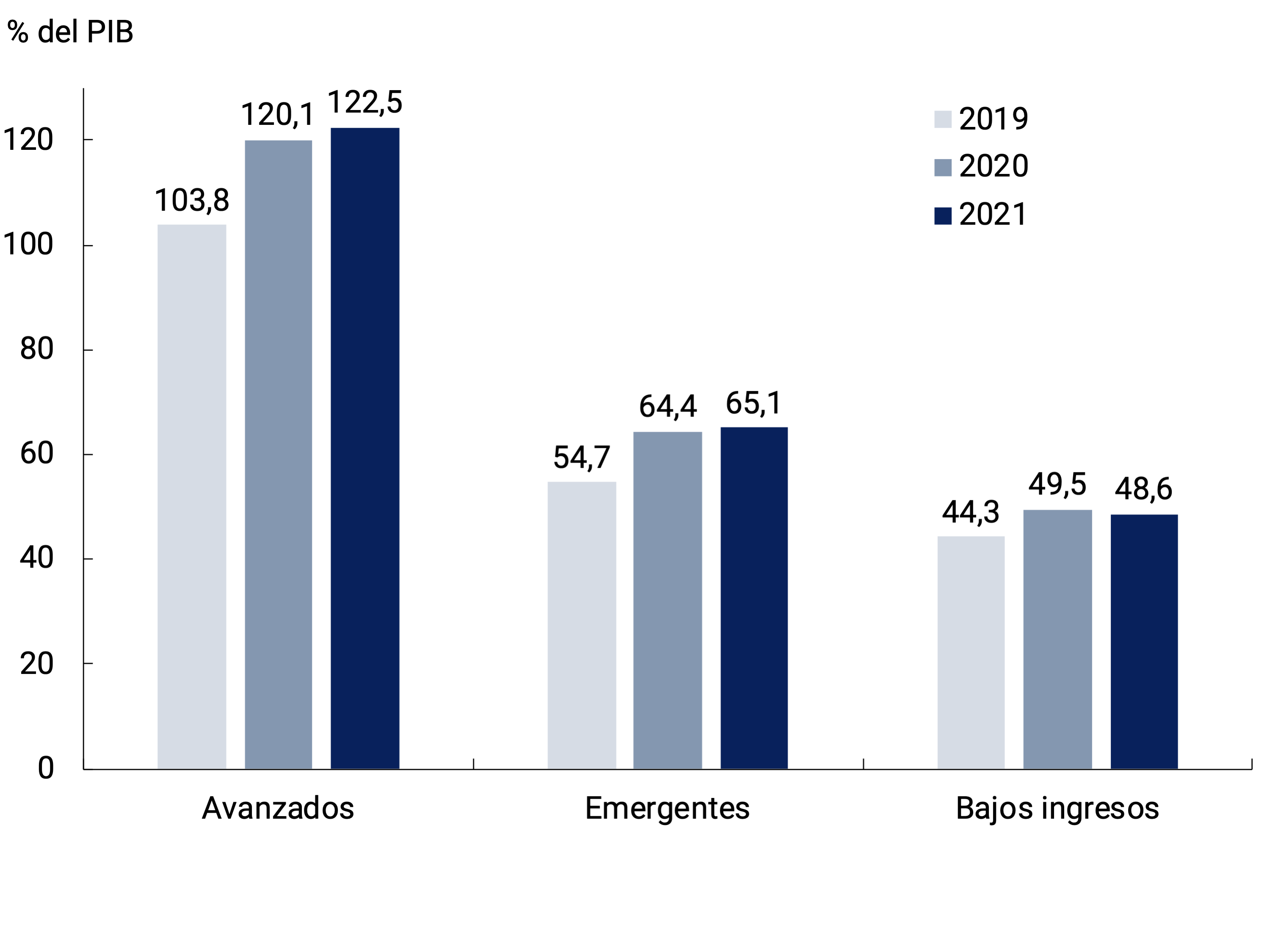 A pesar del aumento del peso de la deuda, los pagos de intereses se han mantenido acotados, en general, dados los bajos niveles de tasa de interés impulsados por las políticas monetarias expansivas de países avanzados y de muchos emergentes. Sin embargo, para algunos países de ingresos medios y para los de bajos ingresos la financiación de grandes déficits sigue siendo un desafío, dado el acceso limitado al mercado y el escaso margen para recaudar impuestos en el corto plazo. En este contexto, tasas de interés más elevadas, particularmente en los países avanzados, presionarían sobre la dinámica de las cuentas públicas, especialmente sobre las posibilidades de acceso al financiamiento para los países emergentes y en desarrollo.