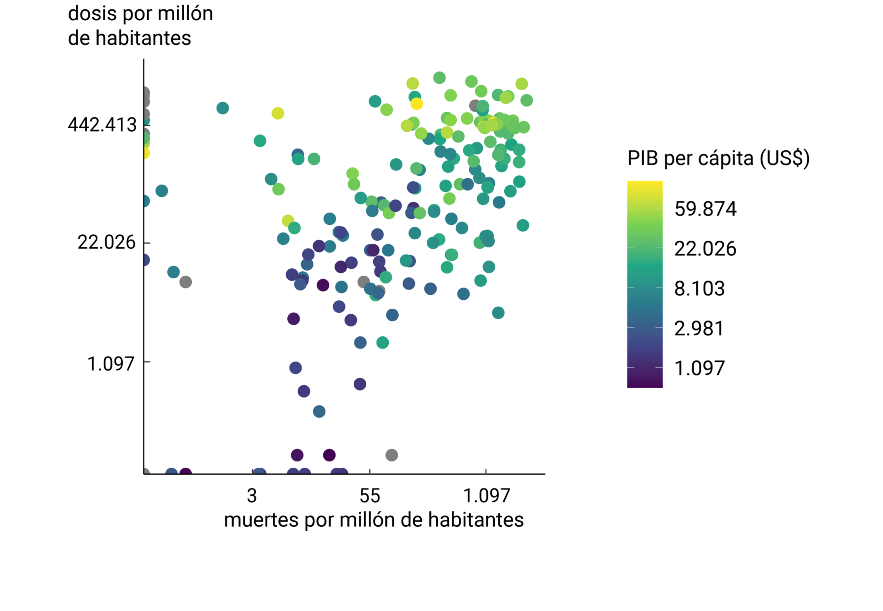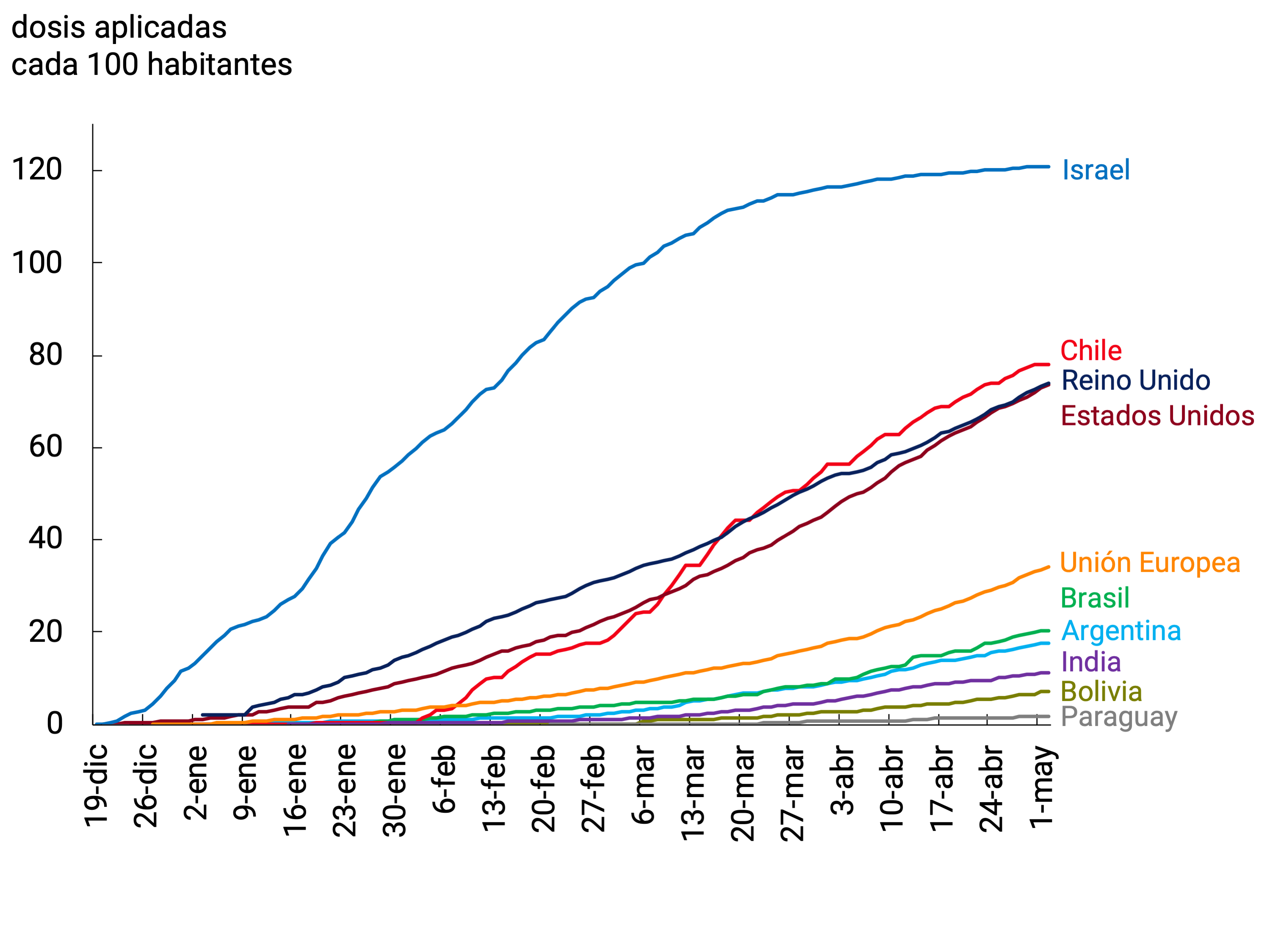 La nueva ola encontró a la mayoría de los países en etapas iniciales de las campañas de vacunación (ver Gráfico 2.2). En los últimos meses el ritmo de la vacunación aumentó: a principios de marzo se aplicaba 1 dosis cada mil habitantes en promedio por día en el mundo, y para fines de abril, algo más de 2. Los estudios sugieren que las vacunas son efectivas para prevenir, sobre todo, hospitalizaciones y muertes. Si bien las nuevas variantes podrían ser más hábiles en evadir el sistema inmune, la evidencia disponible también indica que algunas vacunas siguen siendo efectivas contra las variantes del Reino Unido y de Manaos.