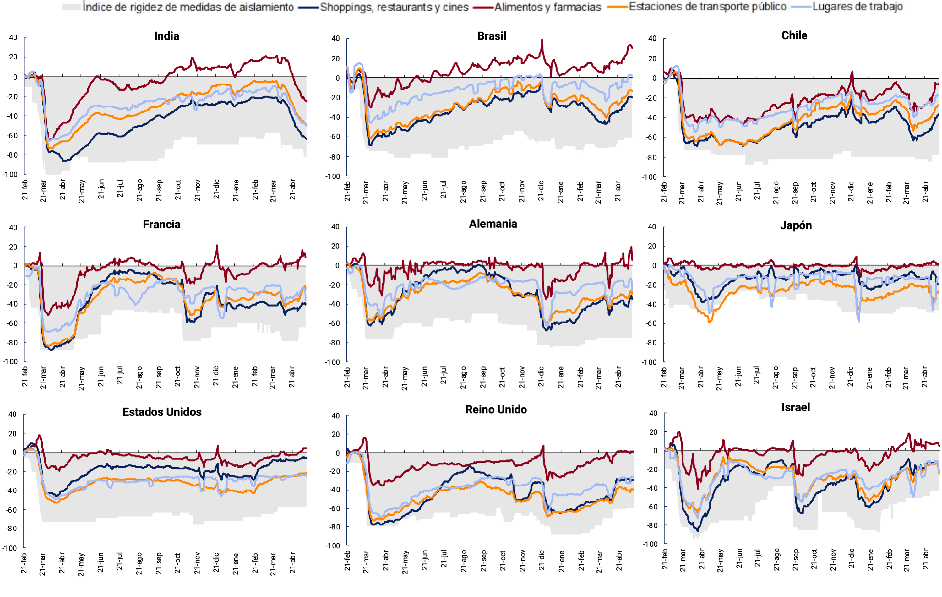 La desigual dinámica de la vacunación y el traslado del epicentro de la pandemia se traducen en tendencias divergentes de los índices de movilidad entre los países. Israel, el Reino Unido y Estados Unidos redujeron notablemente las restricciones gracias al avance de las campañas de vacunación y la baja de casos. En cambio, en India las restricciones se endurecieron a partir de la exponencial suba de casos (ver Gráfico 2.4), y lo mismo sucedió en Brasil, Chile y algunos países europeos; aunque en estos últimos la movilidad volvió a subir en las últimas semanas.