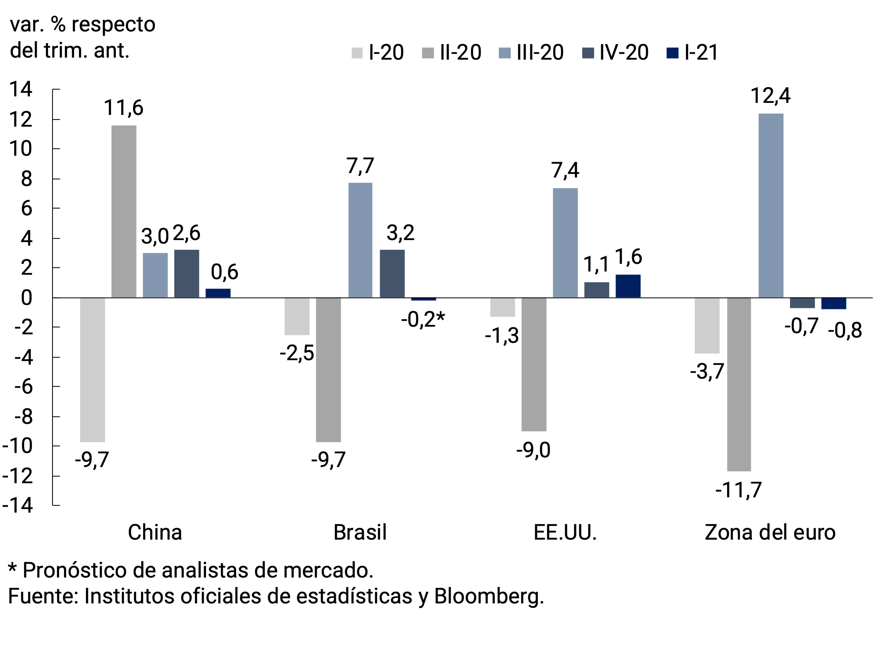 Tras la fuerte recuperación del nivel de actividad del tercer trimestre de 2020 y la desaceleración del trimestre siguiente, la actividad mostró aún el impacto dispar de los rebrotes en muchos países durante el primer trimestre de 2021. En el primer trimestre del año, en los Estados Unidos se dio un leve aumento en la tasa de crecimiento según la estimación adelantada del PIB. En cambio, el producto de China pasó de crecer 2,6% (trimestral, s.e.) en el cuarto trimestre de 2020, a 0,6% (trimestral, s.e.) en el primer trimestre de este año. Como consecuencia de la nueva ola de casos de COVID-19, el PIB de la eurozona se redujo en 0,8% (trimestral, s.e.), y el de Brasil caería según proyecciones de mercado un 0,2% (trimestral, s.e., ver Gráfico 2.5) en el primer trimestre de 2021.
