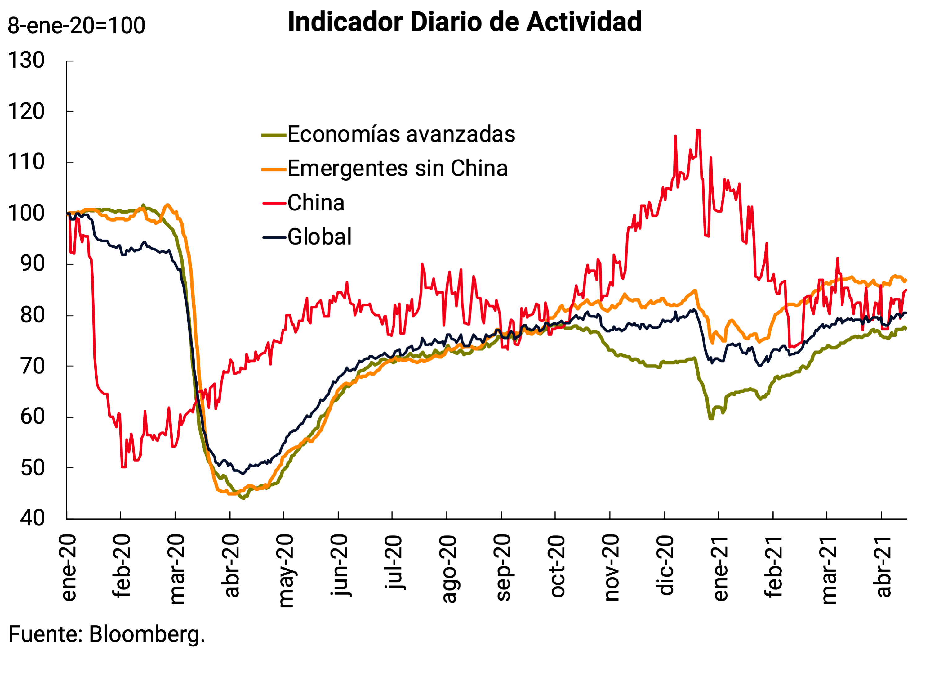 Los riesgos globales persisten: la vacunación y la capacidad de implementar políticas de apoyo son muy dispares entre países. Las economías en desarrollo pueden tardar más que las avanzadas en alcanzar los niveles de producto previos a la pandemia, creando brechas más amplias en los niveles de vida entre estos países. El incremento de las tasas de interés de largo plazo de las economías avanzadas podría inducir mayor volatilidad en los flujos de capitales hacia países emergentes, como se observó en los últimos meses. Así, el ritmo y extensión de las campañas de vacunación, la continuidad de las políticas de apoyo y la provisión efectiva de liquidez global condicionarán la intensidad de la recuperación.