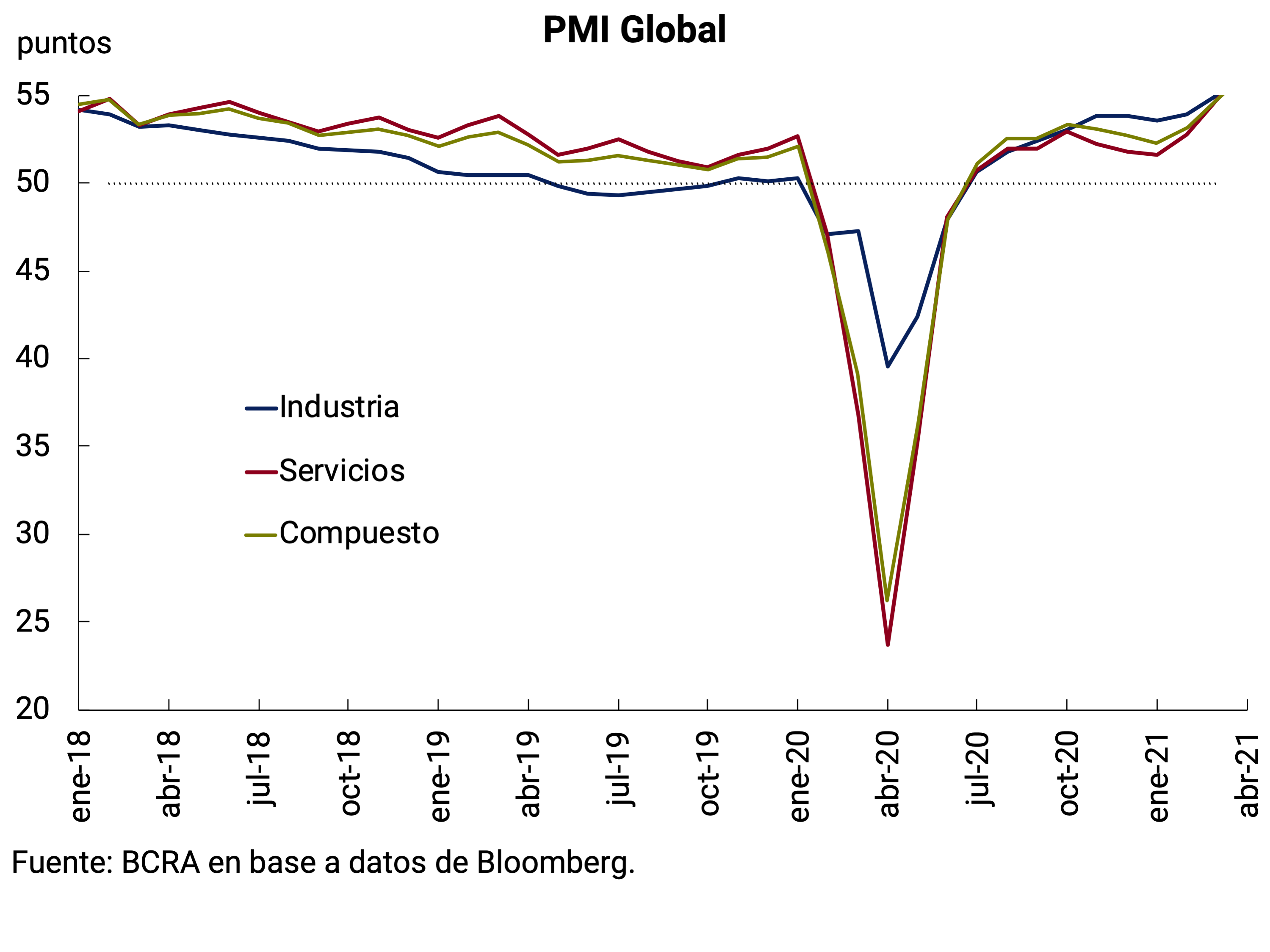 Según los datos de alta frecuencia y algunos indicadores prospectivos, el nivel de actividad global se acelera levemente desde febrero (ver Gráfico 2.6). El indicador diario de actividad de Bloomberg retomó el crecimiento a principios de ese mes. El índice de encuestas a gerentes de compras (PMI) global, que también registró una desaceleración en el cuarto trimestre, retomó un mayor ritmo de crecimiento desde febrero, sobre todo el PMI de servicios, el más relegado por el mayor impacto de la pandemia en este sector de la economía. En la zona del euro tiene un comportamiento similar, con una recuperación de la industria desde febrero y en menor medida en los servicios (cuyo índice entró en “zona de expansión” en abril). Las ventas minoristas también empiezan a recuperarse en esta región desde febrero. En los Estados Unidos, el PMI también registra un comportamiento similar, pero con una recuperación más homogénea entre industria y servicios.