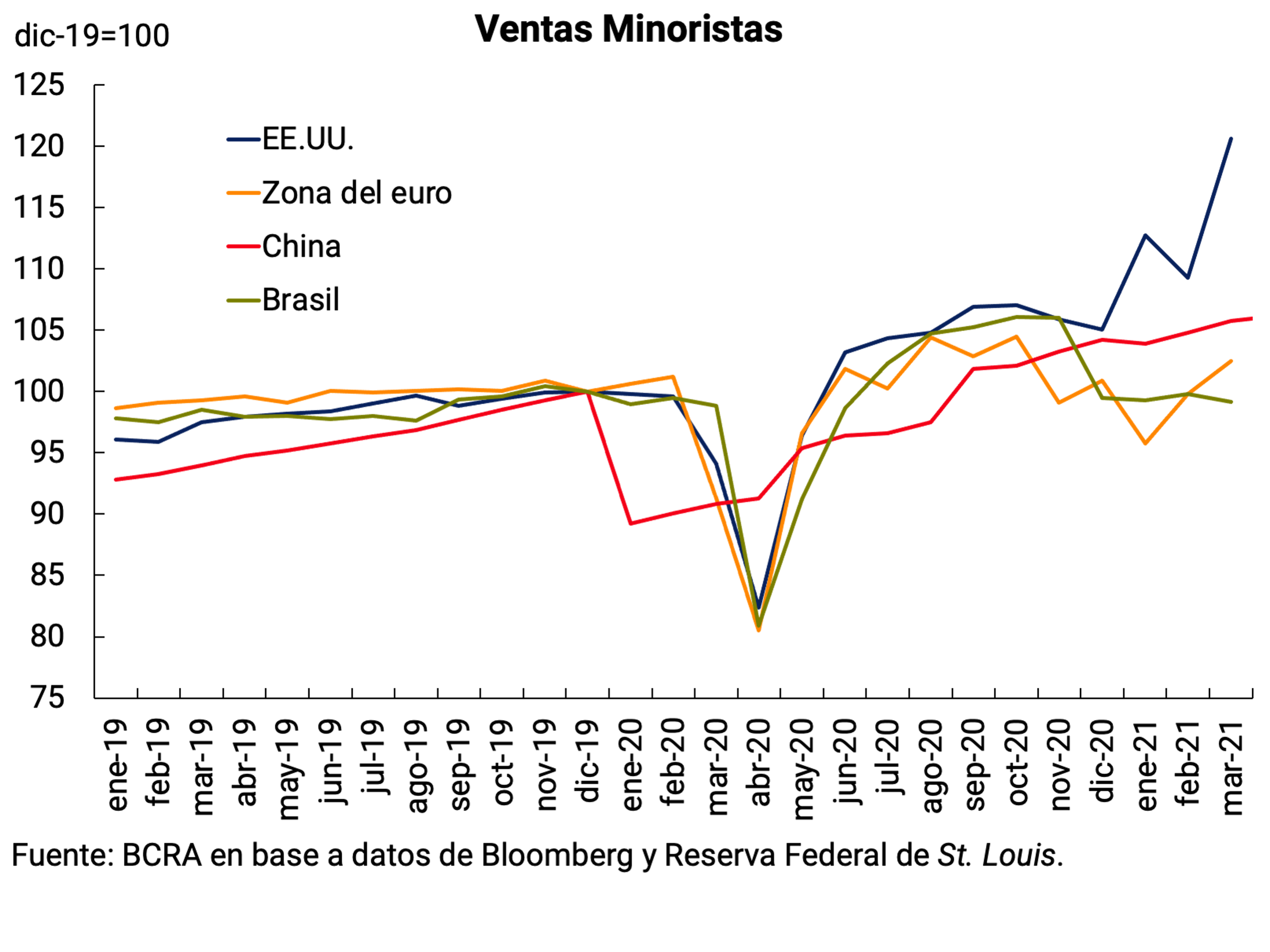 Dos socios comerciales de Argentina con una dinámica diferente respecto del resto son Brasil y China. En Brasil (ver Recuadro. Brasil), se dieron menores valores de los índices PMI desde noviembre de 2020 en adelante, junto con una caída de las ventas minoristas, (que parece haberse detenido desde enero de este año). En China se observa una caída del PMI desde diciembre, pero con un leve repunte en marzo para los servicios y en abril para la industria. En cambio, las ventas minoristas de China continúan creciendo desde los mínimos registrados en enero de 2020.