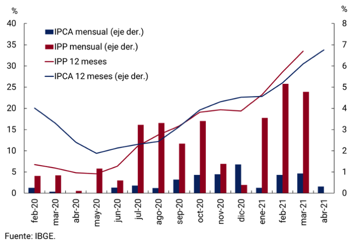 En el principal socio comercial de la Argentina surgen indicios que limitarían el espacio de las políticas fiscal y monetaria para sostener la recuperación. La inflación se aceleró en los últimos meses: en abril, los precios al consumidor (IPCA) aumentaron 6,8% interanual, por encima de la meta de 3,75% ± 1,5 del banco central, y con importantes subas de alimentos. Si bien es la segunda medición consecutiva que sobrepasa el límite superior, la inflación se encuentra sobre el valor medio de 3,75% desde octubre del año pasado. Los precios mayoristas, impulsados por las subas de los precios de las materias primas y la depreciación cambiaria, están aumentando muy por encima de la inflación. El índice general de precios al productor (IPP) marcó 33,52% interanual en marzo y está en valores de dos dígitos desde julio del año pasado (ver Gráfico 2.8a). Estas subas en los precios mayoristas en gran parte aún no se trasladaron a los minoristas. Si bien las expectativas de inflación a largo plazo están en línea con la meta, el comité de política monetaria reaccionó con dos subas, de 75 puntos básicos (p.b.) cada una, de su tasa de política (Selic), dejándola en 3,50%, y anunciando que prevé un nuevo ajuste de la misma magnitud para la próxima reunión.