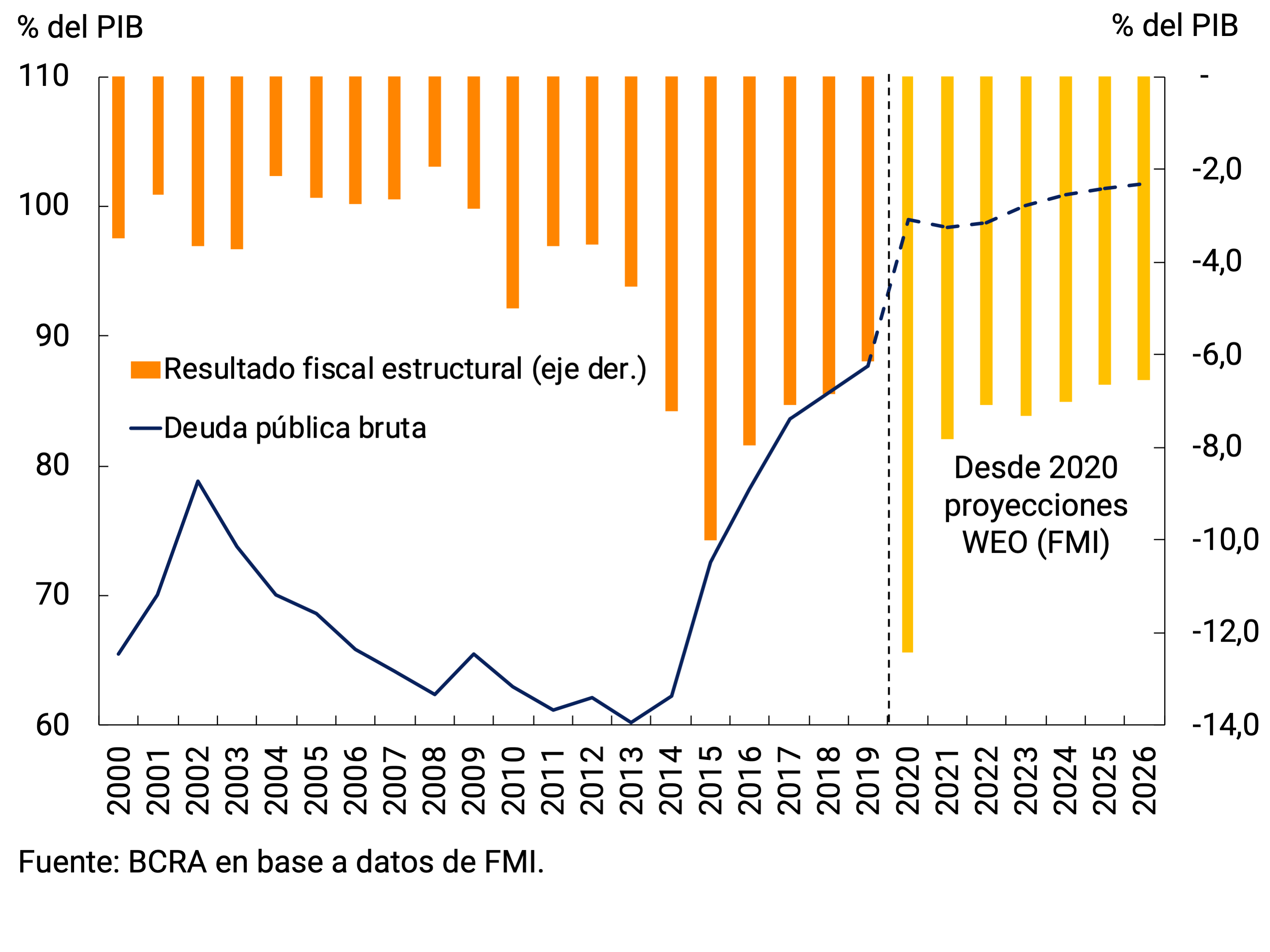 Las medidas de sesgo fiscal estimadas por el FMI, que intentan “limpiar” los efectos del ciclo económico sobre las cuentas públicas, muestran que para este año las economías avanzadas mantendrían el sesgo expansivo, mientras que las emergentes lo reducirían. Así, el déficit fiscal ajustado por el ciclo económico se mantendría estable en las primeras (de -9,0% en 2020 a -8,8% del PIB en 2021) y caería más significativamente en las segundas (de -8,1% a -7,3% del PIB). Esta dinámica fiscal, junto con la recuperación prevista para la actividad económica, llevaría a un incremento más moderado de los ratios de deuda a PIB a nivel global durante este año frente a lo observado en 2020 (ver Gráfico 2.14b).