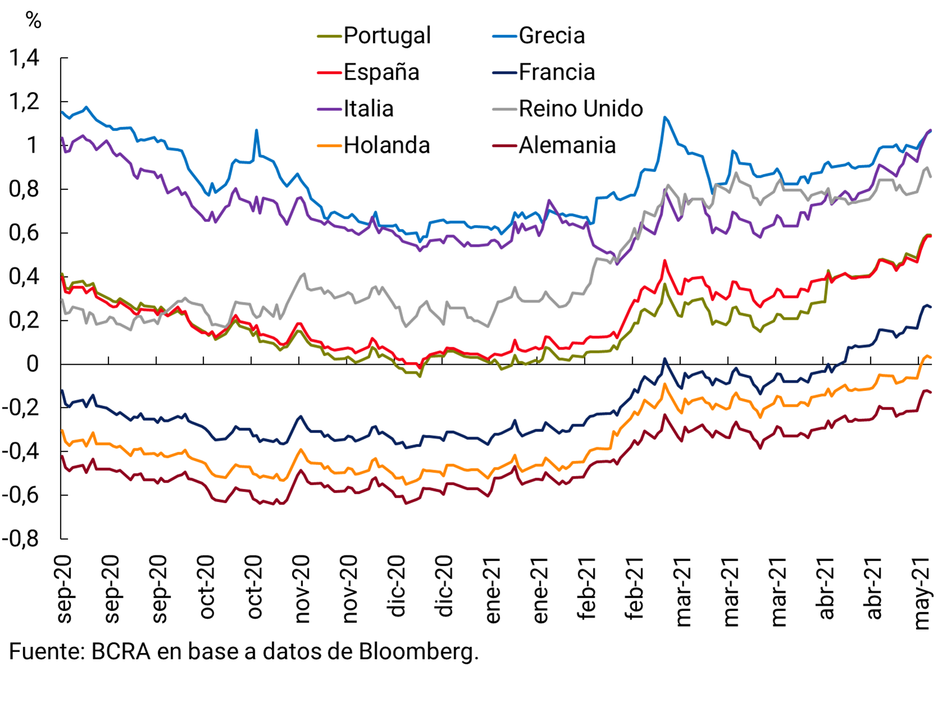 Los rendimientos de los títulos públicos de países europeos revirtieron parcialmente en marzo el aumento de comienzos de año, entre otras razones por las claras señales de continuidad del programa de compras de activos por parte del Banco Central Europeo. En las últimas semanas, las tasas de los bonos europeos volvieron a aumentar, aunque acumulan en el año un alza inferior a la de los títulos de los Estados Unidos. Así, las tasas subieron en promedio 52 p.b. desde comienzos de año y 30 p.b. desde el cierre del último IPOM (ver Gráfico 2.9b).