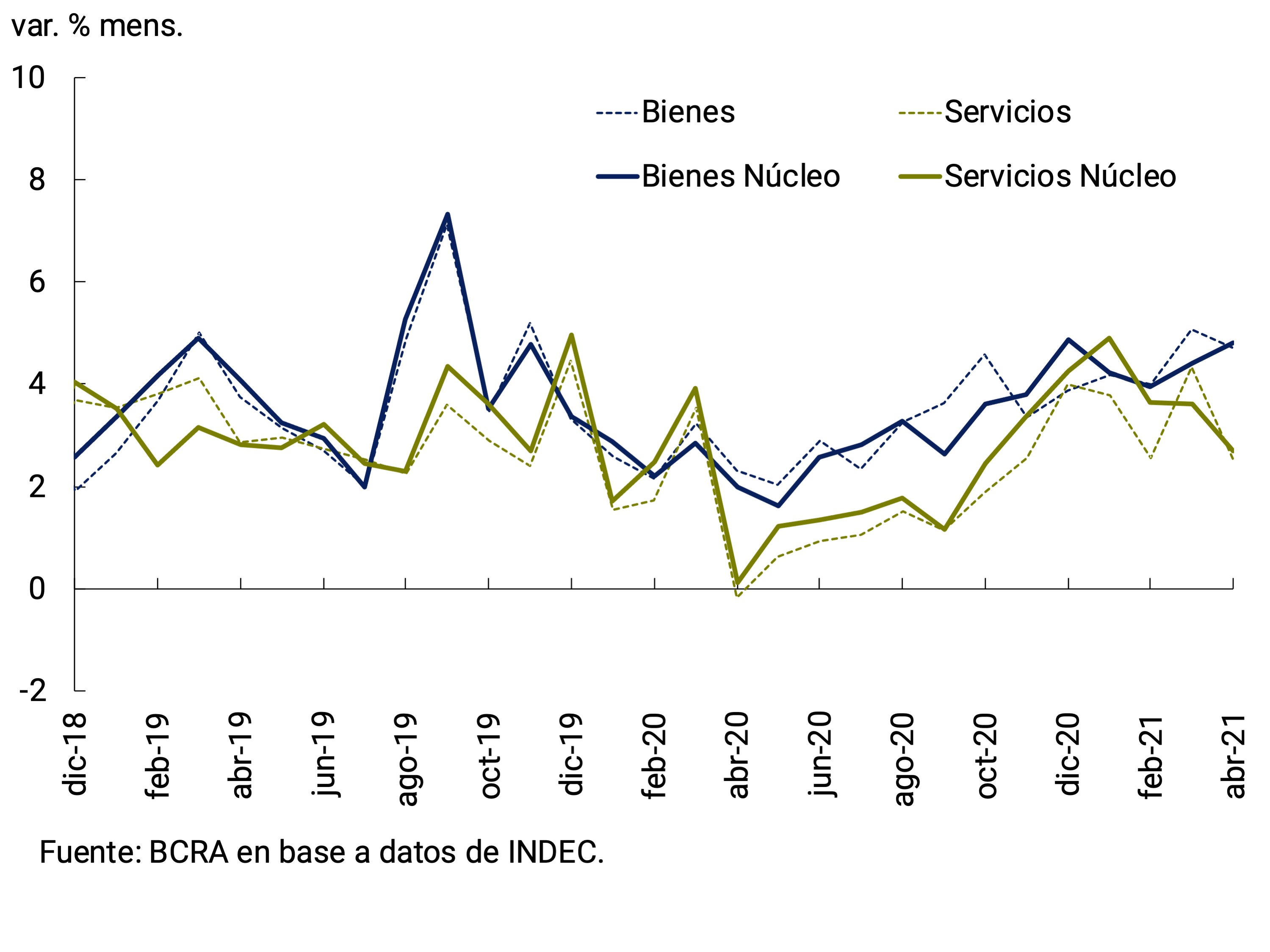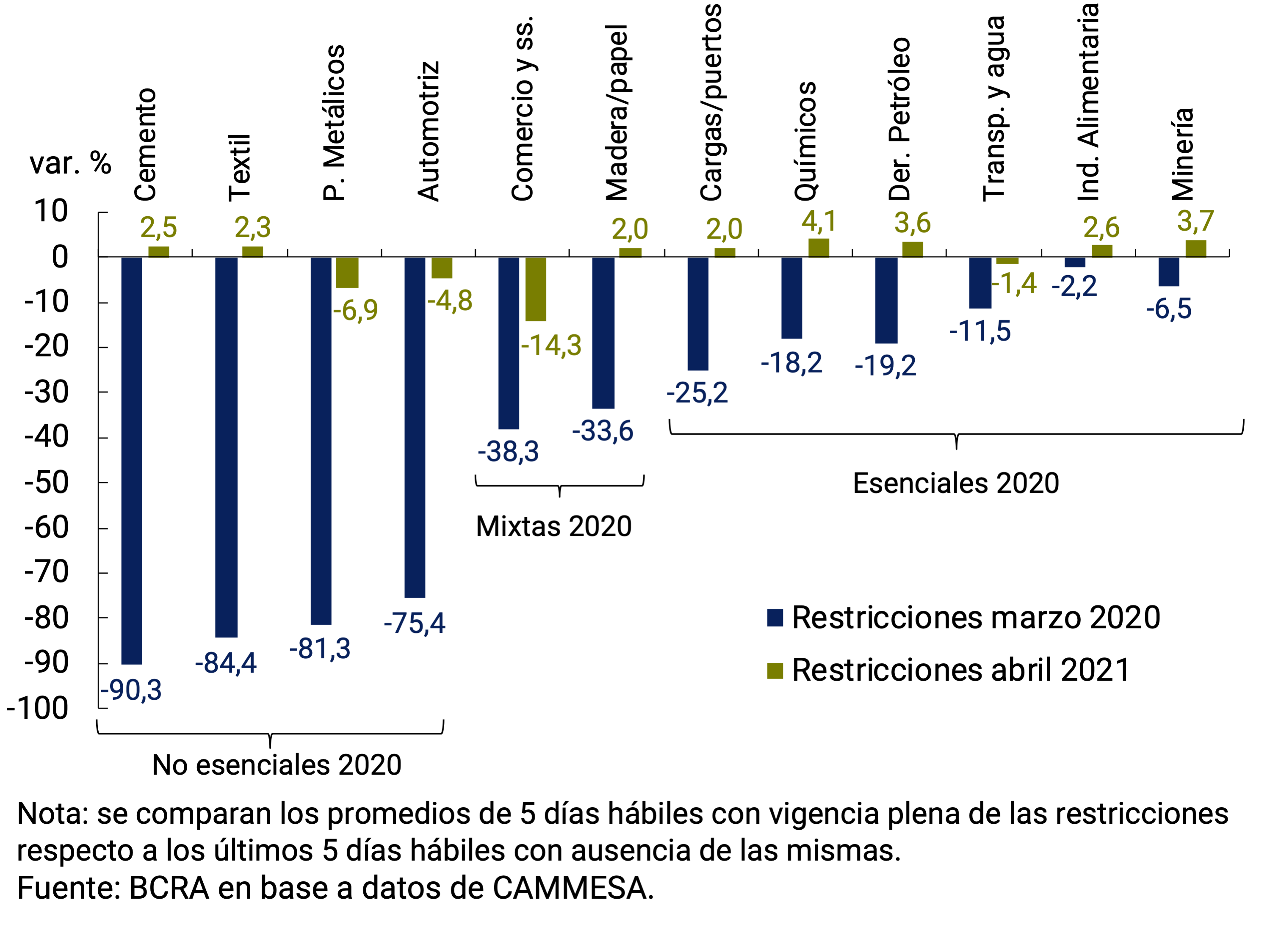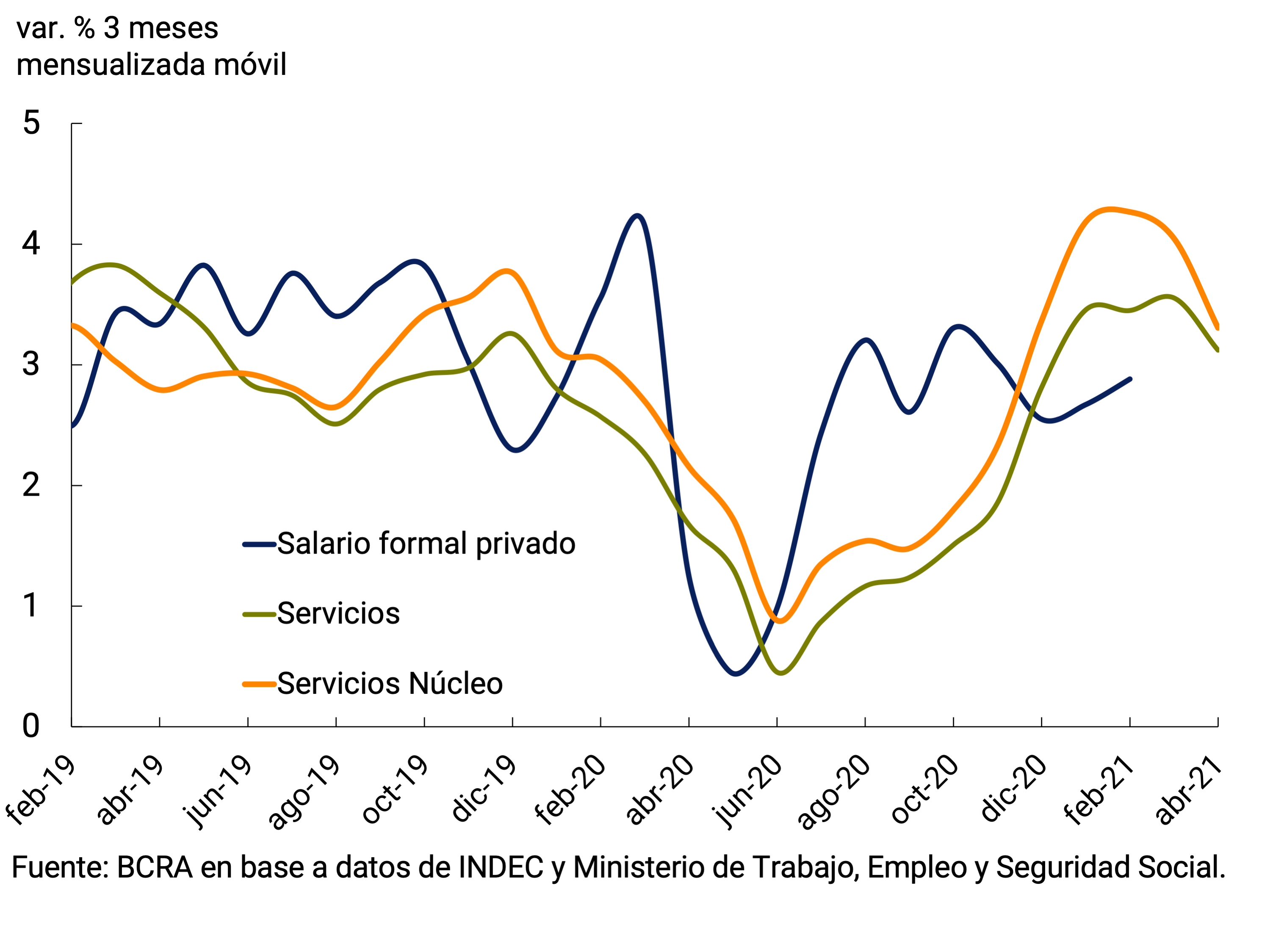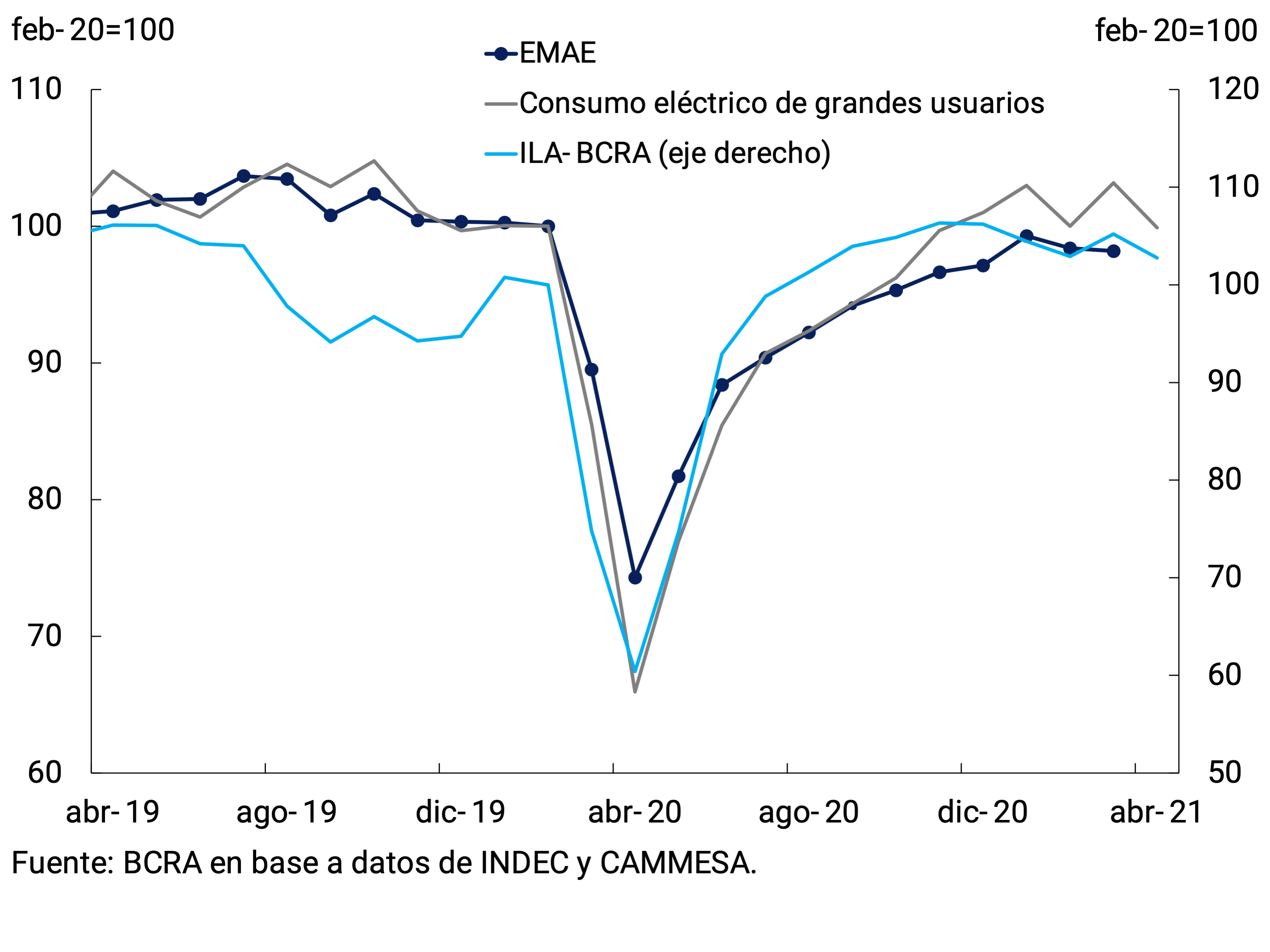 Durante el cuarto trimestre de 2020 y el primero de 2021 se mantuvo el buen desempeño de sectores muy relevantes para la economía, que continuaron creciendo por encima de sus niveles prepandemia. Las actividades de servicios más afectadas por la crisis aceleraron su recuperación durante ese período, si bien continuaron lejos de sus niveles previos. La segunda ola de COVID-19 habría interrumpido desde abril la mejora de esos servicios que implican mayor contacto social. Las necesarias restricciones parciales a la circulación se profundizaron en la última semana de mayo y su impacto podría difundirse en forma directa o indirecta a otros sectores. Los protocolos sanitarios, el fortalecimiento del sistema de salud y el proceso de vacunación en curso han permitido que dichas medidas restrictivas hayan sido, hasta el momento, de menor intensidad respecto a las aplicadas en marzo y abril de 2020. Por ello, la mayor parte de las actividades productivas registrarán en el segundo trimestre de 2021 tasas de crecimiento interanual fuertemente positivas, en algunos casos de dos dígitos.