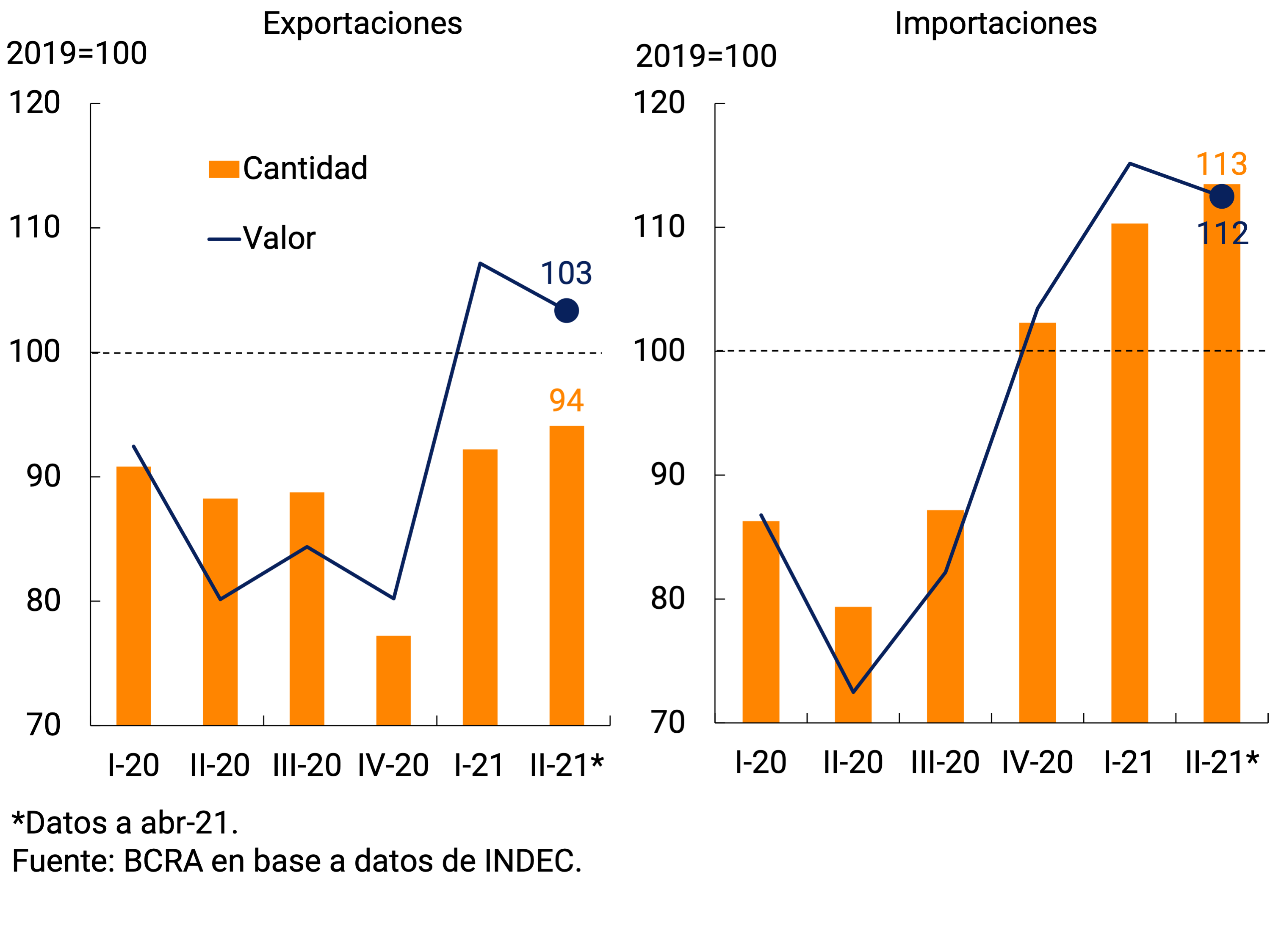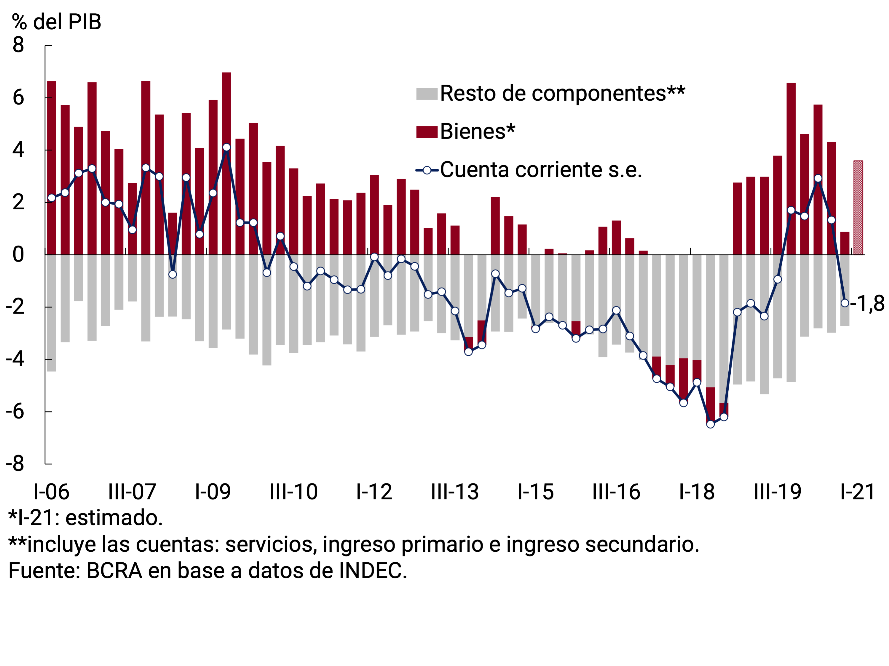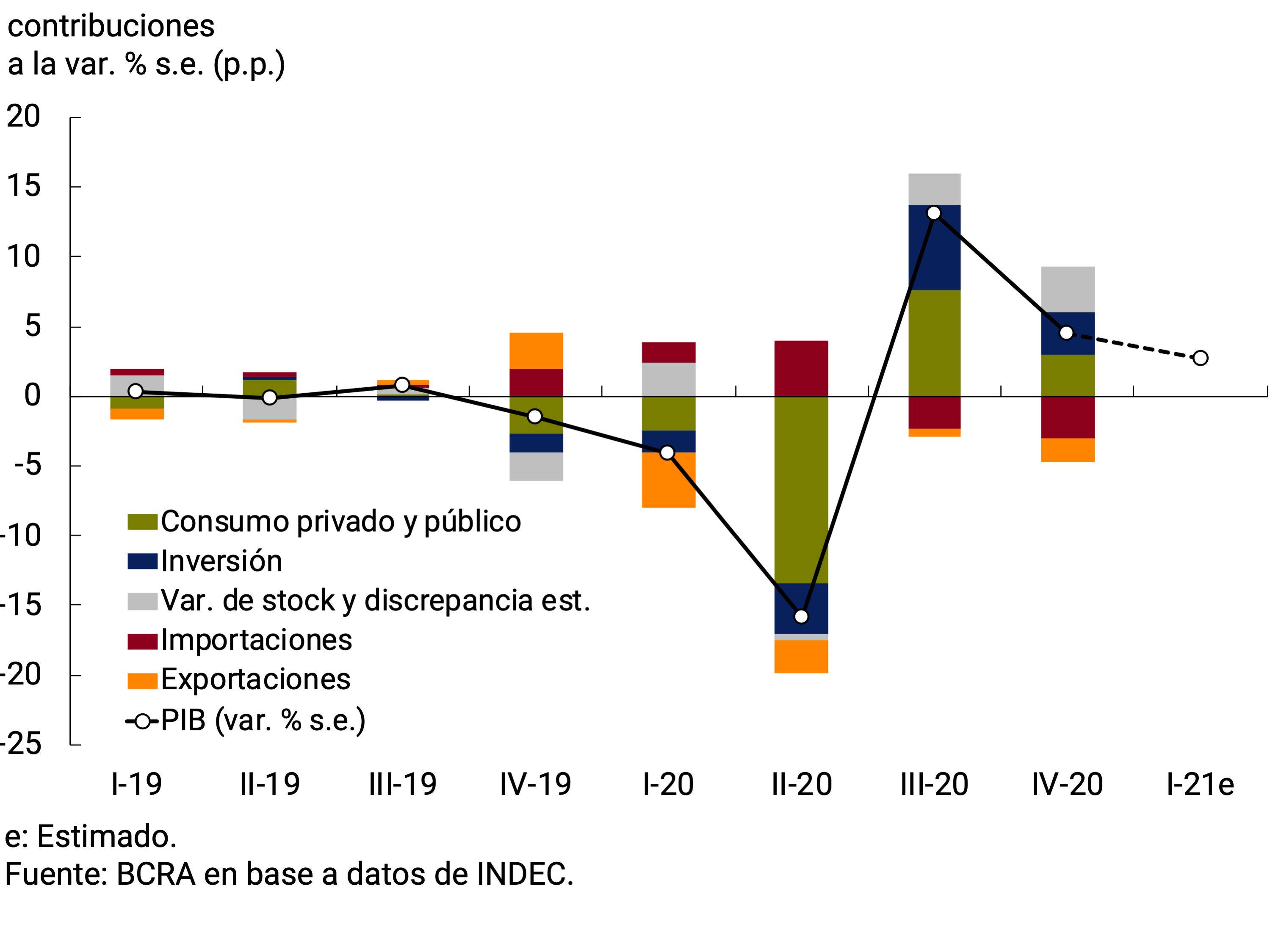 Las Exportaciones netas contribuirían positivamente a la demanda agregada durante el primer trimestre de 2021. De acuerdo con la información referida al Intercambio Comercial de Bienes del INDEC, se espera una reversión parcial del comportamiento observado durante el trimestre anterior, con un aporte positivo de las Exportaciones netas cercano a los 2 p.p. Las cantidades comercializadas en el exterior registraron una suba trimestral de 19,1% s.e. mientras que las importaciones medidas a precios constantes desaceleraron fuertemente su crecimiento, hasta 3,2% trimestral s.e. (ver Capítulo 4. Sector Externo).