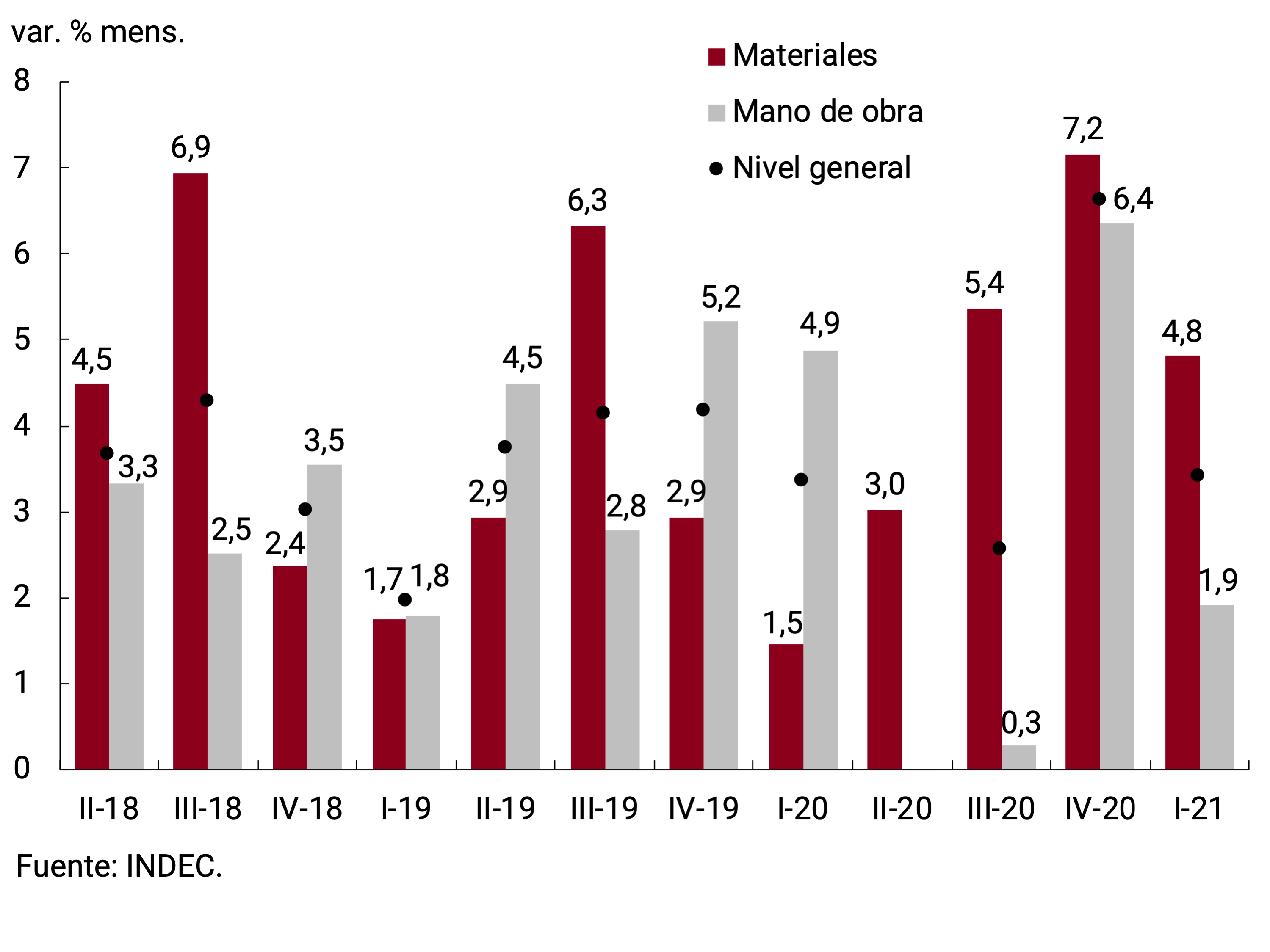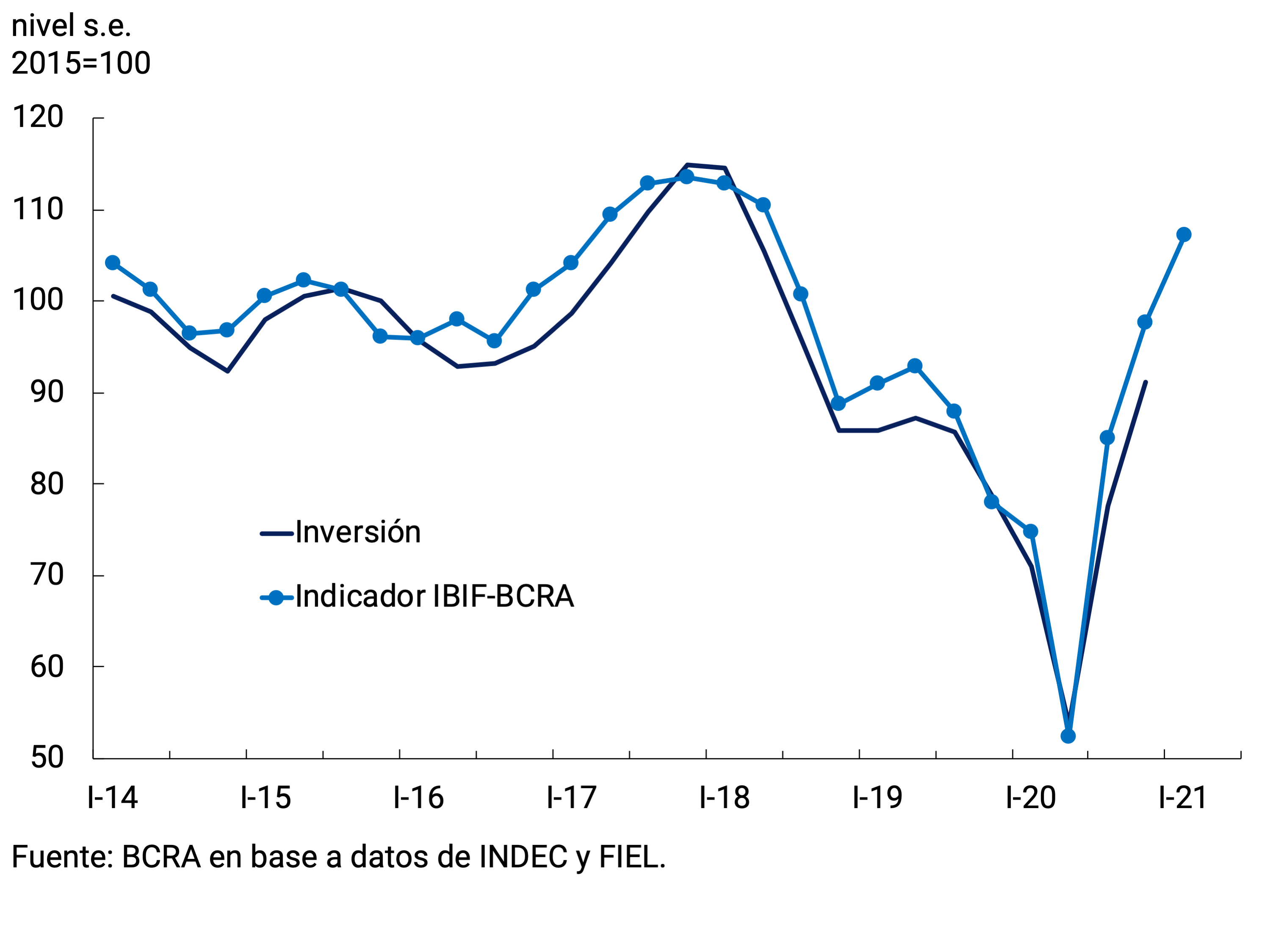 Los datos adelantados del primer trimestre de 2021 permiten anticipar un nuevo repunte de la inversión que la ubicarían en niveles desestacionalizados similares a los de 2018 (ver Gráfico 3.3). El indicador IBIF-BCRA presentó una suba trimestral de 9,8% s.e. con aumentos tanto de la construcción como del gasto en equipamiento durable de producción7. La inversión crecería en torno al 40% con relación a un año atrás, liderada tanto por el dinamismo del sector de la construcción como por las compras de maquinaria agrícola y de bienes de capital por parte del sector industrial.