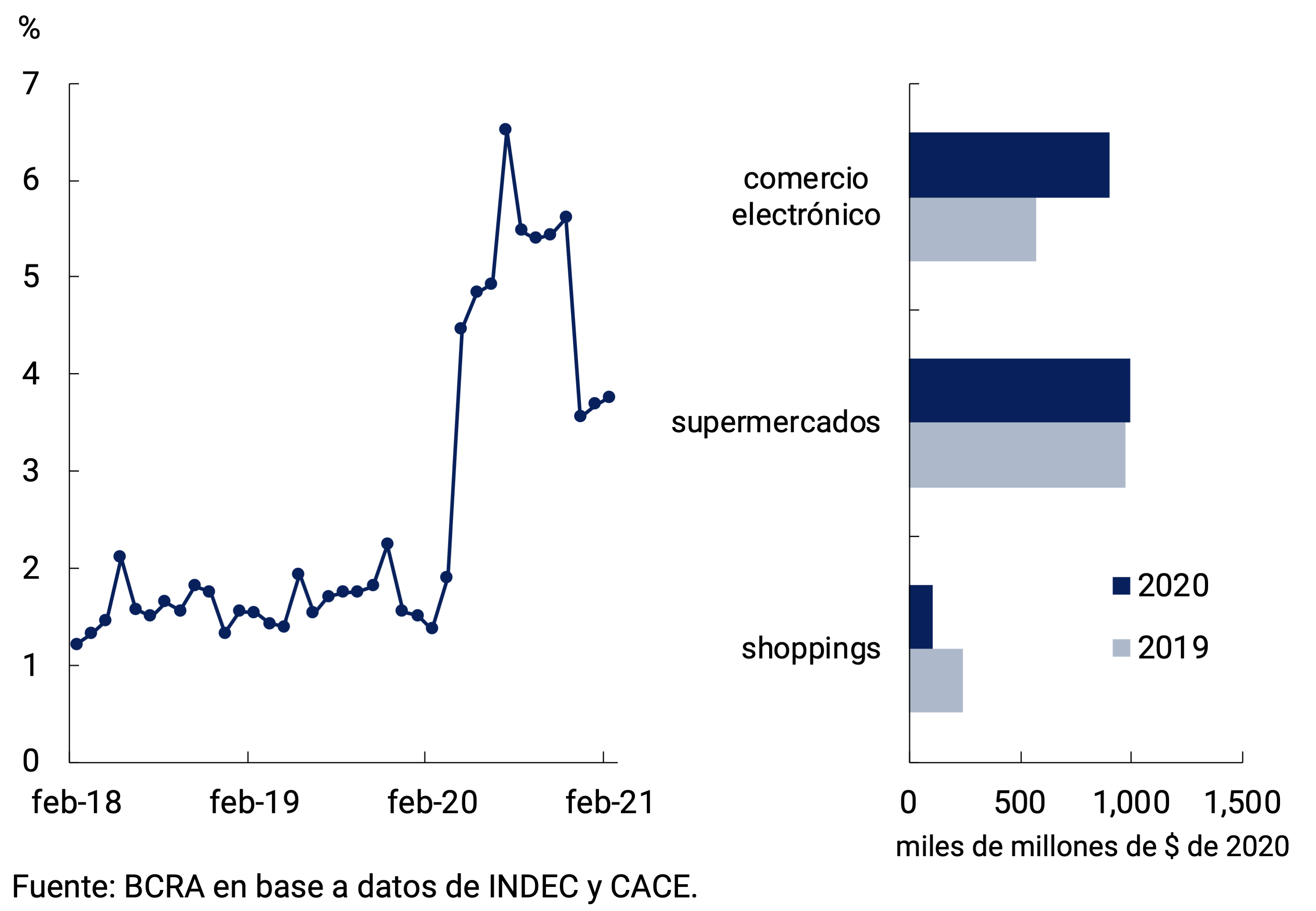 El Consumo privado tuvo un crecimiento moderado durante el cuarto trimestre de 2020, ubicándose 8,3 p.p. por debajo del nivel de prepandemia. La recuperación de los ingresos de las familias fue impulsada por el empleo independiente e informal, mientras que la masa salarial formal fue más estable durante todo ese año (ver Sección Empleo). Con datos parciales del primer trimestre de 2021, el Indicador de Consumo privado del BCRA arrojó una mejora del 3% s.e. respecto al trimestre anterior. Un factor importante en la evolución del gasto de los hogares durante el resto del año es la mayor oferta de servicios disponible y el fuerte redireccionamiento del gasto en favor del consumo por canales electrónicos, comparado con un año atrás, cuando irrumpió la pandemia. El segundo trimestre de 2020 fue el período de mayor impacto de este inusual shock que motivó el desarrollo de nuevas plataformas digitales a las que paulatinamente fueron adaptándose tanto los consumidores como las firmas.