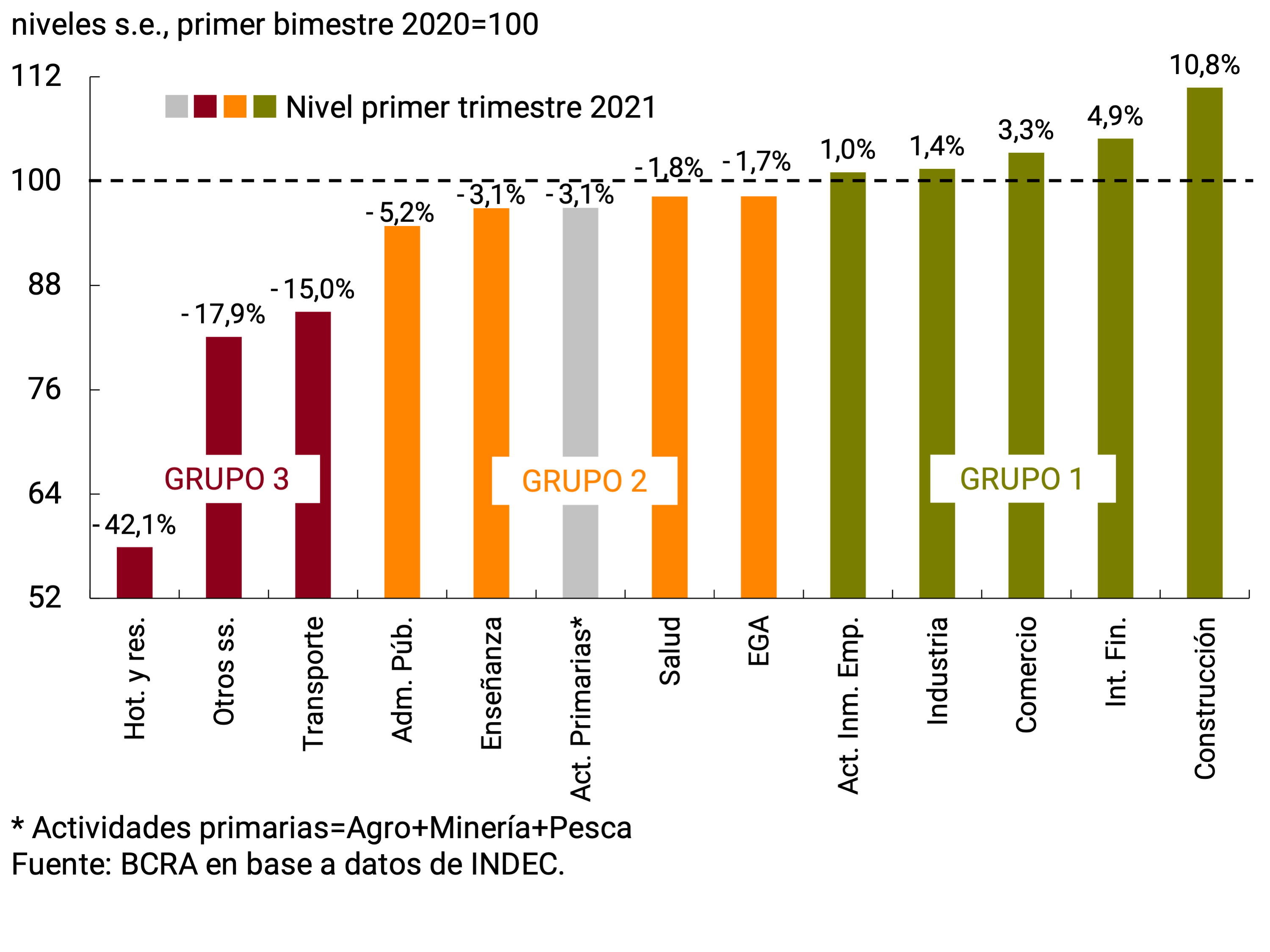 La actividad económica continuó mejorando en el primer trimestre de 2021, favorecida por las medidas que tomaron el Gobierno Nacional y el BCRA ante la emergencia sanitaria, la habilitación de actividades económicas bajo normas de protocolo y la puesta en marcha del proceso de vacunación contra el COVID-19. Esta recuperación atenuó parcialmente la heterogeneidad sectorial, a partir del avance en las actividades más sensibles a la pandemia.