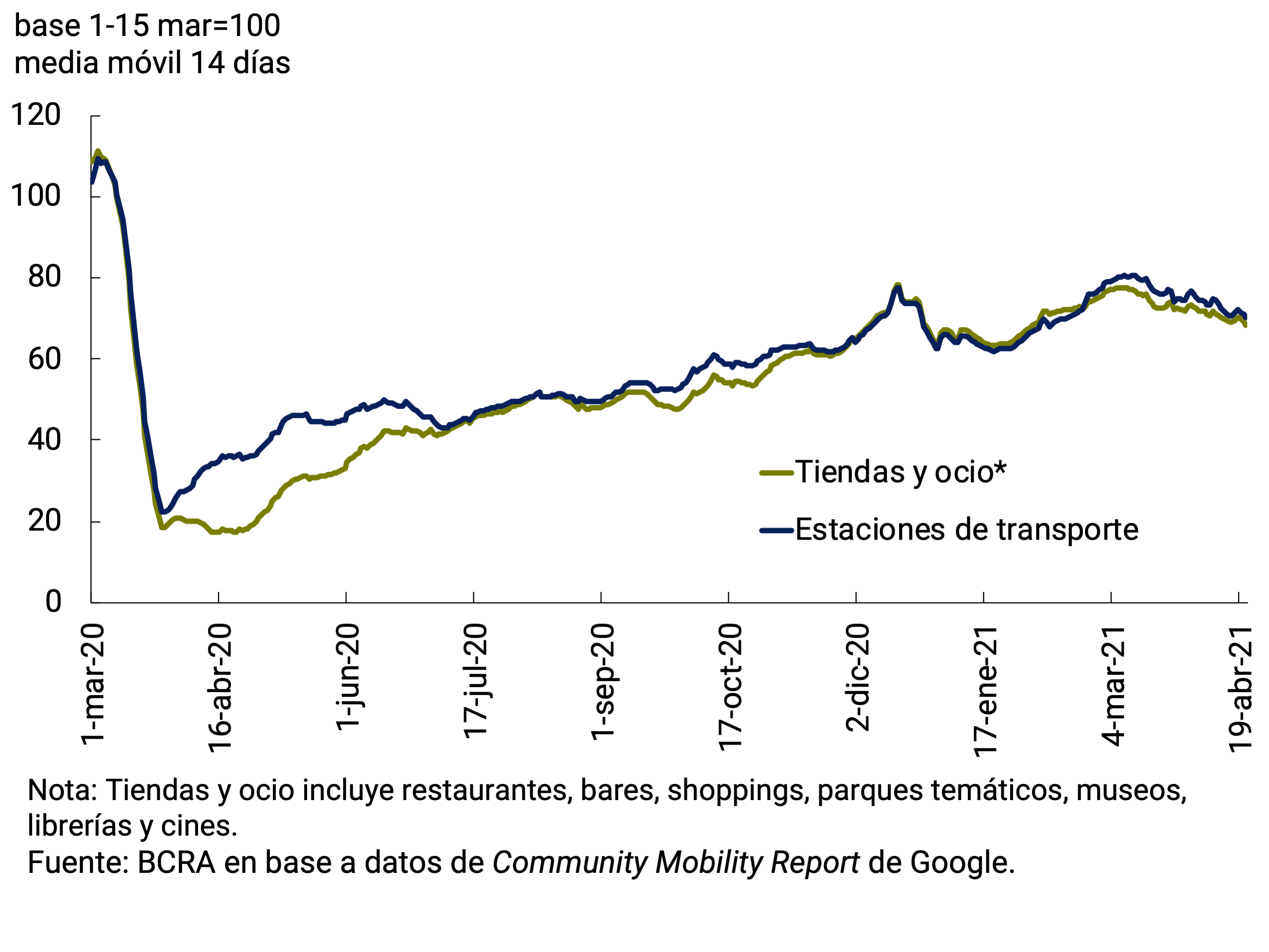 Un tercer grupo está conformado por algunos sectores de servicios que, al implicar un mayor riesgo sanitario fueron los más damnificados por la pandemia acumulando fuertes contracciones hasta el primer trimestre de 2021: Hoteles y restaurantes (-42,1%), Otros servicios (-17,9%) y Transporte (-15%). En el cuarto trimestre de 2020 y el primero de 2021 las restricciones que afectaban a estas actividades fueron relajadas parcialmente permitiendo una aceleración en su recuperación. El incremento de la circulación, la habilitación del turismo interno, la reactivación de los vuelos, y el permiso al funcionamiento de cines y teatros dio impulso a estos sectores que, sin embargo, se mantuvieron todavía lejos de los niveles normales, en el contexto de una demanda contenida en forma preventiva. Tal como se advirtió en el IPOM anterior, la velocidad de recuperación de este grupo de actividades depende en forma directa de la evolución de la pandemia. En este sentido, la llegada de la segunda ola y la implementación de las restricciones para enfrentarla habrían afectado negativamente a estos sectores a partir de abril y se espera una profundización a fines de mayo. Los datos de movilidad asociados a transporte y esparcimiento dan cuenta de caídas respecto a marzo, aunque de una magnitud reducida respecto a las observadas durante el período de aislamiento estricto durante marzo y abril de 2020 (ver Gráfico 3.7). El Gobierno Nacional reforzó los planes de asistencia a estos sectores más sensibles con el objetivo de amortiguar la contracción en sus ingresos durante el período de mayor severidad de la situación sanitaria.