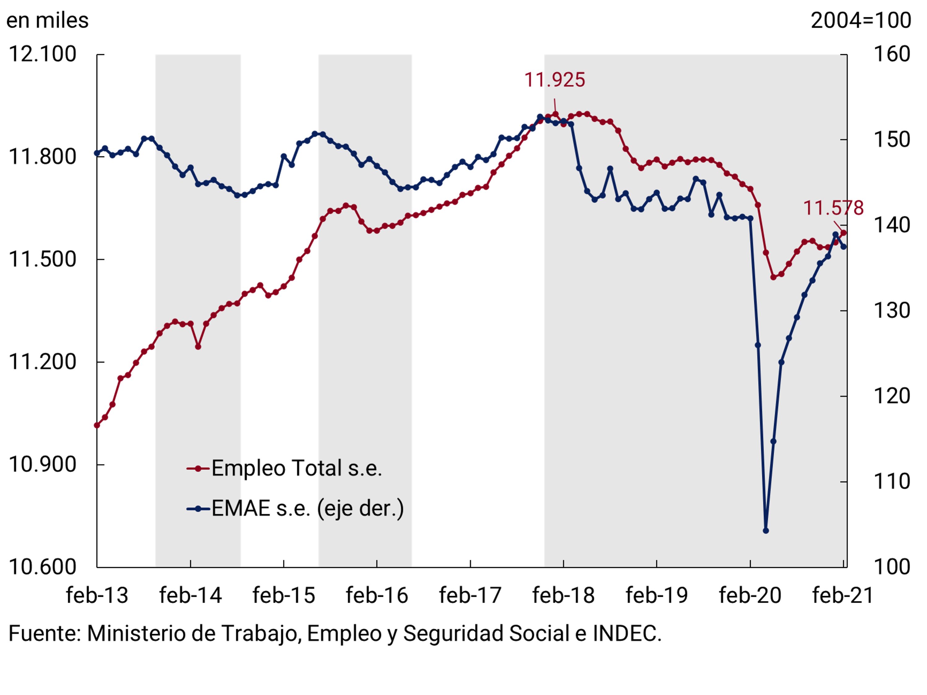 A comienzos del año la actividad económica continuó recuperándose. El Estimador Mensual de Actividad Económica (EMAE) ajustado por factores estacionales (s.e.) se ubicó en marzo de 2021 un 11,4% por encima del nivel de marzo de 2020 y apenas un 1,8% por debajo del nivel desestacionalizado de febrero de 2020, mes previo a la propagación del COVID-19 en el país. En el primer trimestre del año la actividad mostró un crecimiento de 2,3% s.e. respecto al periodo anterior.