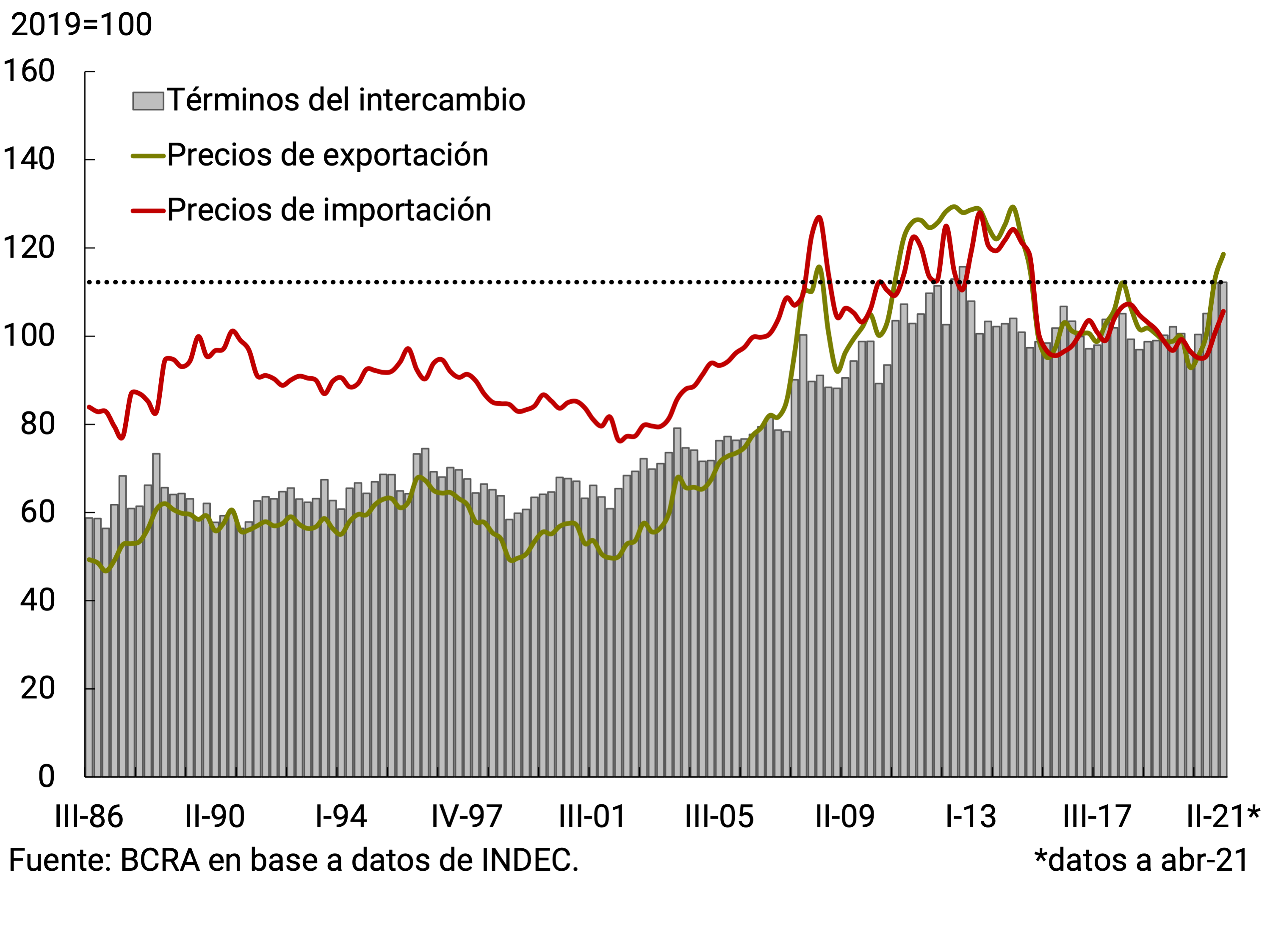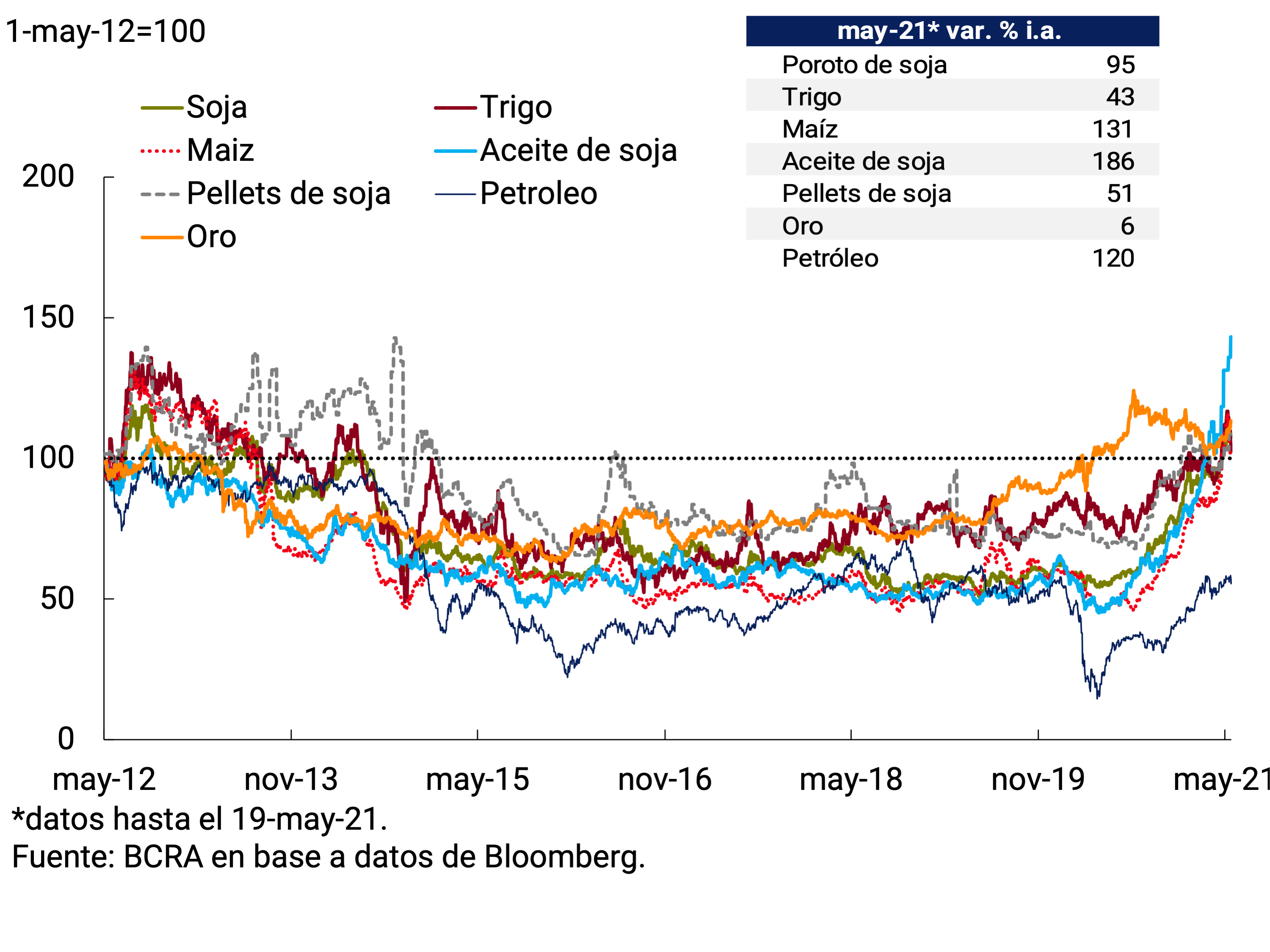 Los precios de las materias primas continuaron subiendo, especialmente las agrícolas, que ya están en valores máximos desde el año 2012 (ver Recuadro. Evolución reciente de los precios internacionales de las materias primas del Capítulo 4. Sector Externo).