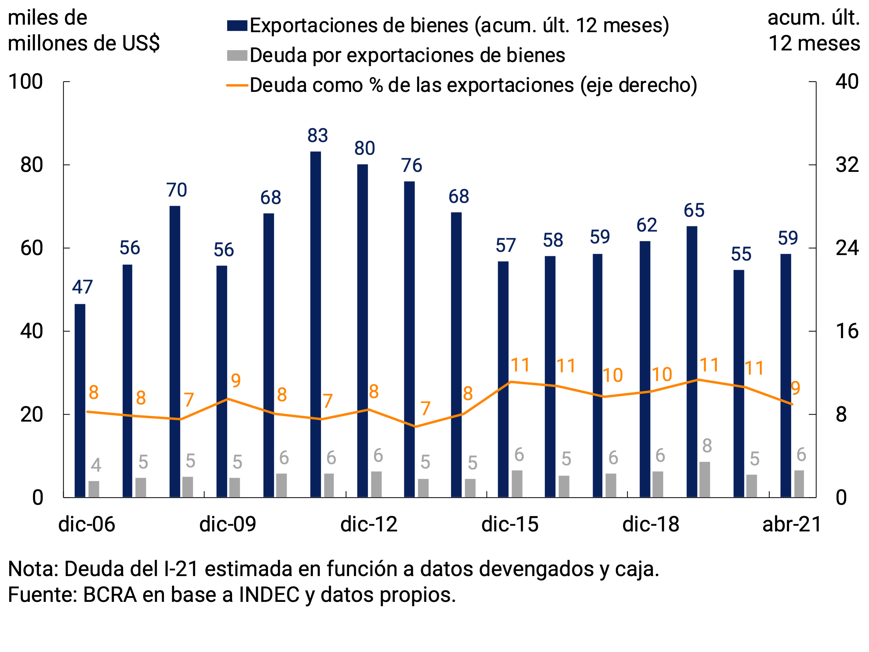 Por el lado de la deuda externa comercial, los pasivos por exportaciones de bienes (anticipos de clientes y prefinanciaciones) se redujeron en US$3.112 millones durante 2020 (ver Gráfico 2). Cabe destacar que, en septiembre de 2020 este tipo de financiamiento registró un mínimo desde los inicios de la serie en diciembre de 2017, aunque se recuperó parcialmente en el último trimestre del año. A pesar de la cancelación neta, el ratio entre la deuda de exportaciones y las exportaciones de bienes se mantuvo en línea con los niveles observados en los últimos 5 años, pero por arriba de los registrados hasta el 2014, pudiéndose concluir que, entre otros factores, la baja de la deuda estuvo asociada a las menores ventas externas en el contexto de la pandemia de COVID-19.
