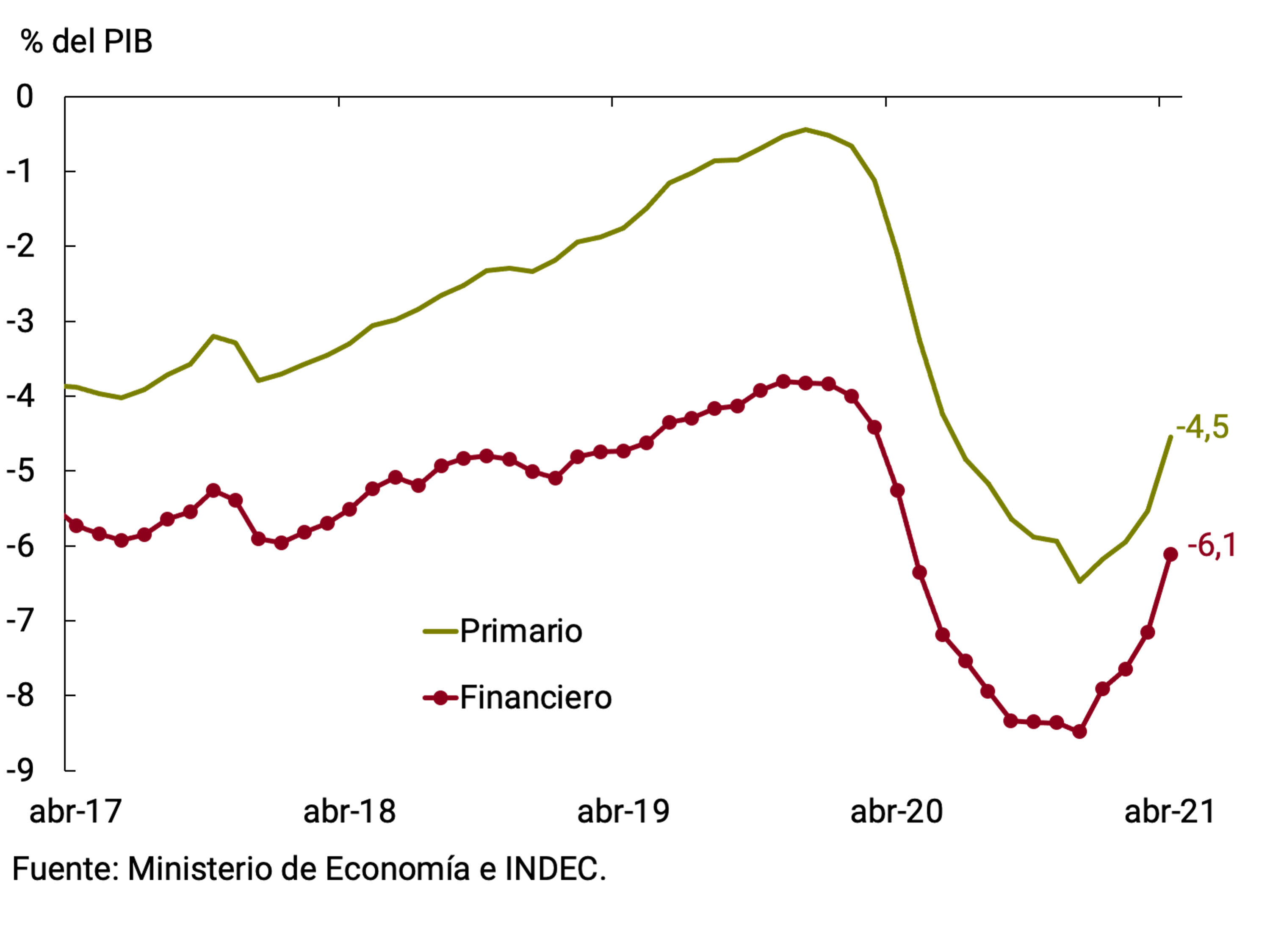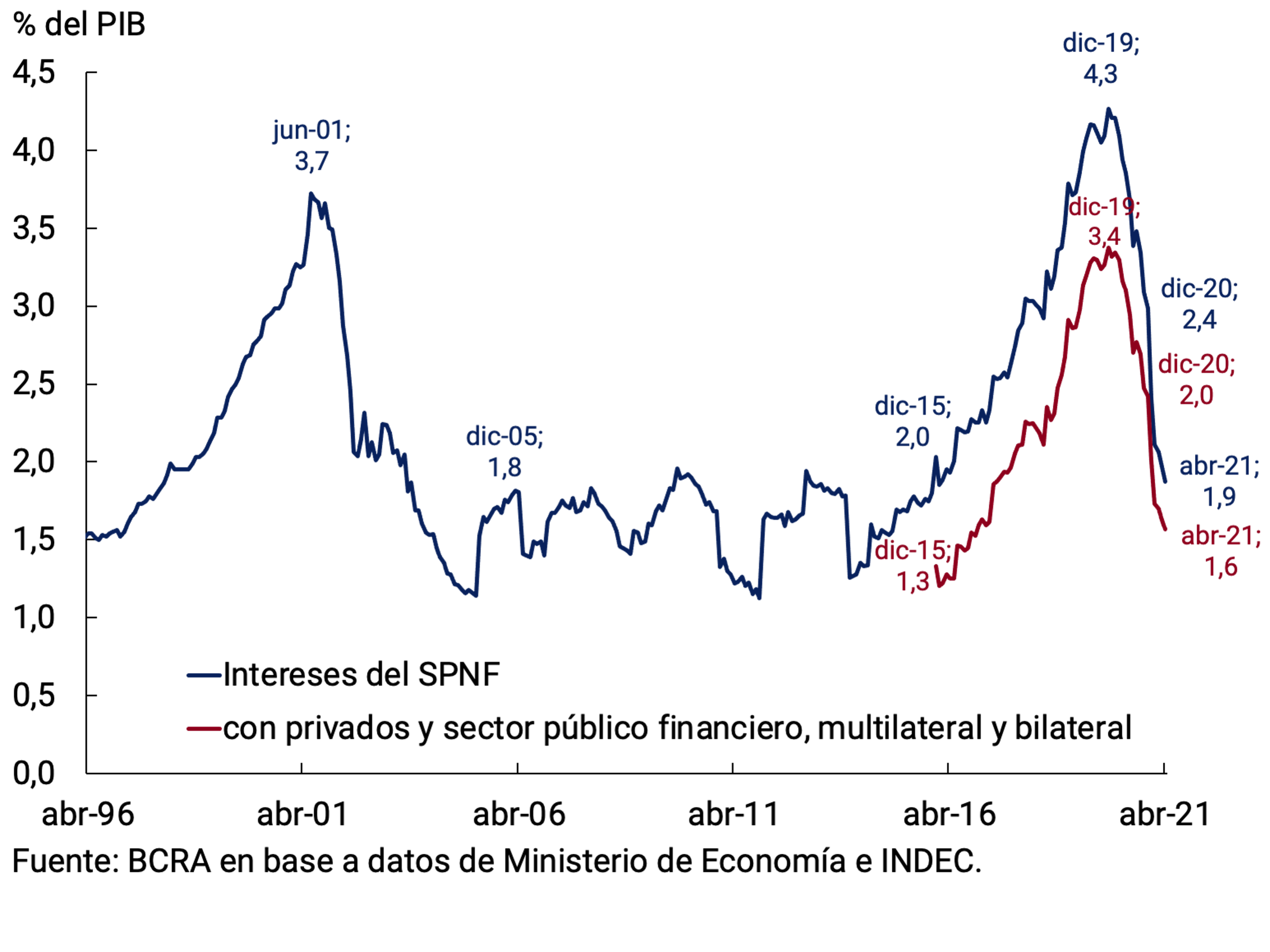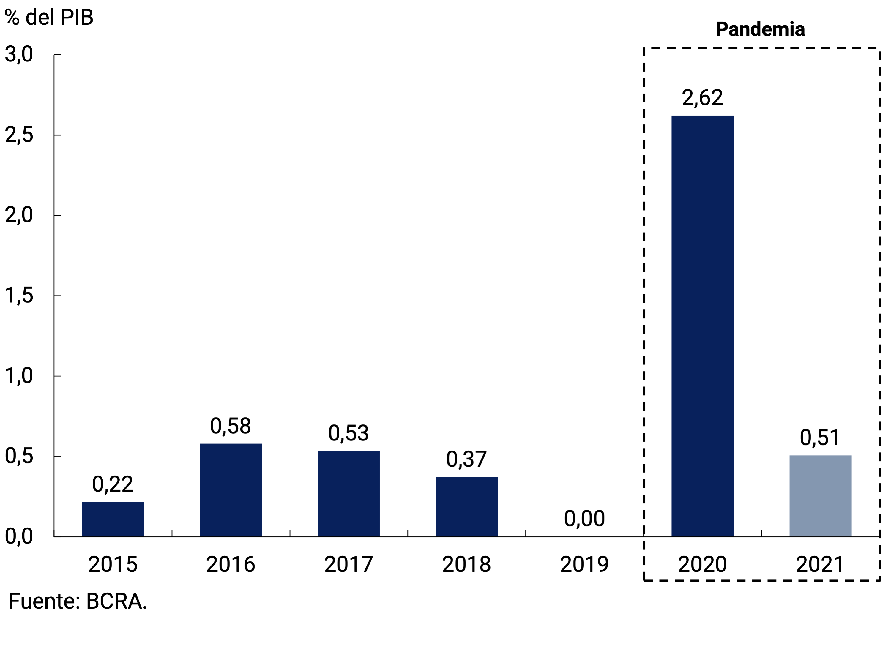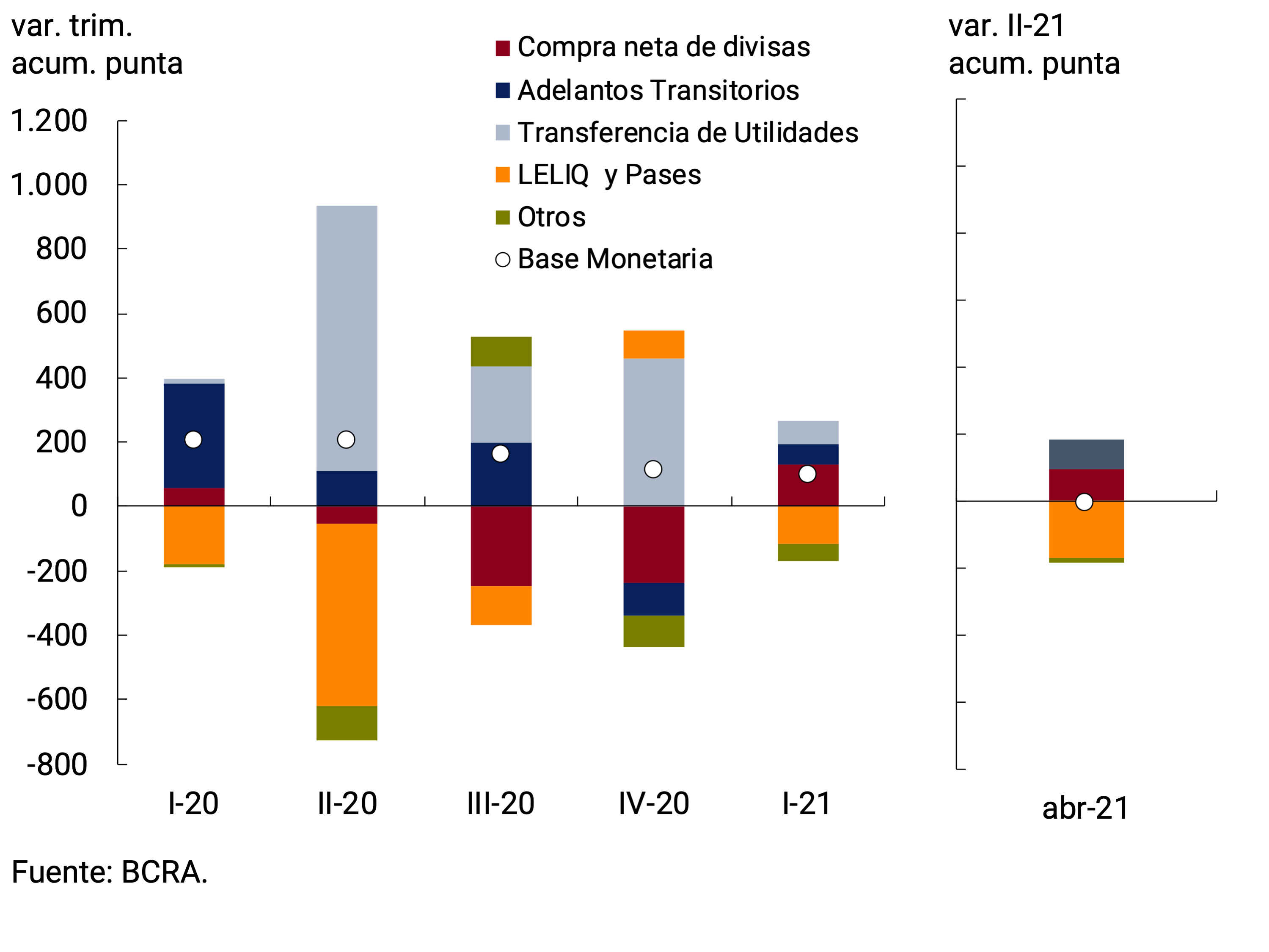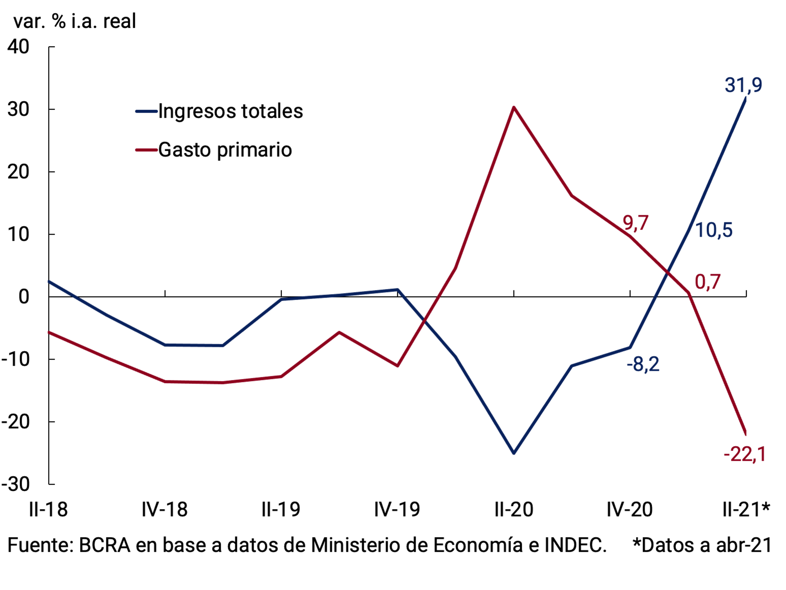 La recaudación tributaria continuó fortaleciéndose durante el primer cuatrimestre del año, a partir del aporte de los impuestos relacionado al comercio exterior —en un contexto de subas de los precios internacionales de las materias primas— y de la sostenida recuperación de los tributos vinculados a la actividad económica interna, favorecida por una recuperación más rápida de lo previsto inicialmente. Asimismo, siguieron incidiendo positivamente sobre los ingresos públicos las modificaciones normativas sobre impuestos dispuestos en la Ley de Solidaridad Social y Reactivación Productiva de fines de 2019 y en la Ley de Presupuesto Nacional 2021. Lo anterior, sumado a los esfuerzos desplegados por el Gobierno Nacional para reconstruir el mercado de deuda en pesos, permitió reducir la asistencia financiera del Banco Central al Tesoro Nacional. Así, en lo que va de 2021 se registró una variación acotada y balanceada de los factores de expansión de la base monetaria. Puntualmente, en lo que refiere a la asistencia financiera al Tesoro, ésta se ubica en línea con los registros de años previos en términos del PIB, excluyendo el primer año de pandemia.