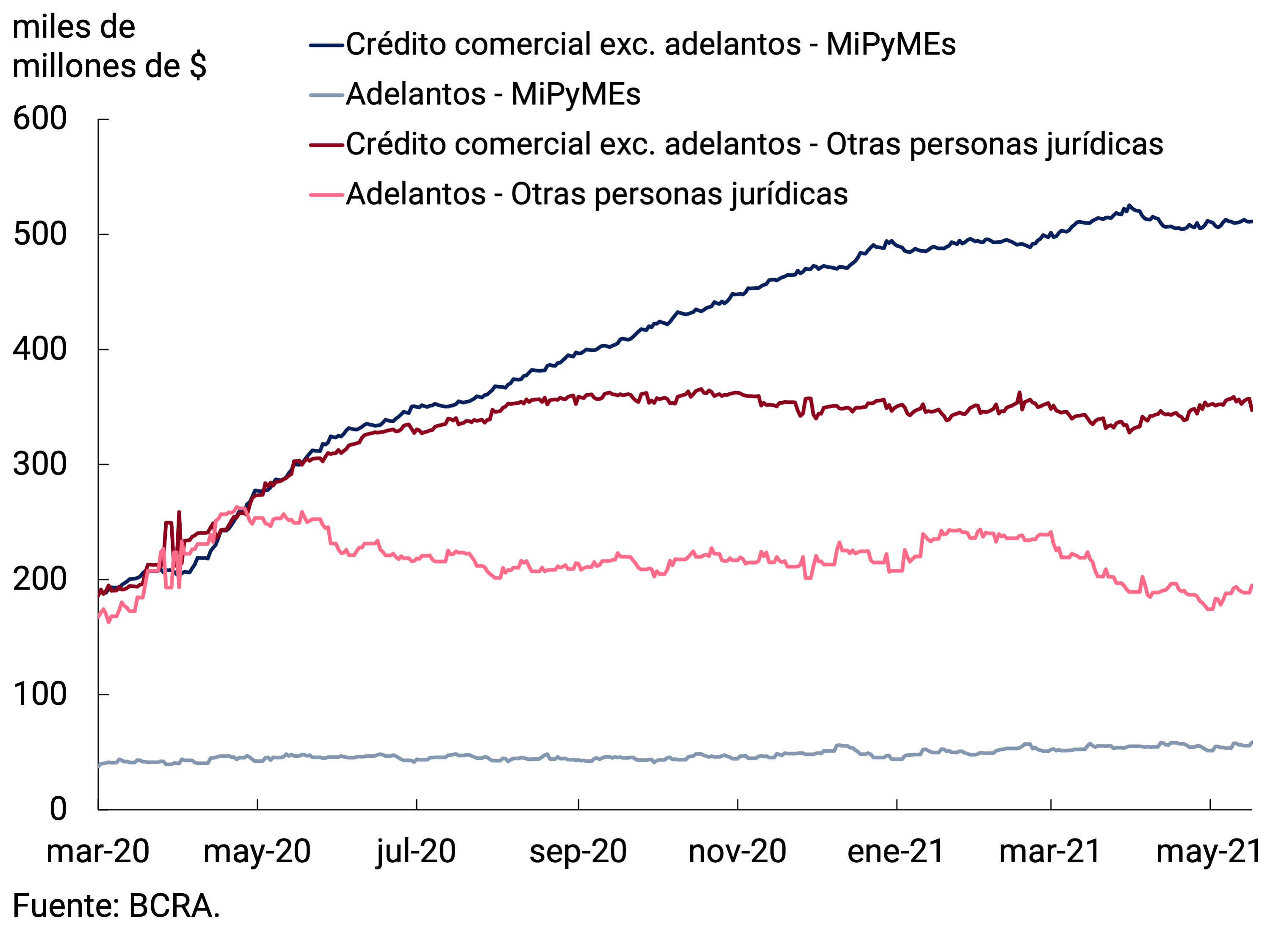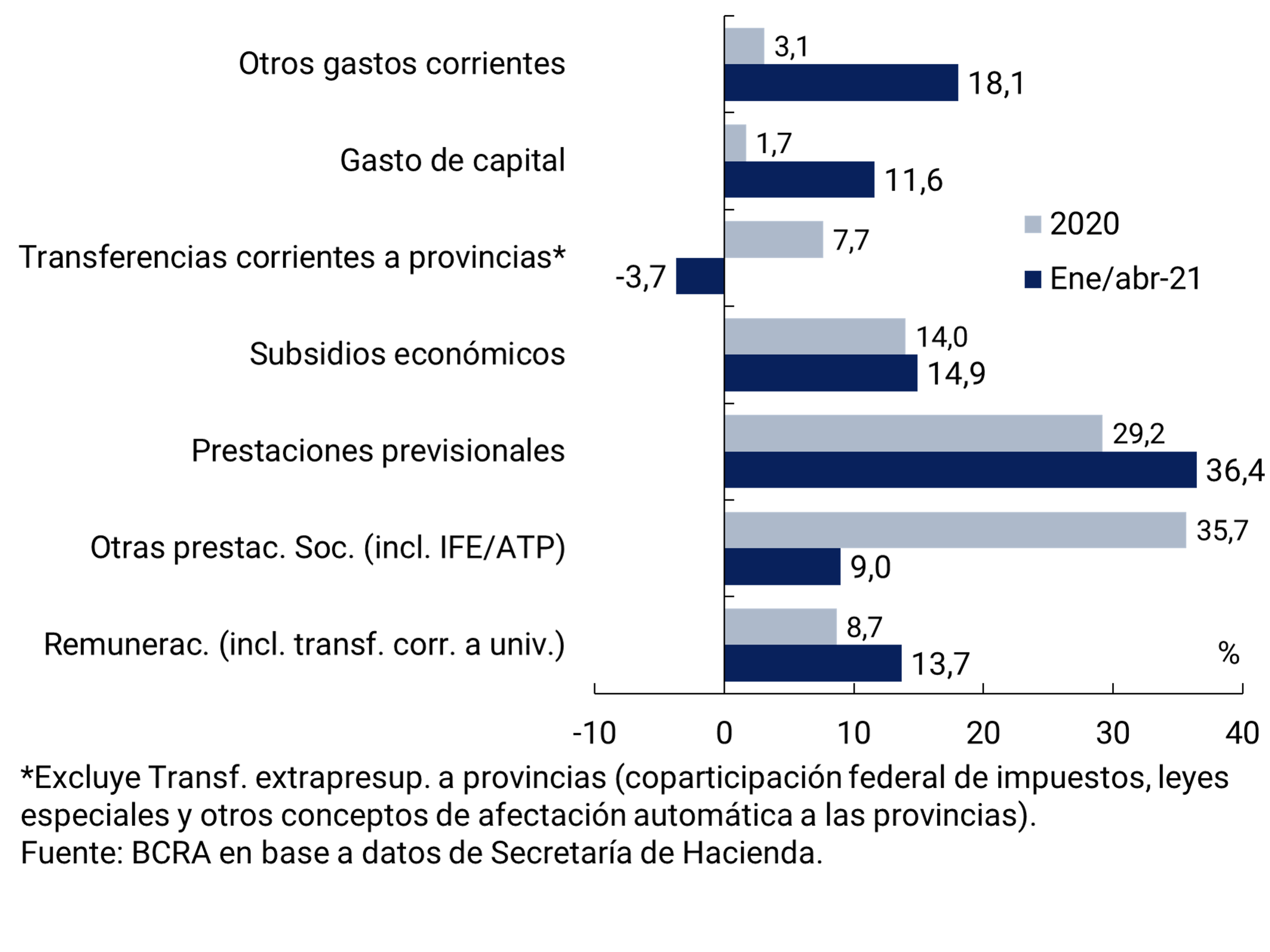 34 Durante el primer cuatrimestre del 2021, el BCRA otorgó $190.000 millones de Adelantos Transitorios (AT) netos al Tesoro Nacional (TN), lo que contrastó con la asistencia financiera de igual período del año 2020 por $310.000 millones de transferencia de anticipos de utilidades y $312.000 millones de AT netos.