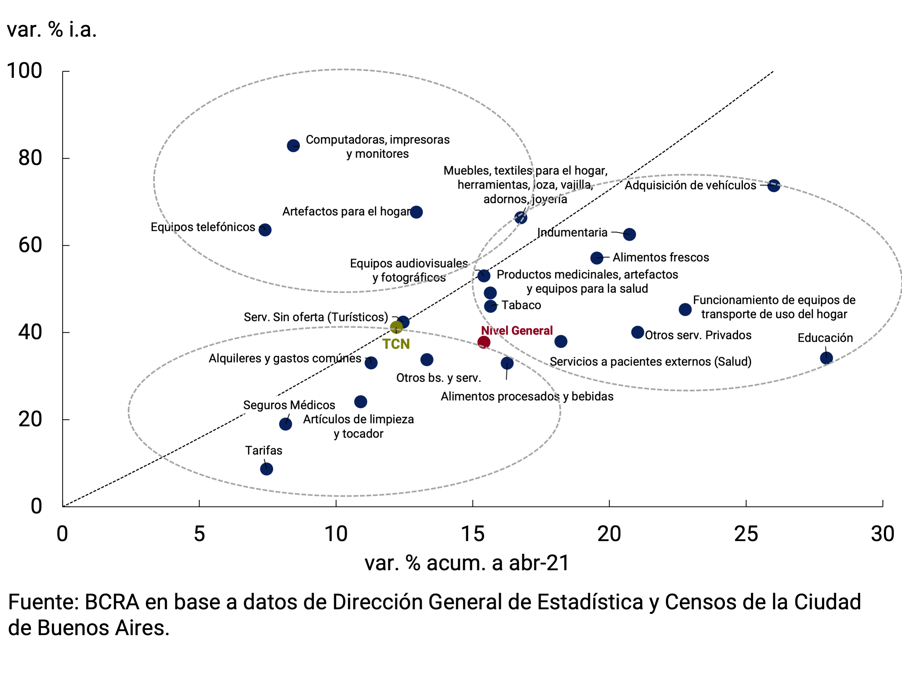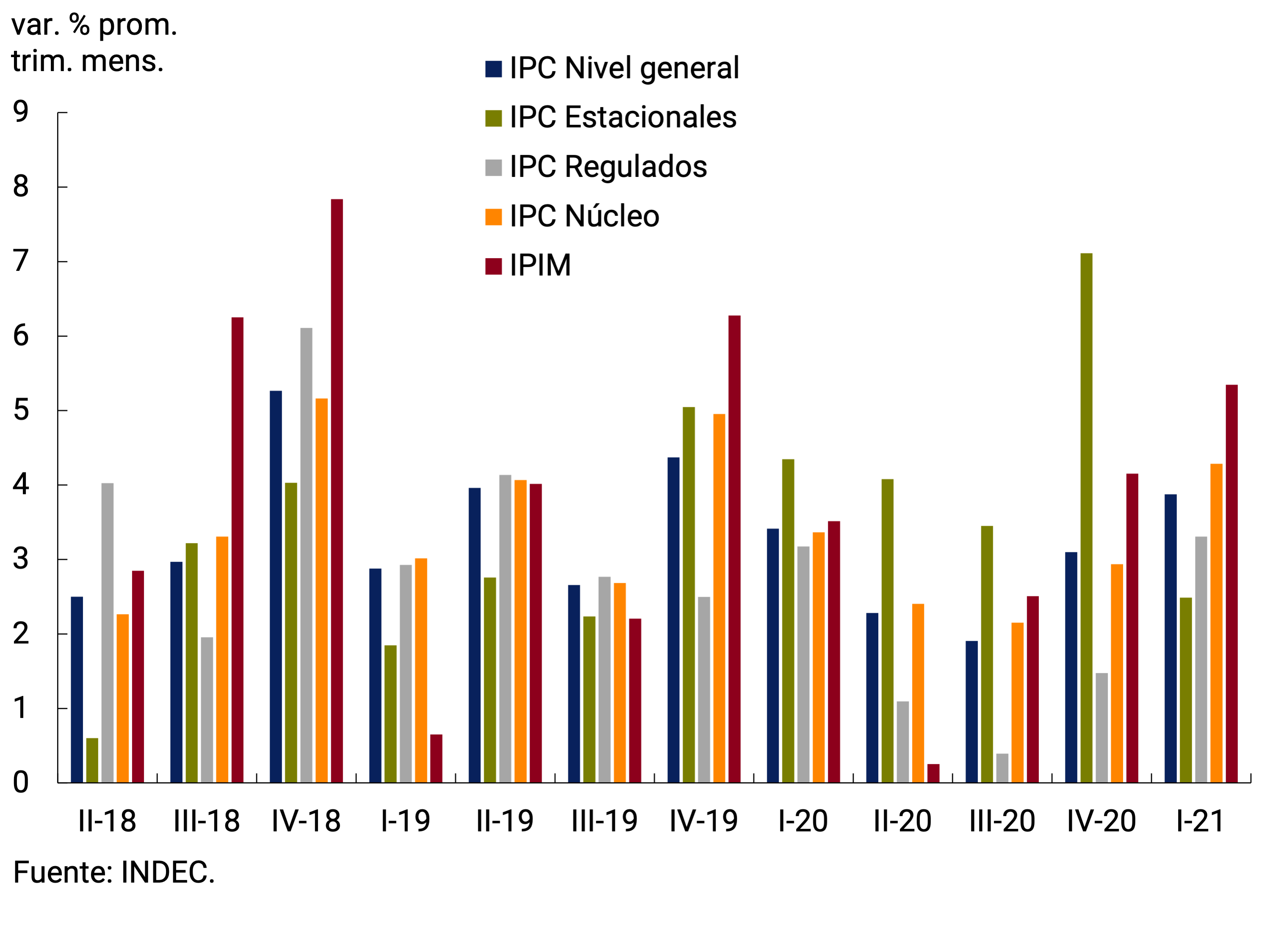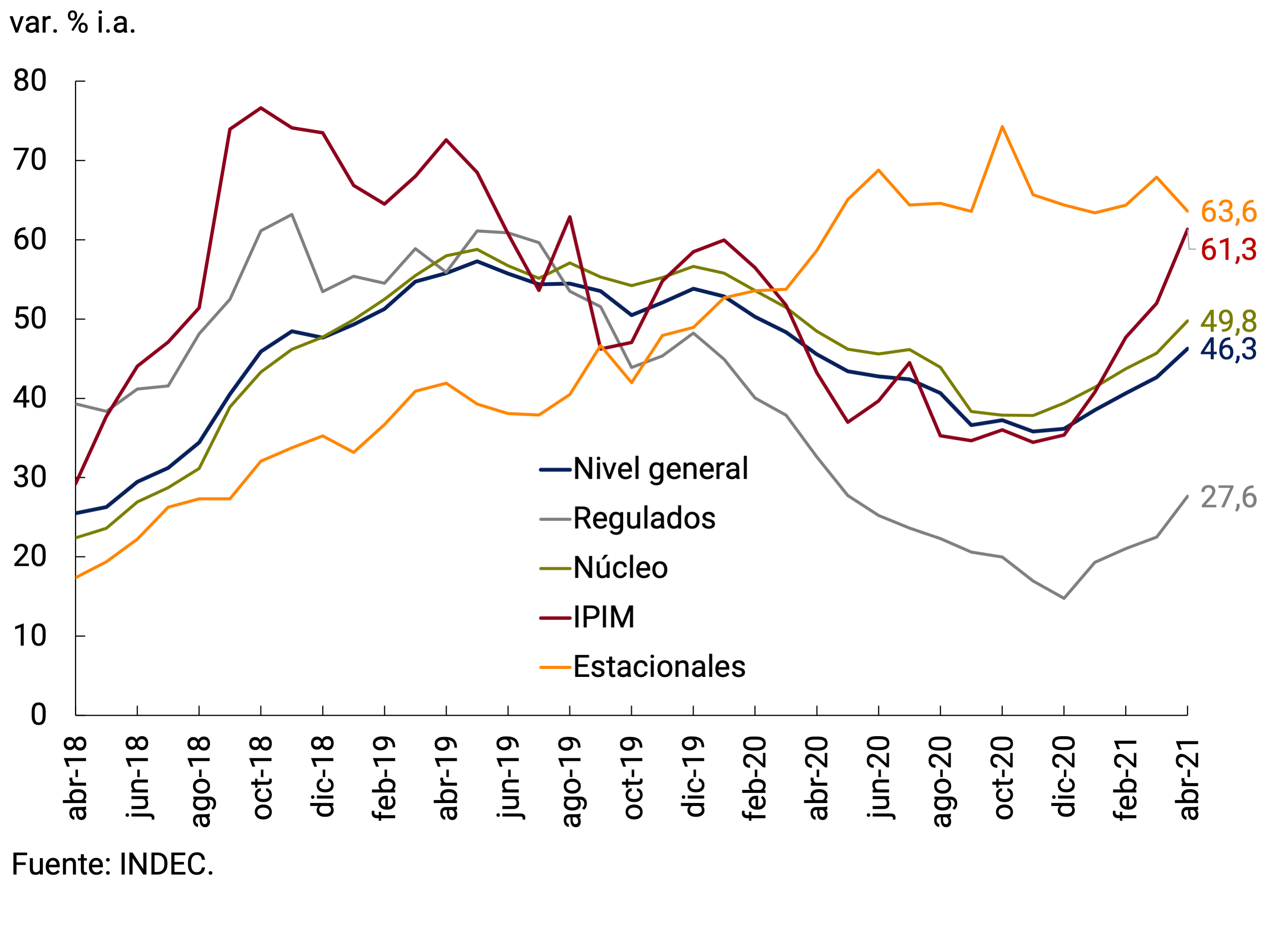 En los últimos meses, como veníamos adelantando en ediciones previas del IPOM, diversos factores tales como la recuperación del precio relativo de los servicios, la recomposición de los márgenes de comercialización minorista en algunos sectores, y el avance de los acuerdos paritarios, ejercieron presión sobre el proceso de formación de precios. A ello se sumó el significativo aumento en los precios internacionales de las materias primas y su traslado sobre el precio interno de los alimentos. De este modo, durante el primer cuatrimestre del año la tasa de inflación interanual se aceleró 10,2 p.p., hasta 46,3%. Dada la naturaleza transitoria de varios de estos shocks, se espera que en los próximos meses la inflación inicie un proceso de descenso gradual y sostenido.
