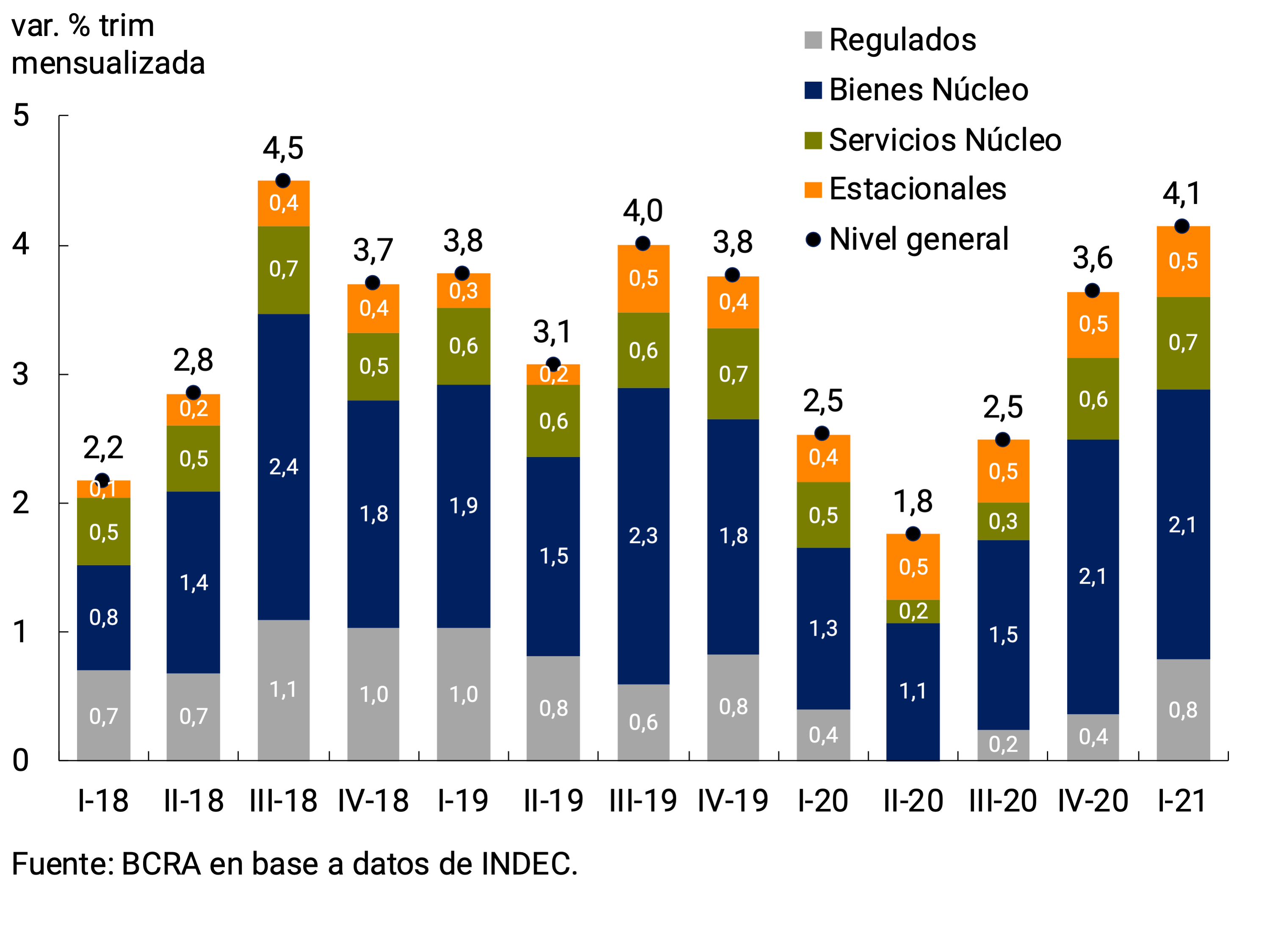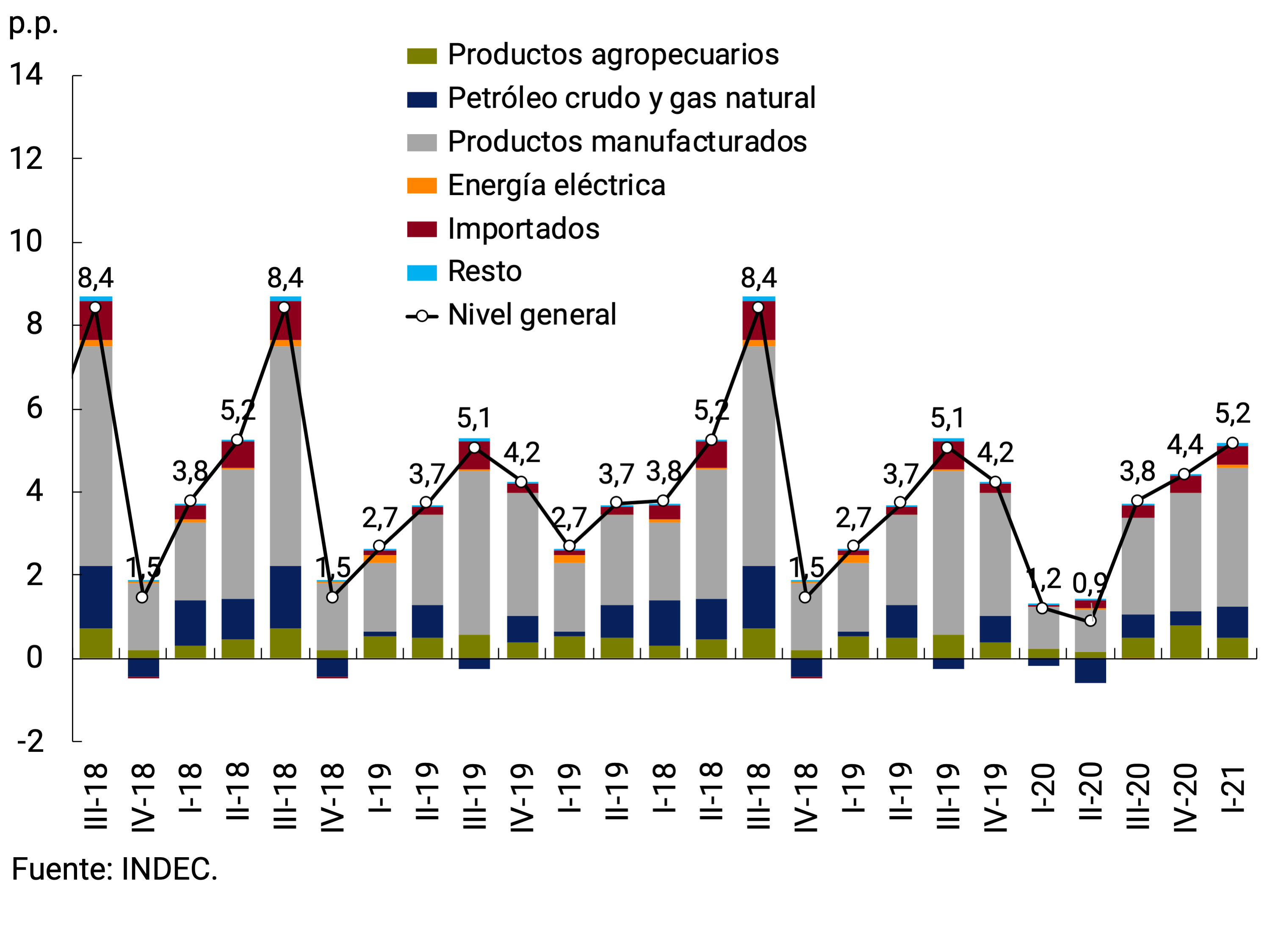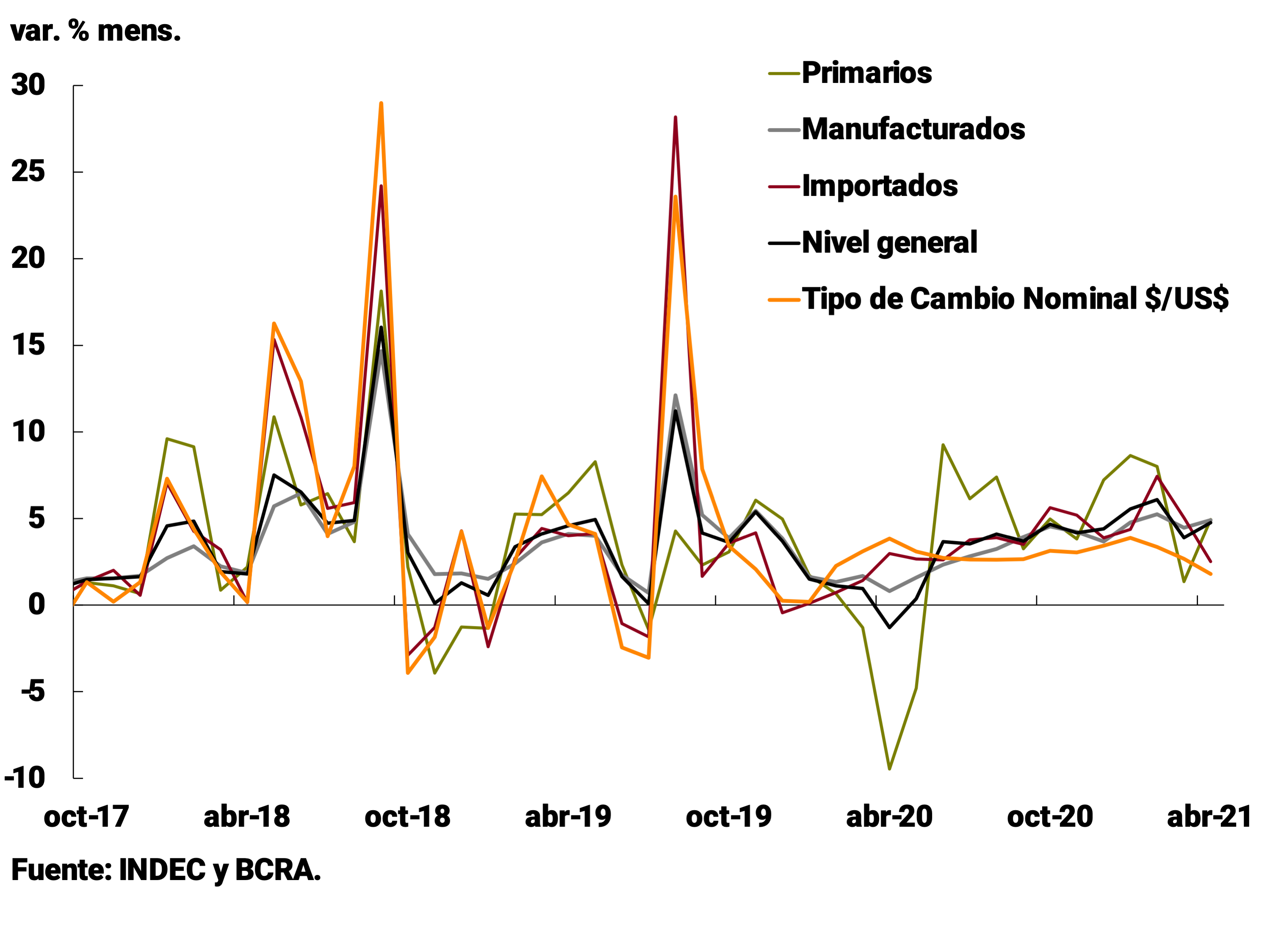 En los últimos meses, como veníamos adelantando en ediciones previas del IPOM, diversos factores tales como la recuperación del precio relativo de los servicios, la recomposición de los márgenes de comercialización minorista en algunos sectores, y el avance de los acuerdos paritarios, ejercieron presión sobre el proceso de formación de precios. A ello se sumó el significativo aumento en los precios internacionales de las materias primas y su traslado sobre el precio interno de los alimentos. De este modo, durante el primer cuatrimestre del año la tasa de inflación interanual se aceleró 10,2 p.p., hasta 46,3%. Dada la naturaleza transitoria de varios de estos shocks, se espera que en los próximos meses la inflación inicie un proceso de descenso gradual y sostenido.