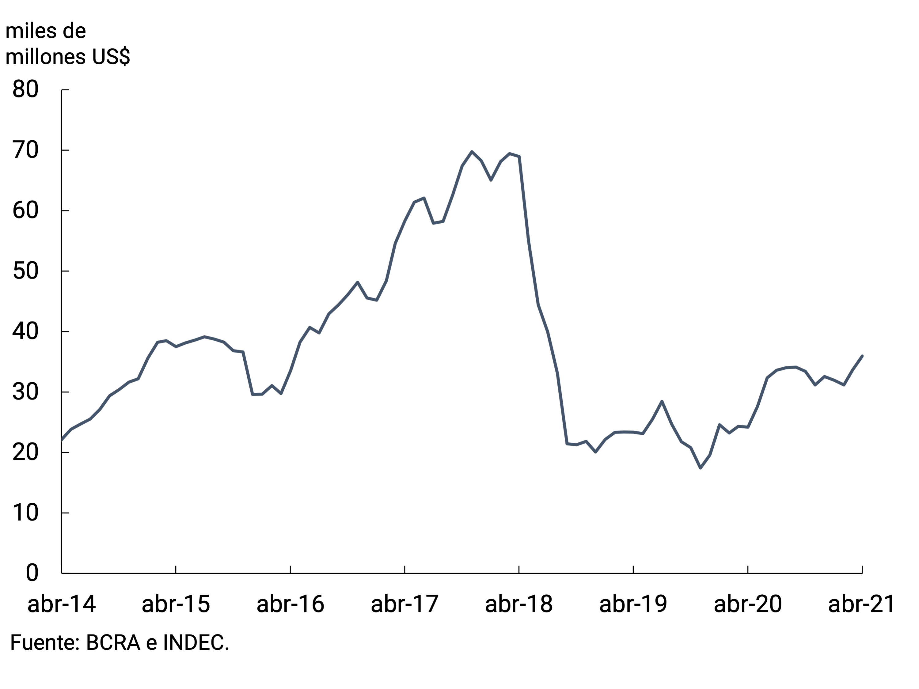 No obstante, la materialización de riesgos a la baja contemplados en el escenario central de actividad generó un mayor grado de incertidumbre respecto de su evolución para el resto del año. Hacia inicios de marzo, en el AMBA aumentó la velocidad de contagios en simultáneo con la aparición de nuevas cepas en el país. Esta desmejora de la situación epidemiológica implicó nuevas restricciones a la movilidad y al normal funcionamiento de actividades en abril, las cuales fueron profundizadas en mayo20. Estas medidas, de menor intensidad y alcance que las de abril y marzo de 2020, se verán reflejadas en la actividad económica agregada durante los próximos meses. El BCRA espera en este nuevo escenario, una transitoria interrupción del proceso de recuperación de la actividad en el segundo trimestre, asociada a efectos tanto directos como indirectos del nuevo contexto sanitario. Para el resto del año se espera que la actividad retome el sendero de recuperación, en un marco de elevado grado de adaptación de familias y empresas a operar en pandemia, al mismo tiempo que avanza el proceso de vacunación.