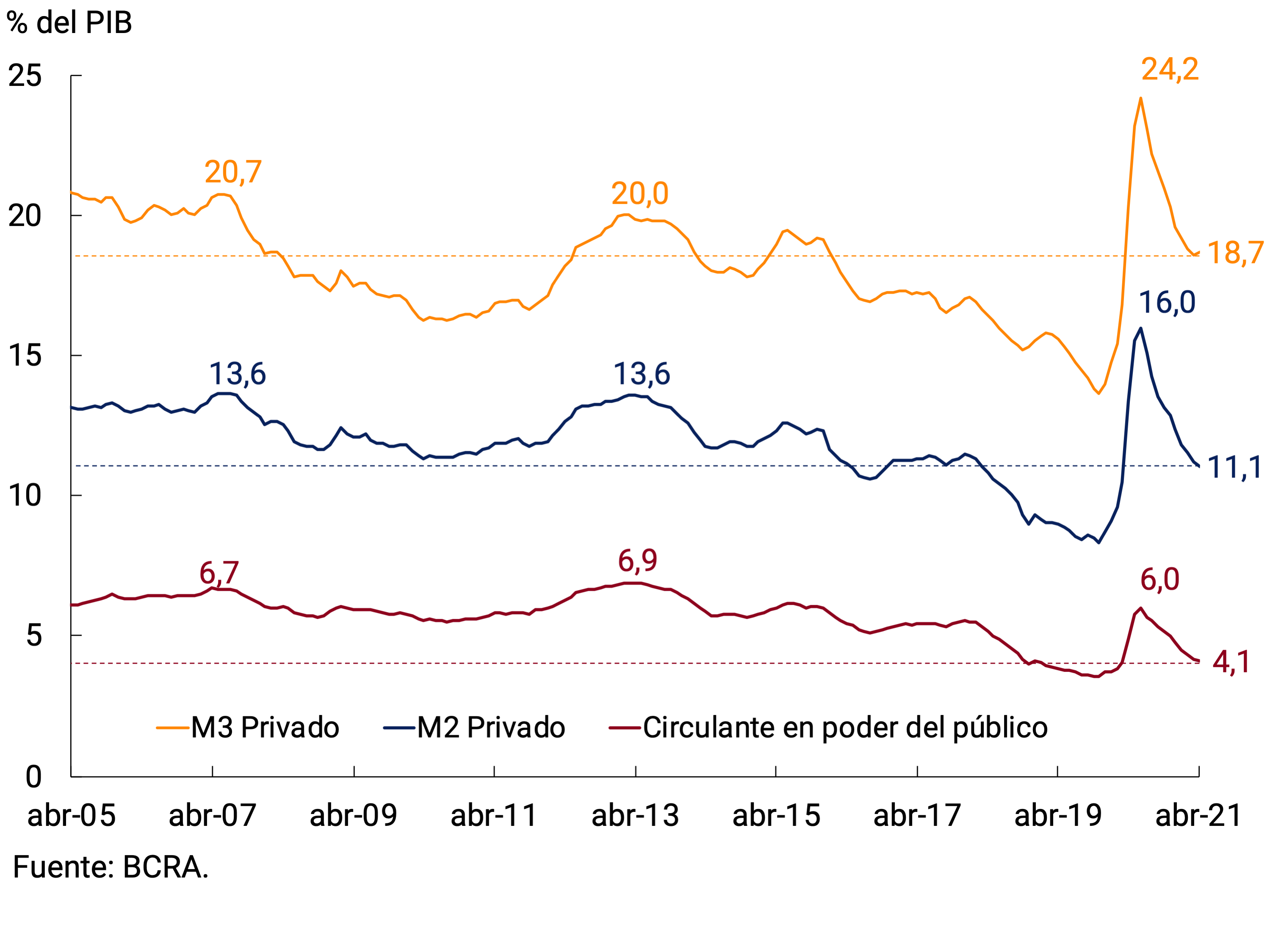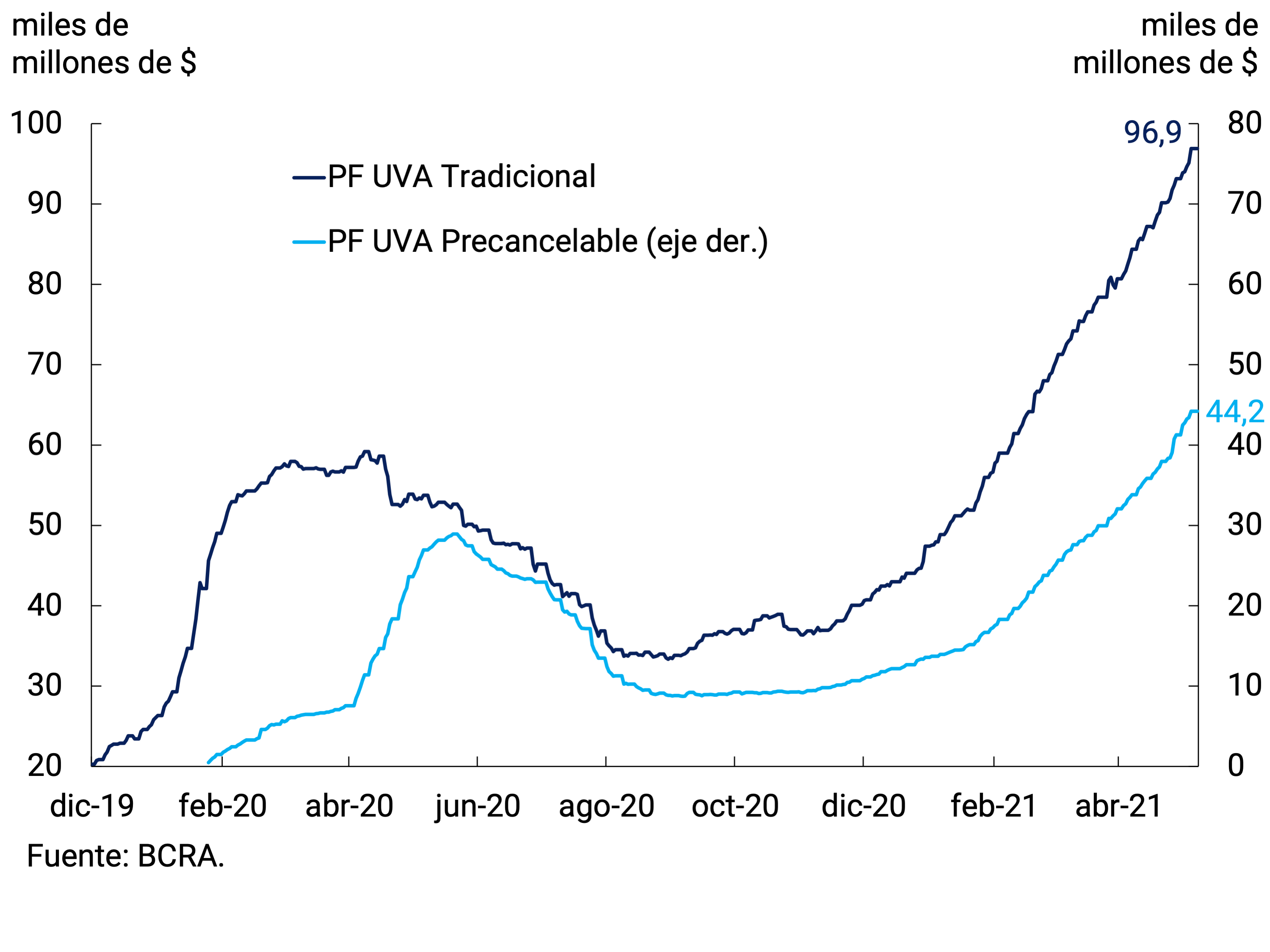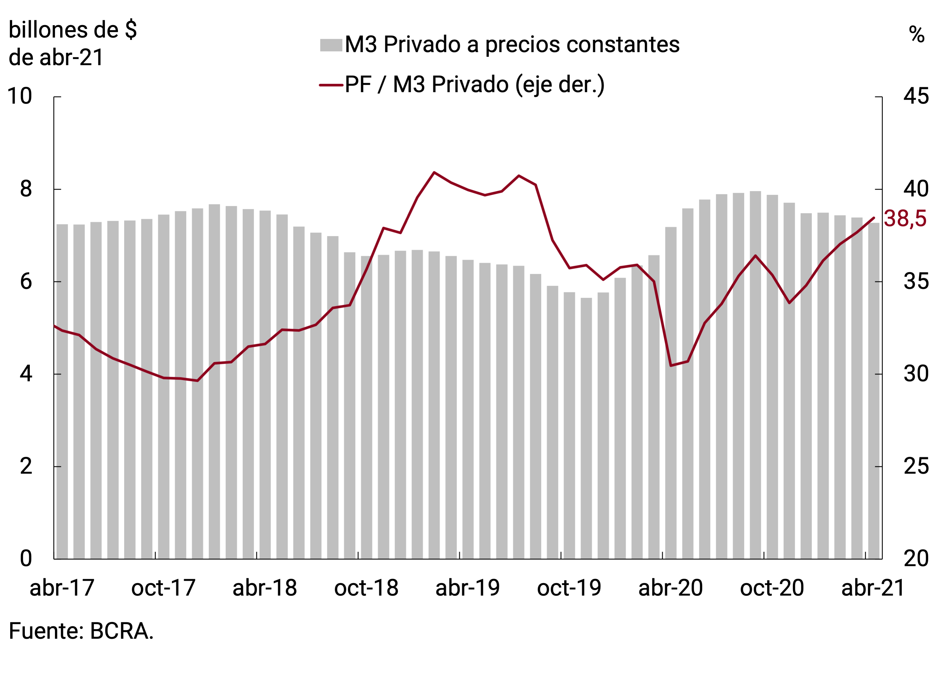Los agregados monetarios continuaron con el proceso de moderación iniciado en el último cuatrimestre de 2020. En lo que va de 2021 los medios de pago presentaron una continua caída en términos reales, que fue explicada tanto por los depósitos a la vista como por el circulante en poder del público. En términos del PIB, dichos agregados se ubicaron en torno a su promedio histórico. Un factor que contribuyó al bajo dinamismo que presentaron los medios de pago fue la demanda de instrumentos de ahorro denominados en pesos. Los depósitos a plazo crecieron a un ritmo promedio mensual de 1,9% real sin estacionalidad durante el primer cuatrimestre del año. Un segmento que se destacó especialmente es el denominado en UVA, cuyas colocaciones tradicionales crecieron a un promedio mensual del 14,2% real, en tanto que las colocaciones precancelables, que tienen una tasa garantizada real del 1%, se expandieron a un promedio mensual del 25,4% real.