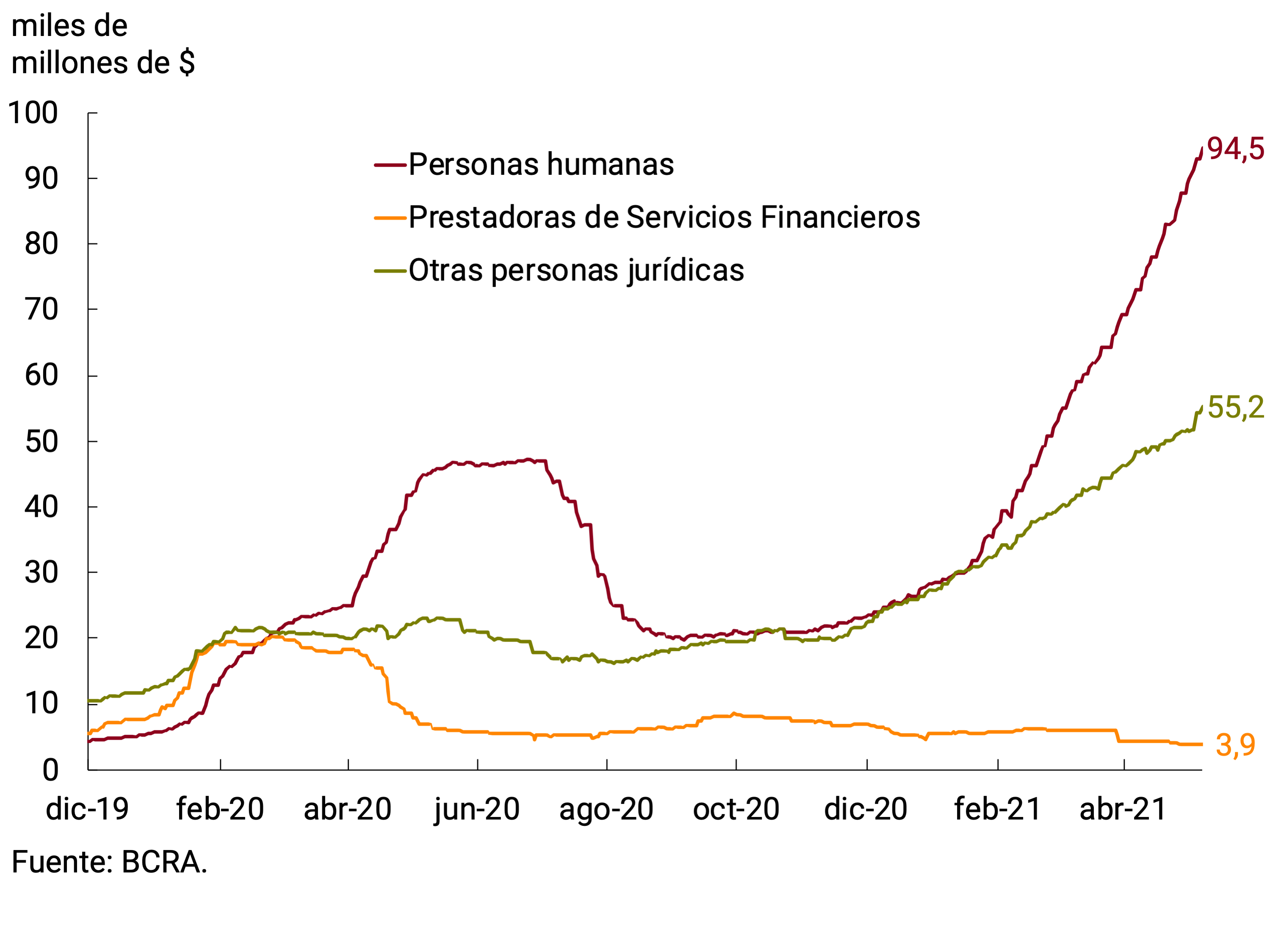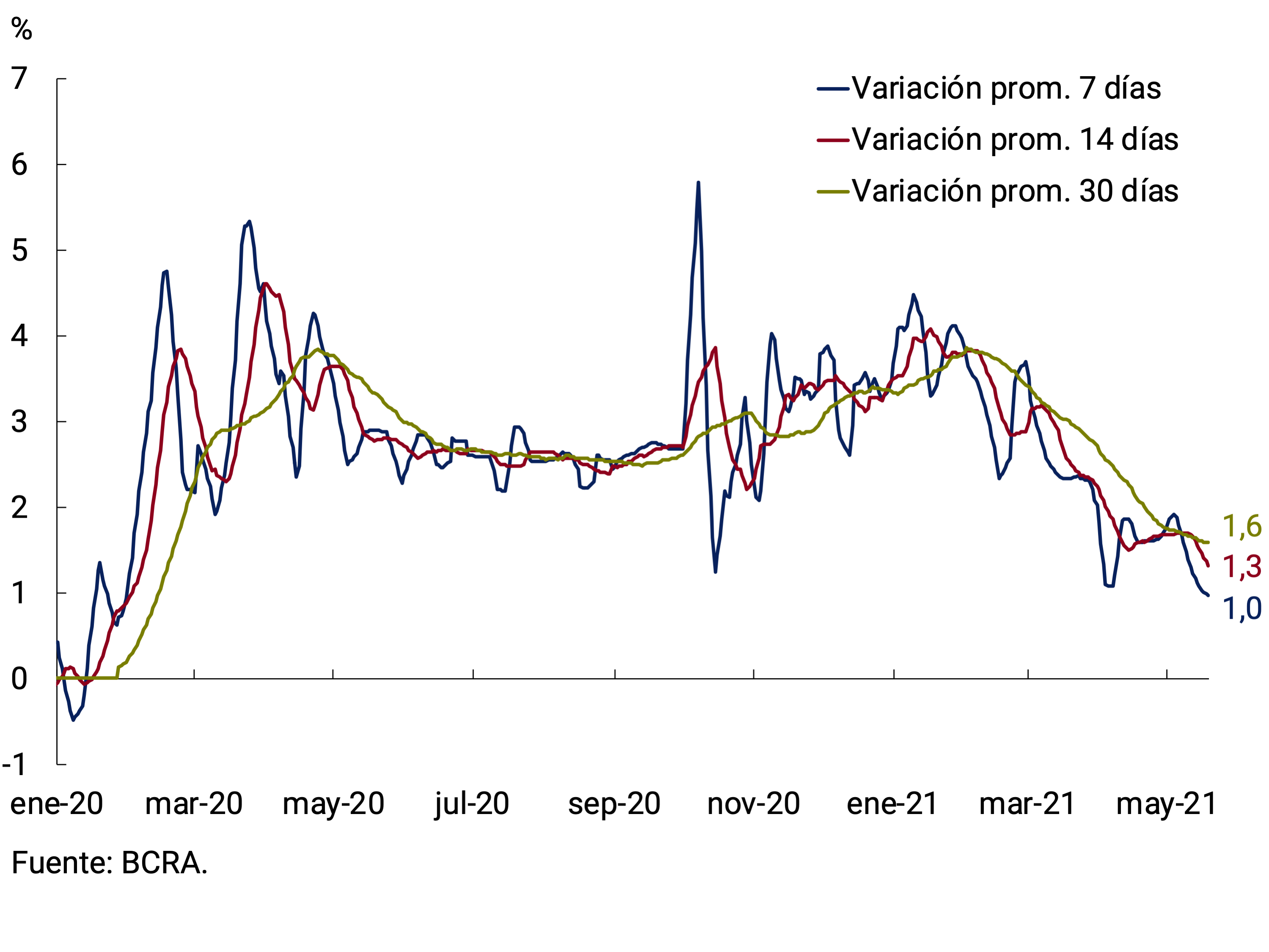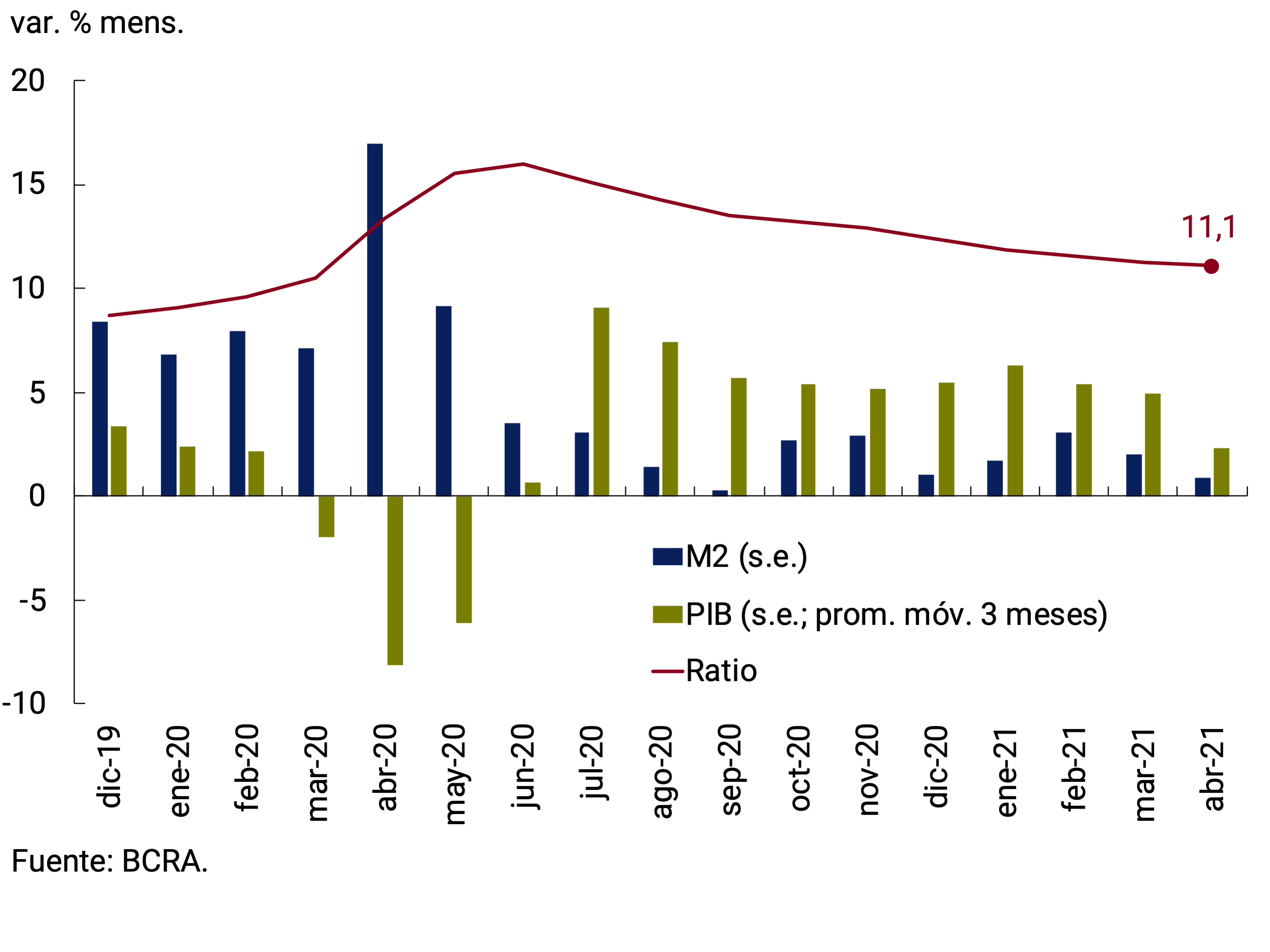 Los agregados monetarios continuaron con el proceso de moderación iniciado en el último cuatrimestre de 2020. En lo que va de 2021 los medios de pago presentaron una continua caída en términos reales, que fue explicada tanto por los depósitos a la vista como por el circulante en poder del público. En términos del PIB, dichos agregados se ubicaron en torno a su promedio histórico. Un factor que contribuyó al bajo dinamismo que presentaron los medios de pago fue la demanda de instrumentos de ahorro denominados en pesos. Los depósitos a plazo crecieron a un ritmo promedio mensual de 1,9% real sin estacionalidad durante el primer cuatrimestre del año. Un segmento que se destacó especialmente es el denominado en UVA, cuyas colocaciones tradicionales crecieron a un promedio mensual del 14,2% real, en tanto que las colocaciones precancelables, que tienen una tasa garantizada real del 1%, se expandieron a un promedio mensual del 25,4% real.
