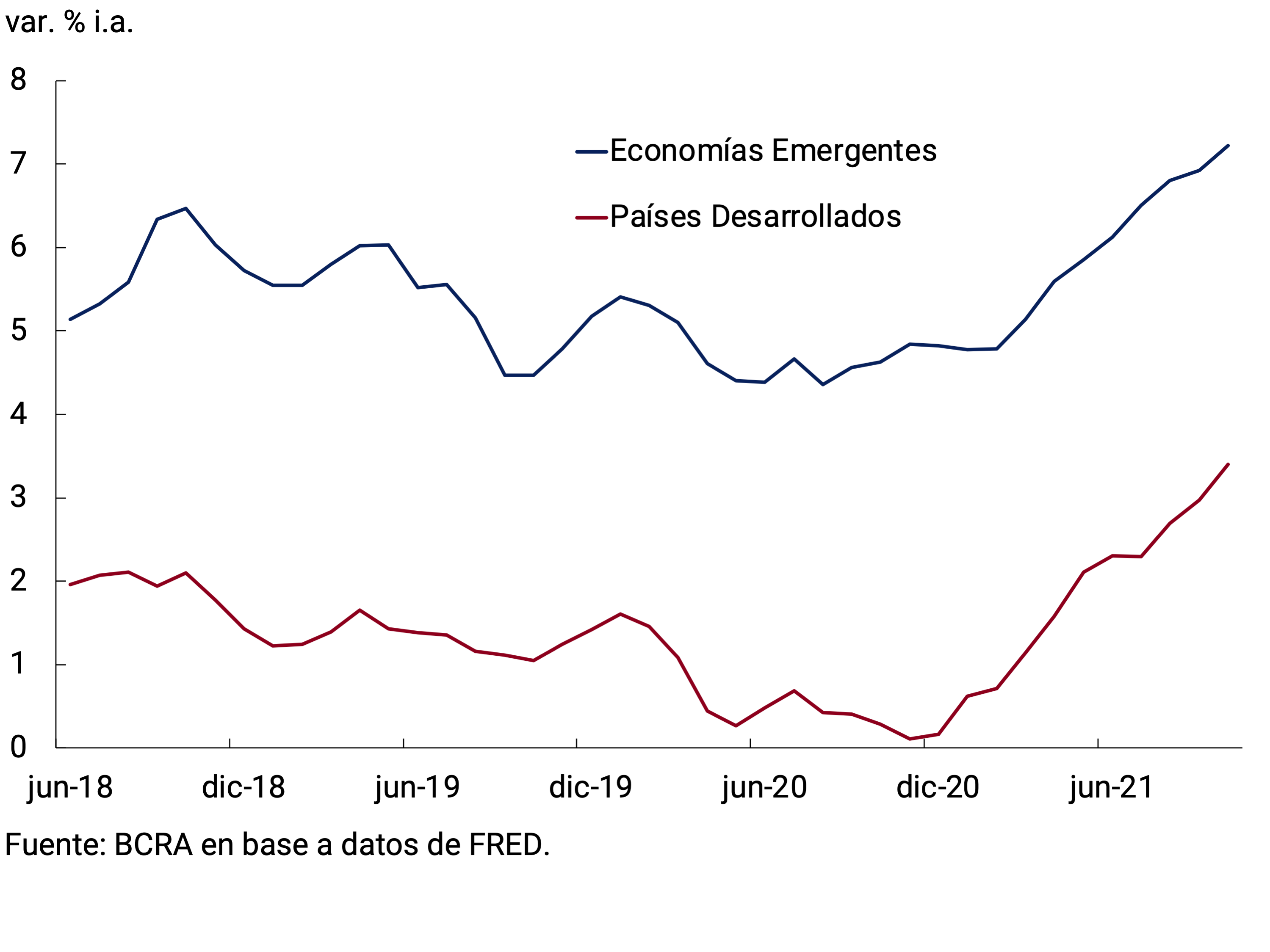 Los bancos centrales de países emergentes continuaron tomando medidas de política monetaria con sesgo contractivo. En tanto, los bancos centrales de países desarrollados han mantenido en buena medida las medidas monetarias expansivas, pero han empezado a retirar parte del estímulo cuantitativo; ello genera el riesgo de derrames negativos sobre los países en desarrollo.