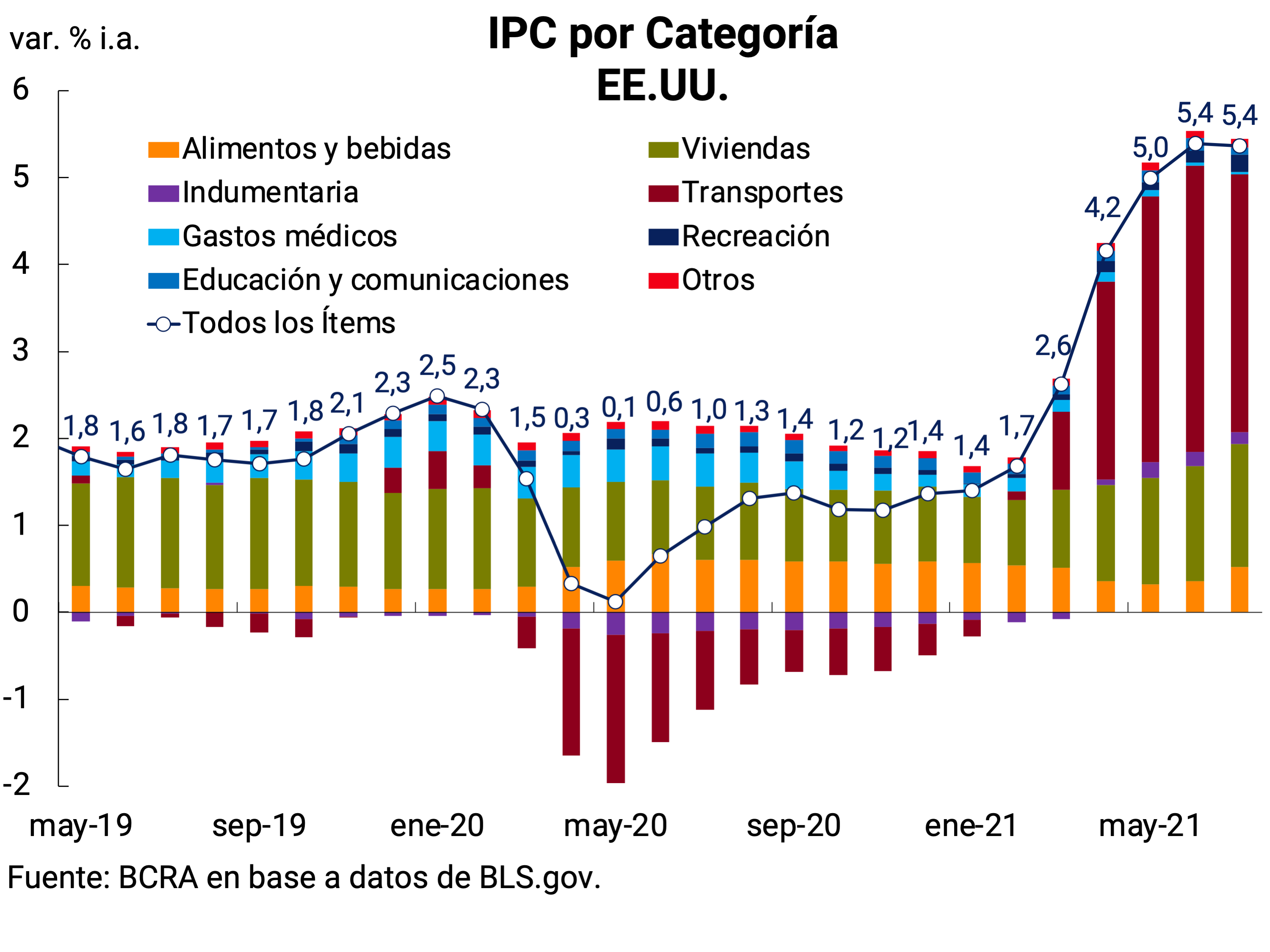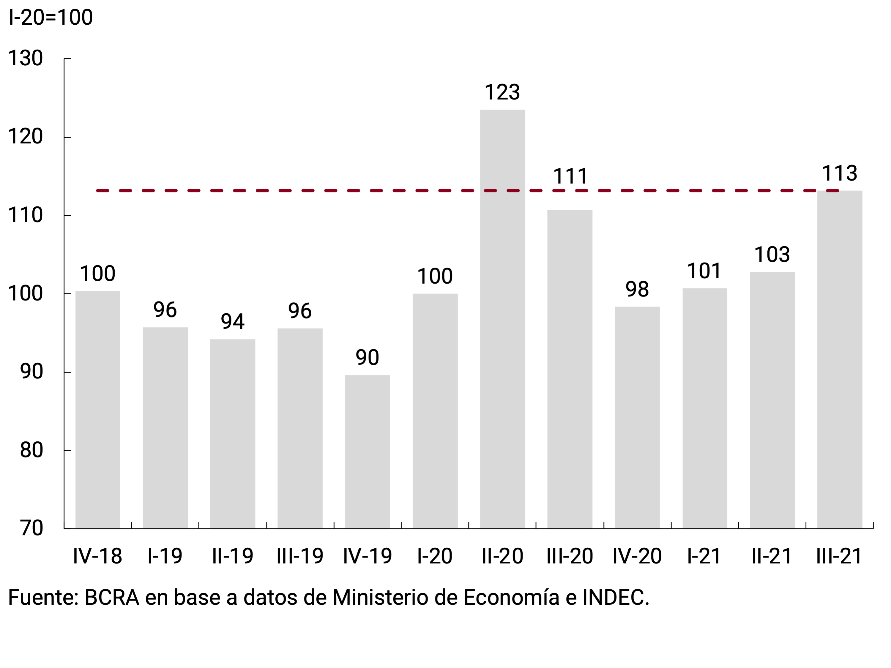 Tras los avances en el esquema de vacunación de la población que permitió controlar la situación epidemiológica, se espera que todos los sectores productivos afiancen el proceso de “normalización” de sus niveles de actividad. Durante el tercer trimestre el Gobierno Nacional anunció una serie de medidas adicionales orientadas a favorecer a aquellos sectores más rezagados y a las familias que quedaron postergados en el proceso de recuperación, las cuales contemplaron políticas de estímulo al crédito. Se favoreció la innovación tecnológica, la creación de empleo formal, el aumento de la inversión productiva y la capacidad exportadora de algunos sectores considerados estratégicos14.