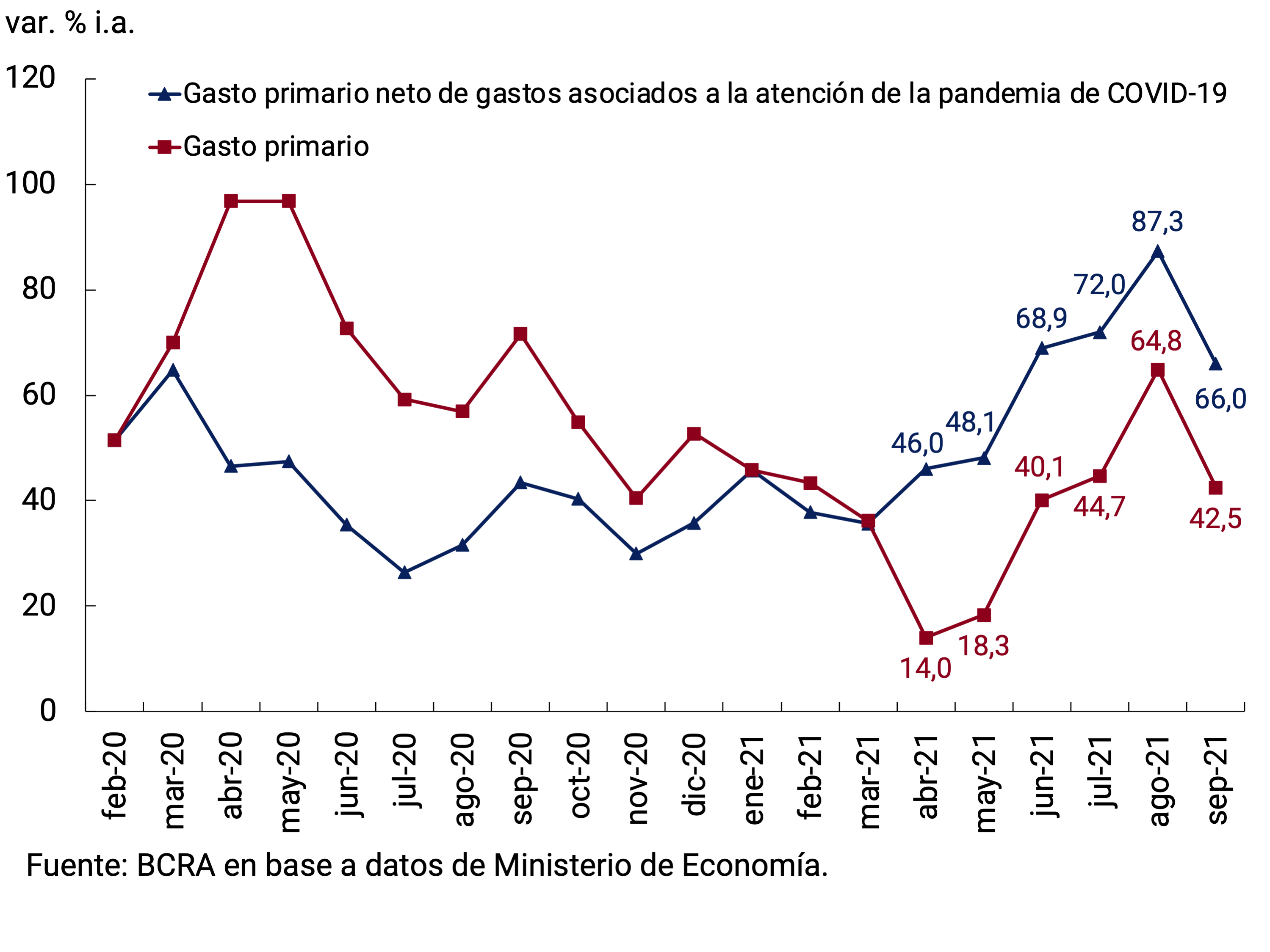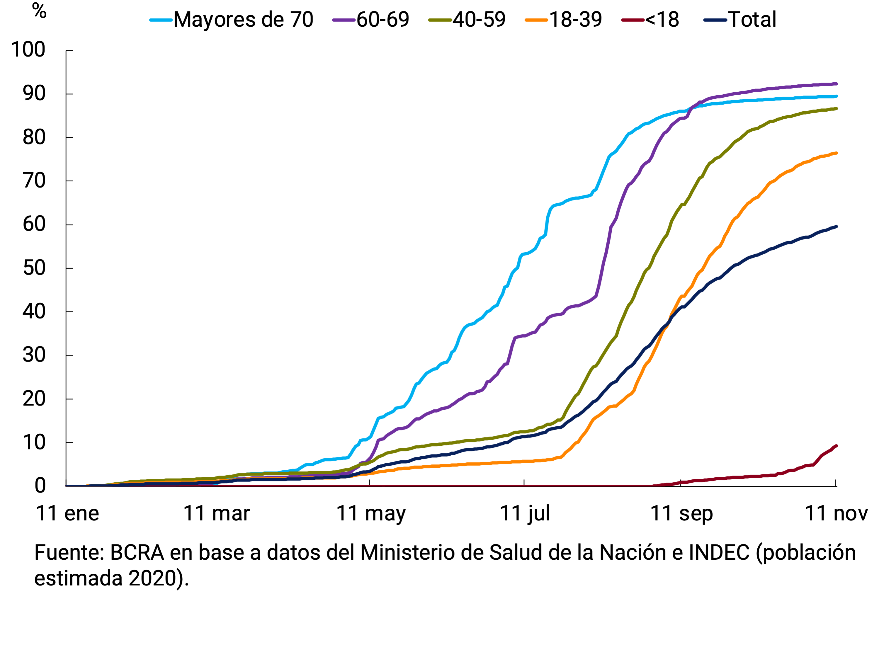 El avance acelerado del proceso de vacunación desde el mes de junio permitió mejorar significativamente la situación epidemiológica e implementar un proceso de reaperturas progresivas y sostenidas, en simultáneo con la ampliación gradual —y en algunos casos eliminación— de los aforos en diversas actividades (Ver Apartado 2 / La vacunación como determinante clave de la evolución de la actividad económica). En este contexto de avance hacia una nueva normalidad, el Gobierno Nacional estableció diversas políticas orientadas a sectores estratégicos para el aumento de exportaciones y la recuperación del empleo y de los ingresos, sosteniendo políticas focalizadas en los sectores en los que la velocidad de recuperación ha sido más lenta. Por su parte, el BCRA continuó contribuyendo al proceso de normalización económica a través de nuevas líneas de crédito orientadas a fomentar una recuperación equilibrada y sostenida y de la continuidad de políticas de fomento al consumo privado (Ver Capítulo 7. Política Monetaria).