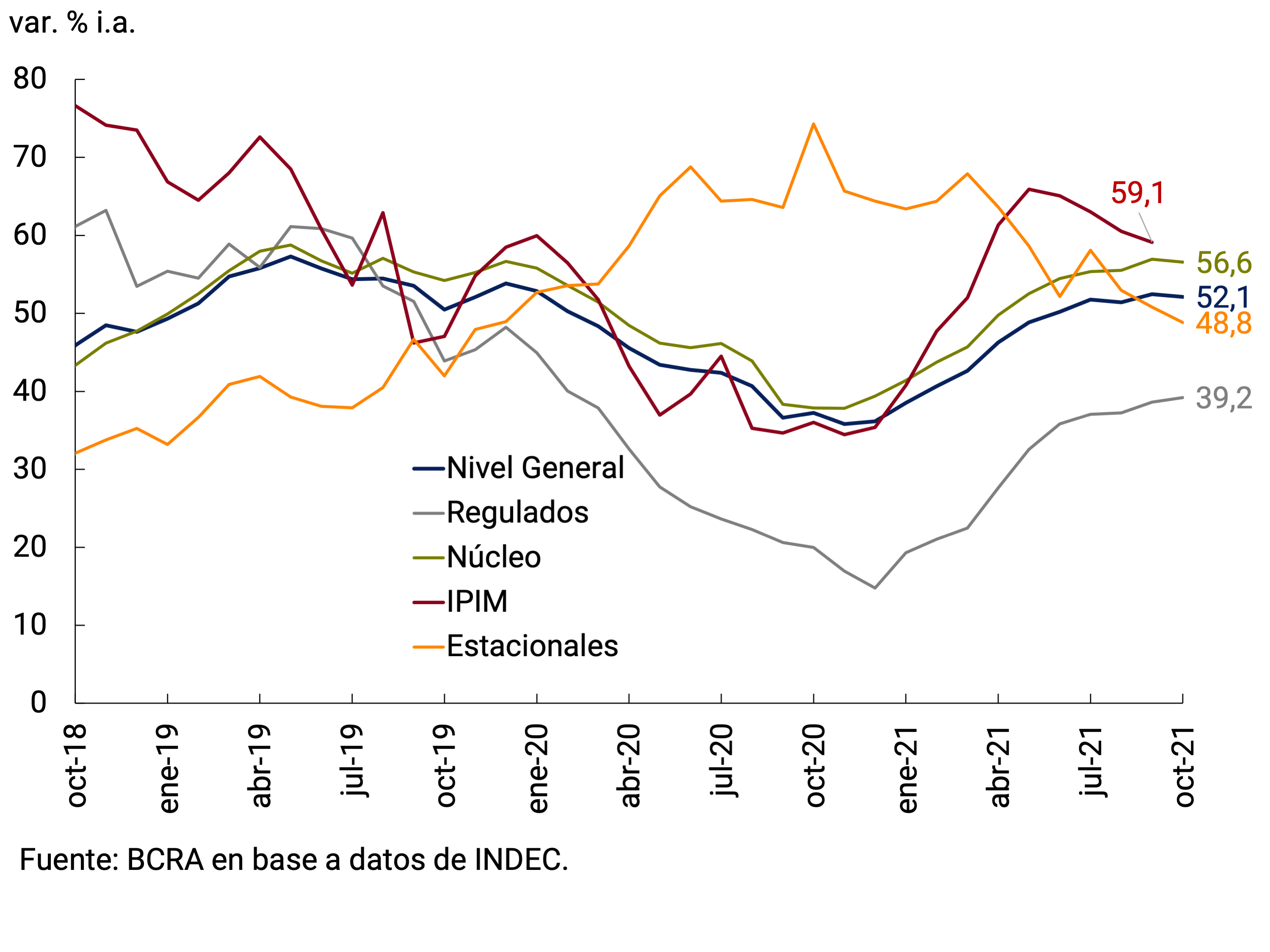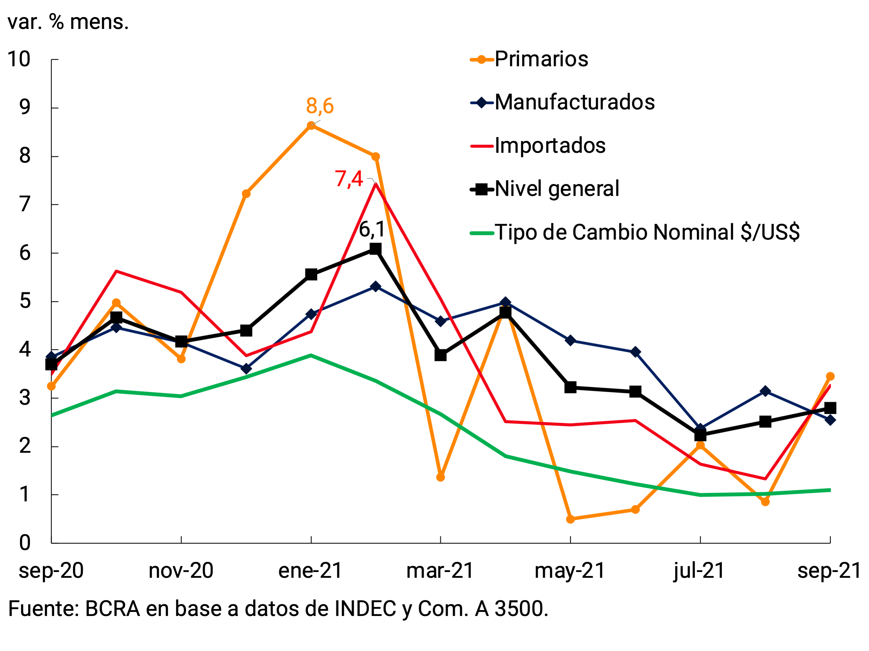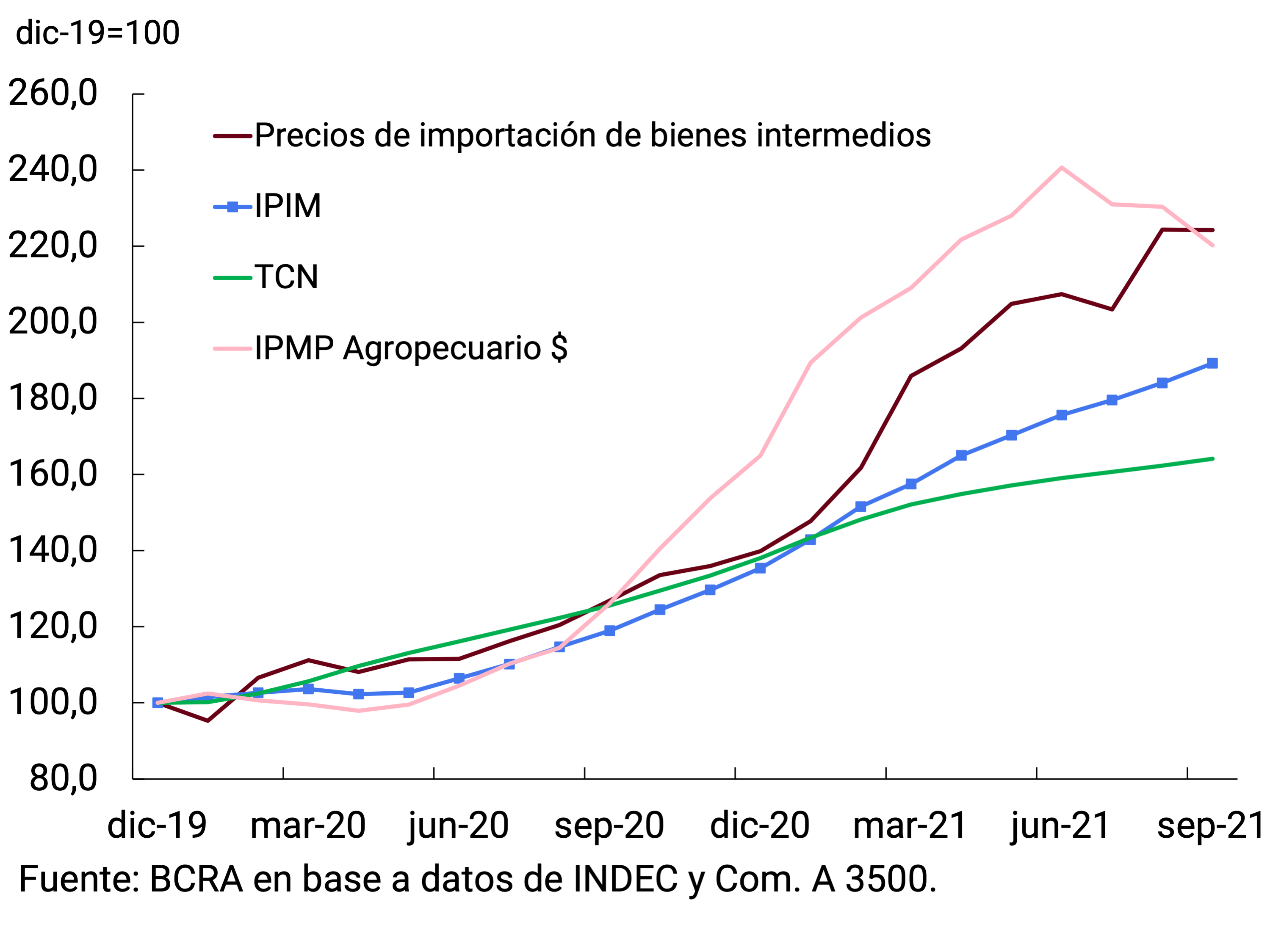 1. Política monetaria: evaluación y perspectivasEl contexto internacional continúa siendo favorable para la Argentina. La economía global siguió recuperándose durante el tercer trimestre del año, aunque a un ritmo menor que en los meses previos. Los últimos pronósticos mantuvieron prácticamente sin cambios las proyecciones de crecimiento de la economía global para este año y el próximo (5,8% y 4,8%, respectivamente). Por otra parte, si bien con una reducción en el margen, los precios de las materias primas que exporta el país permanecieron en niveles elevados en términos históricos. Hacia delante, los riesgos externos están vinculados principalmente a las implicancias de la suba del precio internacional de la energía que, en un marco de expectativas inflacionarias al alza en los países avanzados, podría acelerar la reducción de los estímulos monetarios desplegados durante la crisis y ralentizar el crecimiento global. En el mismo sentido podrían repercutir eventuales rebrotes de la variante Delta o la expansión de nuevas cepas del COVID-19 que obliguen a reimponer medidas sanitarias que restrinjan la circulación.En Argentina desde junio se observó una sistemática caída en la tasa de contagios de COVID-19, la cual alcanzó niveles mínimos en octubre. Esta mejora en la situación epidemiológica fue posible gracias al importante avance logrado en la campaña de vacunación. El menor impacto económico de la segunda ola y la rápida recuperación posterior permitieron lograr una continuidad en el proceso de reapertura y dinamización de la economía local, aunque con desempeños sectoriales aún heterogéneos. Se estima que la actividad continuará recuperándose en lo que resta del año, impulsada por las flexibilizaciones tanto de actividades como de aforos, respaldadas por una mayor cobertura de vacunación con esquemas completos de la población, y por las políticas de estímulo implementadas por el Gobierno Nacional y el BCRA. Con todo, el PIB crecería cerca de 9% en 2021, traduciéndose también en mejoras en el empleo.En este entorno macroeconómico más dinámico, la inflación minorista de septiembre y octubre se ubicó en 3,5%, por encima del promedio mensual observado durante el tercer trimestre de 3%. La inflación núcleo, esencialmente menos volátil, también se mantuvo en un valor elevado desde julio, cercano a 3,2%. Sobre una inercia inflacionaria que se mantiene en valores altos en los últimos meses se sumaron, con mayor intensidad a la esperada, factores transitorios anticipados en versiones anteriores del IPOM. Entre ellos se destacan la incidencia de los precios internacionales, últimamente más vinculados a los precios de la energía y al costo de las manufacturas globales, la recomposición observada de los márgenes de comercialización en ciertos sectores y el reacomodamiento de precios relativos de los servicios privados ante la reapertura de actividades en el marco de la mejora en la situación epidemiológica y, en menor medida, a las actualizaciones de las paritarias salariales. Ello se dio en un contexto donde el proceso electoral imprimió mayor volatilidad a las expectativas cambiarias.El BCRA enfrentó estas semanas de mayor volatilidad financiera, calibrando su intervención en los mercados de cambios spot y a término y adaptando la regulación cambiaria a los fines de preservar la estabilidad cambiaria. Cabe destacar que, entre enero y octubre la autoridad monetaria acumuló compras en el mercado de cambios por US$6.421 millones, constituyendo el máximo valor desde 2012 para los primeros 10 meses del año, mientras que las reservas internacionales aumentaron US$3.430 millones en el mismo período, considerando principalmente las cancelaciones netas de capital e intereses de deuda en moneda extranjera del Gobierno Nacional y las operaciones de mercado abierto del BCRA. Al cierre de esta edición, contando también con el ingreso de la asignación de Derechos Especiales de Giro (DEGs) por parte del FMI para mitigar los efectos de la pandemia, las reservas internacionales su ubicaban en torno a US$42,6 mil millones y, pese al menor dinamismo del tipo de cambio nominal de los últimos meses, el ITCRM permanecía en niveles competitivos y en torno al promedio de los últimos 24 años.El BCRA calibra la liquidez de la economía, esterilizando eventuales excedentes, para contribuir a preservar el equilibrio monetario. Al respecto, en lo que va del año la expansión primaria vinculada al sector público se ubicó en niveles sensiblemente menores a los del año previo de pandemia, reflejando valores respecto del PIB similares a los de años previos. En este sentido, en el tercer trimestre del año el crecimiento de la base monetaria fue de 8,6%, manteniendo en octubre una tasa de expansión similar a la de los tres meses previos. En términos interanuales y a precios constantes la base continuó contrayéndose, alcanzando en octubre una variación de -17,1%, lo que la ubicó en términos del PIB en registros similares a los de mediados de 2003.En apoyo a la recuperación económica, el BCRA continuó con su política de crédito focalizada en los sectores más rezagados y en el impulso al desarrollo productivo. La Línea de Financiamiento a la Inversión Productiva (LFIP) continuó siendo el principal vehículo para canalizar el crédito productivo a las MiPyMEs bajo condiciones financieras favorables. Desde su implementación, y con datos al 31 de octubre, la LFIP acumula desembolsos por un total de $1.187.780 millones. Recientemente el BCRA dispuso prorrogar la vigencia de la LFIP hasta fines de marzo de 2022, extendiéndola a algunos sectores específicos. Con el impulso de la LFIP el saldo de crédito a las empresas de menor tamaño relativo presentó un sostenido aumento en términos reales desde principios de agosto, registrando una suba promedio mensual en el tercer trimestre de 2% y acelerándose hasta 4,9% real s.e. en o