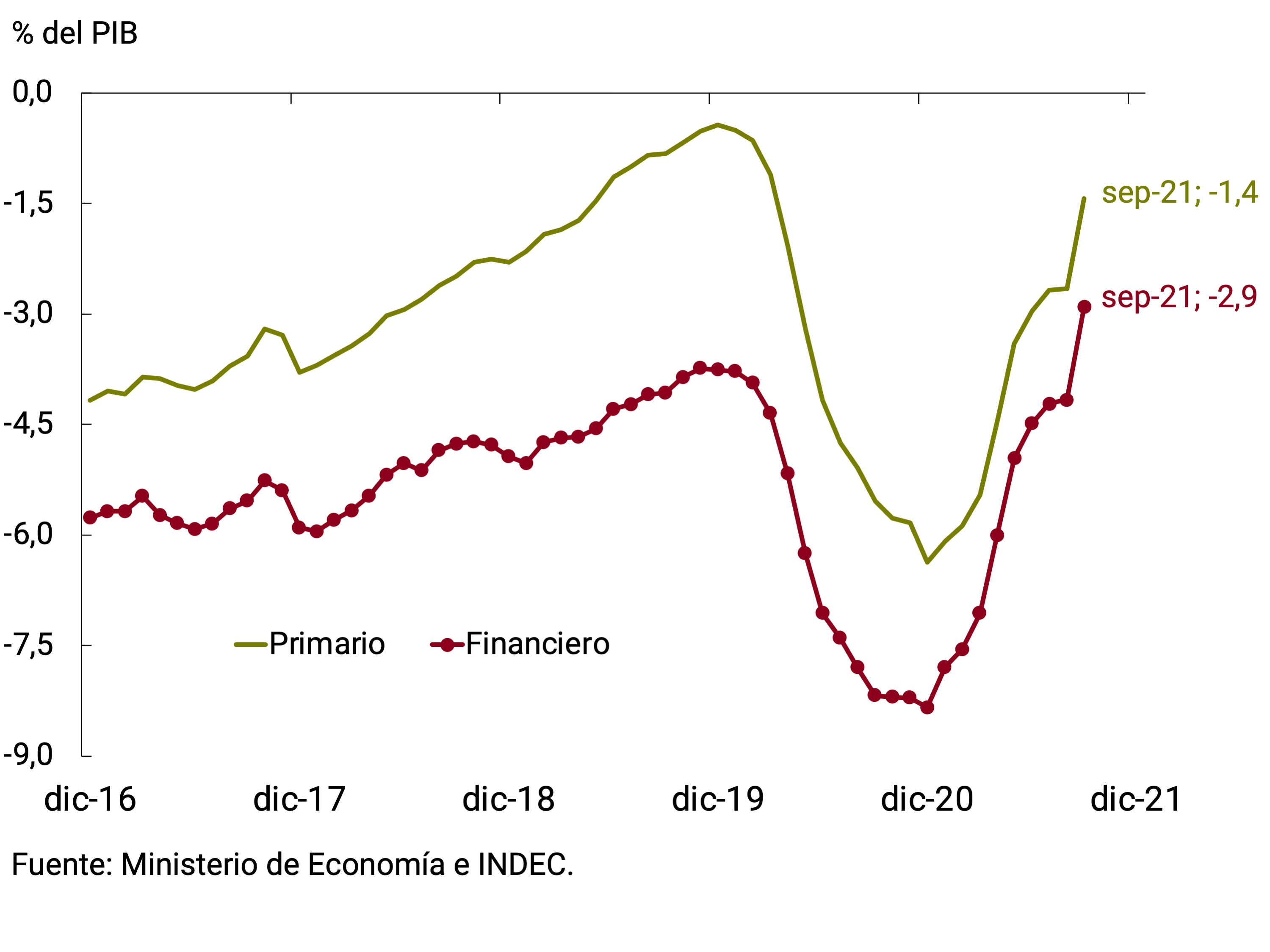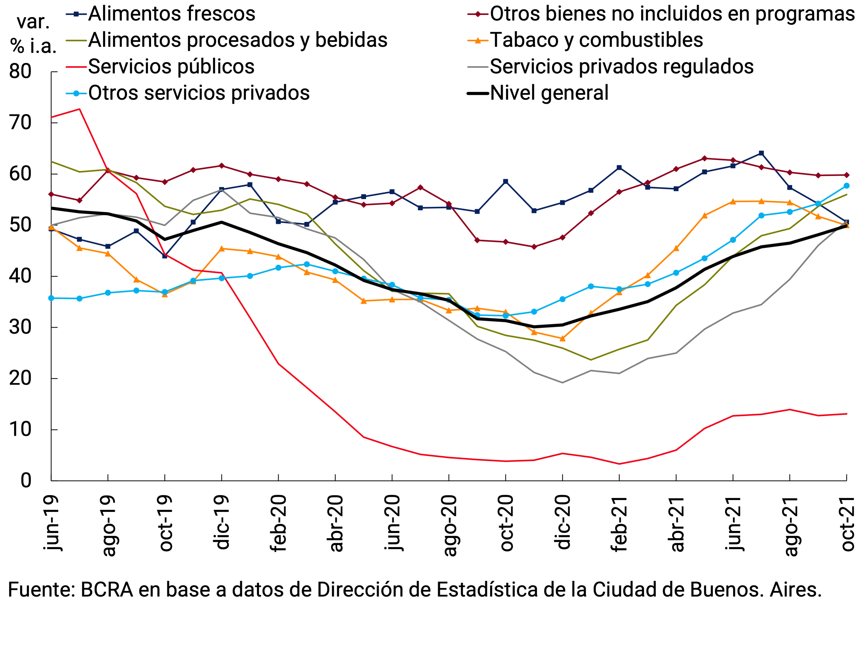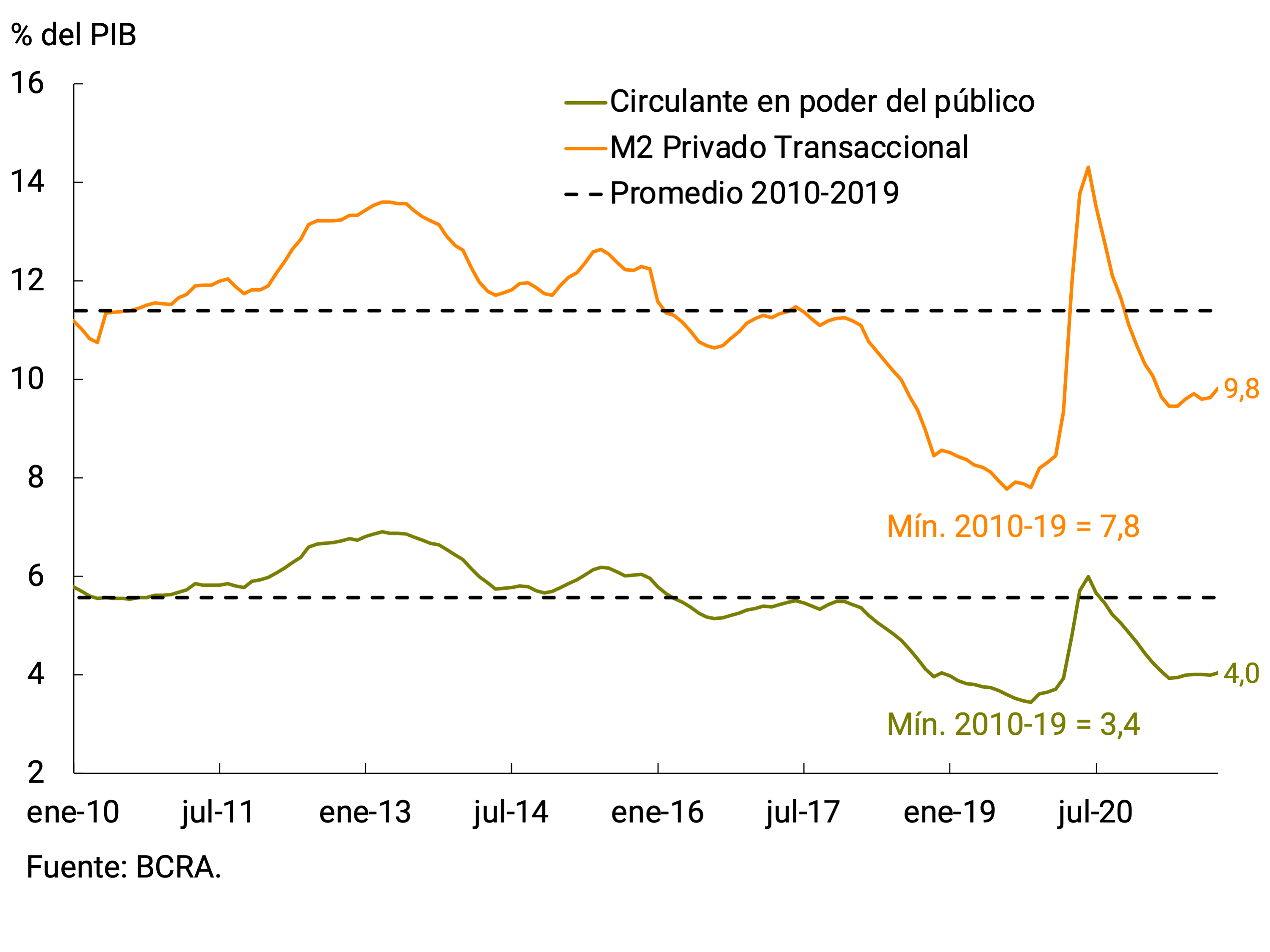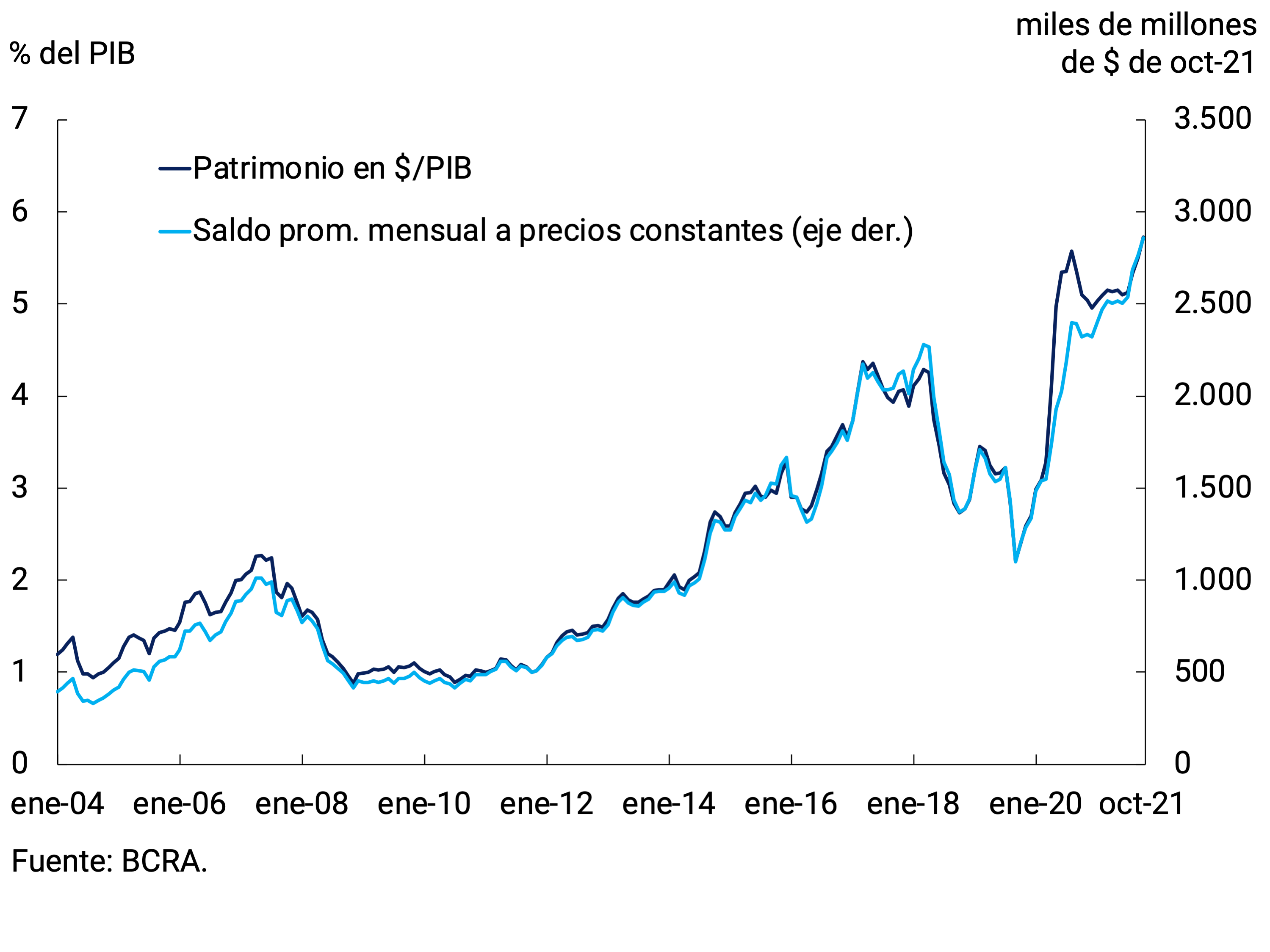 1. Política monetaria: evaluación y perspectivasEl contexto internacional continúa siendo favorable para la Argentina. La economía global siguió recuperándose durante el tercer trimestre del año, aunque a un ritmo menor que en los meses previos. Los últimos pronósticos mantuvieron prácticamente sin cambios las proyecciones de crecimiento de la economía global para este año y el próximo (5,8% y 4,8%, respectivamente). Por otra parte, si bien con una reducción en el margen, los precios de las materias primas que exporta el país permanecieron en niveles elevados en términos históricos. Hacia delante, los riesgos externos están vinculados principalmente a las implicancias de la suba del precio internacional de la energía que, en un marco de expectativas inflacionarias al alza en los países avanzados, podría acelerar la reducción de los estímulos monetarios desplegados durante la crisis y ralentizar el crecimiento global. En el mismo sentido podrían repercutir eventuales rebrotes de la variante Delta o la expansión de nuevas cepas del COVID-19 que obliguen a reimponer medidas sanitarias que restrinjan la circulación.En Argentina desde junio se observó una sistemática caída en la tasa de contagios de COVID-19, la cual alcanzó niveles mínimos en octubre. Esta mejora en la situación epidemiológica fue posible gracias al importante avance logrado en la campaña de vacunación. El menor impacto económico de la segunda ola y la rápida recuperación posterior permitieron lograr una continuidad en el proceso de reapertura y dinamización de la economía local, aunque con desempeños sectoriales aún heterogéneos. Se estima que la actividad continuará recuperándose en lo que resta del año, impulsada por las flexibilizaciones tanto de actividades como de aforos, respaldadas por una mayor cobertura de vacunación con esquemas completos de la población, y por las políticas de estímulo implementadas por el Gobierno Nacional y el BCRA. Con todo, el PIB crecería cerca de 9% en 2021, traduciéndose también en mejoras en el empleo.En este entorno macroeconómico más dinámico, la inflación minorista de septiembre y octubre se ubicó en 3,5%, por encima del promedio mensual observado durante el tercer trimestre de 3%. La inflación núcleo, esencialmente menos volátil, también se mantuvo en un valor elevado desde julio, cercano a 3,2%. Sobre una inercia inflacionaria que se mantiene en valores altos en los últimos meses se sumaron, con mayor intensidad a la esperada, factores transitorios anticipados en versiones anteriores del IPOM. Entre ellos se destacan la incidencia de los precios internacionales, últimamente más vinculados a los precios de la energía y al costo de las manufacturas globales, la recomposición observada de los márgenes de comercialización en ciertos sectores y el reacomodamiento de precios relativos de los servicios privados ante la reapertura de actividades en el marco de la mejora en la situación epidemiológica y, en menor medida, a las actualizaciones de las paritarias salariales. Ello se dio en un contexto donde el proceso electoral imprimió mayor volatilidad a las expectativas cambiarias.El BCRA enfrentó estas semanas de mayor volatilidad financiera, calibrando su intervención en los mercados de cambios spot y a término y adaptando la regulación cambiaria a los fines de preservar la estabilidad cambiaria. Cabe destacar que, entre enero y octubre la autoridad monetaria acumuló compras en el mercado de cambios por US$6.421 millones, constituyendo el máximo valor desde 2012 para los primeros 10 meses del año, mientras que las reservas internacionales aumentaron US$3.430 millones en el mismo período, considerando principalmente las cancelaciones netas de capital e intereses de deuda en moneda extranjera del Gobierno Nacional y las operaciones de mercado abierto del BCRA. Al cierre de esta edición, contando también con el ingreso de la asignación de Derechos Especiales de Giro (DEGs) por parte del FMI para mitigar los efectos de la pandemia, las reservas internacionales su ubicaban en torno a US$42,6 mil millones y, pese al menor dinamismo del tipo de cambio nominal de los últimos meses, el ITCRM permanecía en niveles competitivos y en torno al promedio de los últimos 24 años.El BCRA calibra la liquidez de la economía, esterilizando eventuales excedentes, para contribuir a preservar el equilibrio monetario. Al respecto, en lo que va del año la expansión primaria vinculada al sector público se ubicó en niveles sensiblemente menores a los del año previo de pandemia, reflejando valores respecto del PIB similares a los de años previos. En este sentido, en el tercer trimestre del año el crecimiento de la base monetaria fue de 8,6%, manteniendo en octubre una tasa de expansión similar a la de los tres meses previos. En términos interanuales y a precios constantes la base continuó contrayéndose, alcanzando en octubre una variación de -17,1%, lo que la ubicó en términos del PIB en registros similares a los de mediados de 2003.En apoyo a la recuperación económica, el BCRA continuó con su política de crédito focalizada en los sectores más rezagados y en el impulso al desarrollo productivo. La Línea de Financiamiento a la Inversión Productiva (LFIP) continuó siendo el principal vehículo para canalizar el crédito productivo a las MiPyMEs bajo condiciones financieras favorables. Desde su implementación, y con datos al 31 de octubre, la LFIP acumula desembolsos por un total de $1.187.780 millones. Recientemente el BCRA dispuso prorrogar la vigencia de la LFIP hasta fines de marzo de 2022, extendiéndola a algunos sectores específicos. Con el impulso de la LFIP el saldo de crédito a las empresas de menor tamaño relativo presentó un sostenido aumento en términos reales desde principios de agosto, registrando una suba promedio mensual en el tercer trimestre de 2% y acelerándose hasta 4,9% real s.e. en o
