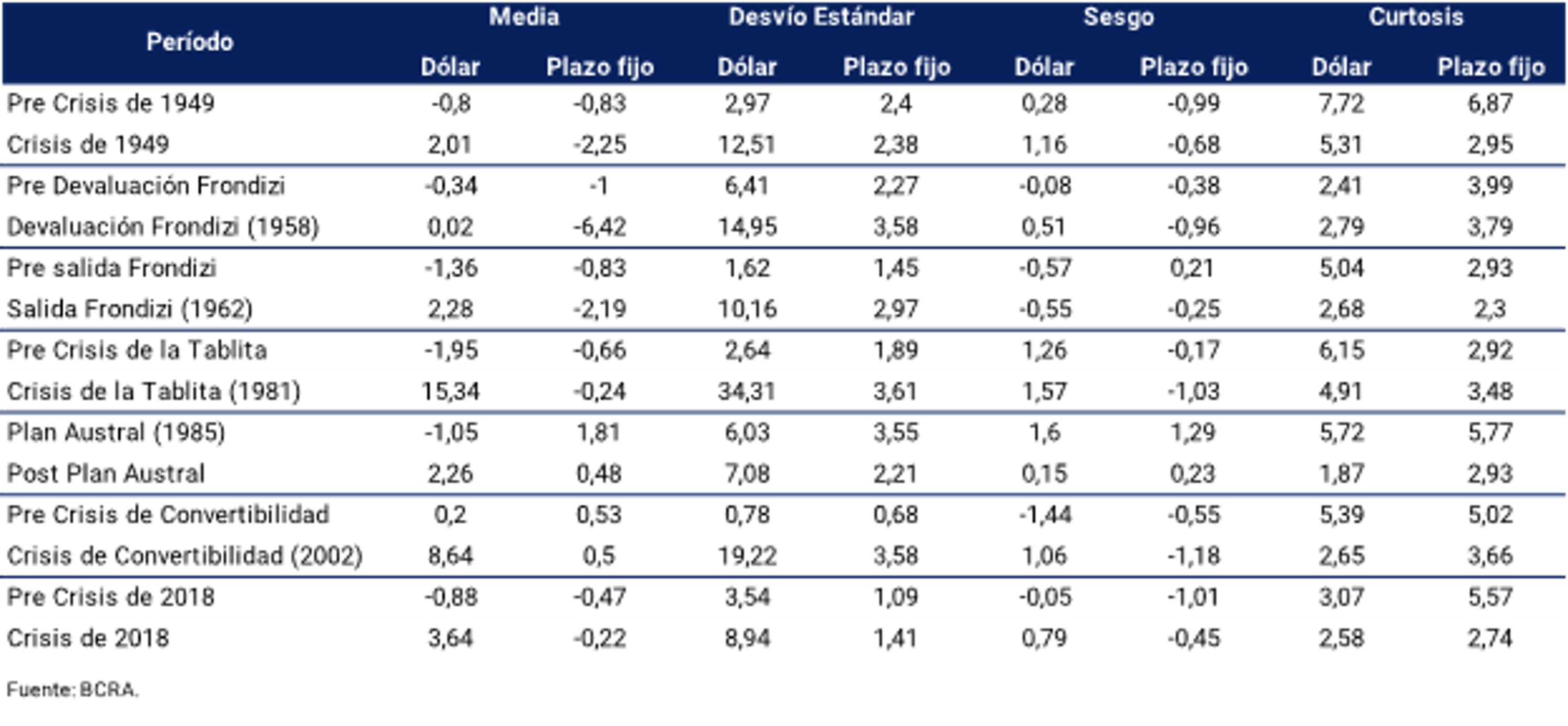 Con el objeto de identificar patrones comunes, el Cuadro 1 presenta los cuatro primeros momentos centrales de la distribución de los retornos reales mensuales del plazo fijo en pesos y de la tenencia de activos denominados en dólares (mismas series del Gráfico 1), separando las etapas con anterioridad y posterioridad al episodio de corrección cambiaria.