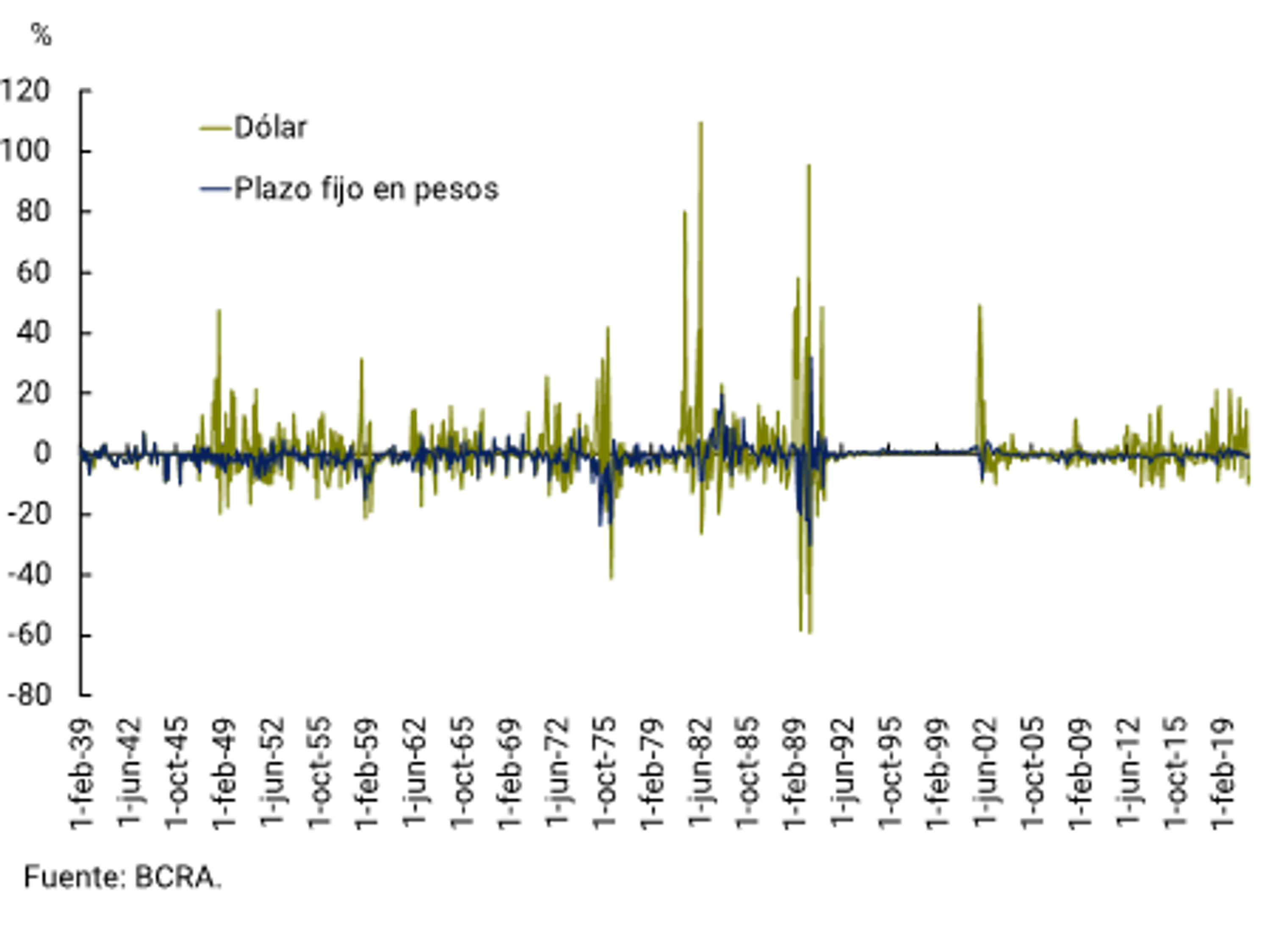 Como punto de partida, el Gráfico 1 muestra la evolución mensual del retorno real a 1 mes del plazo fijo en pesos y de un activo externo62 para los últimos 80 años (entre enero de 1939 y diciembre de 2020).