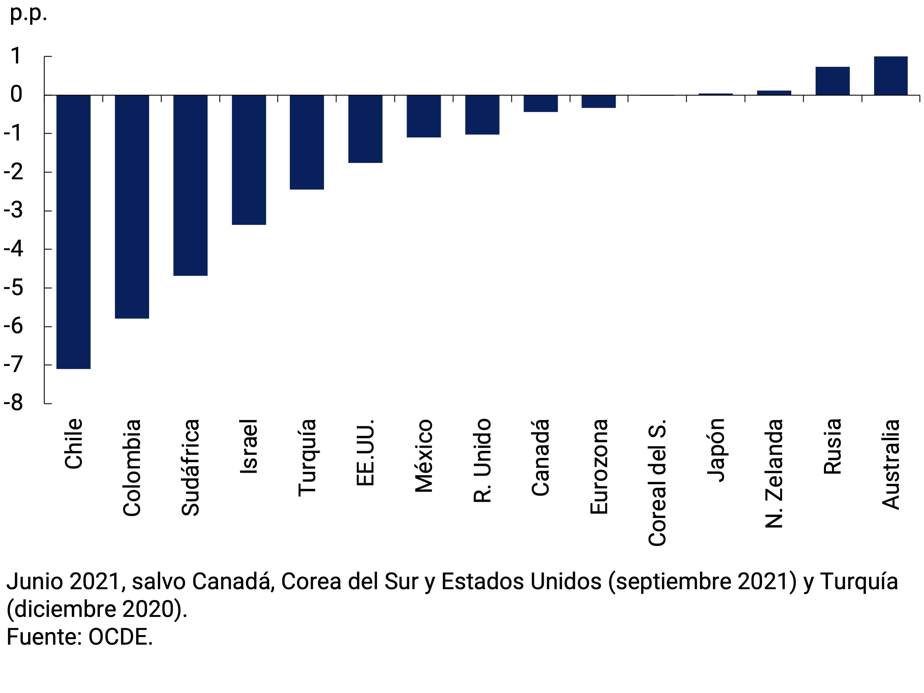 El promedio de la tasa de interés de los países emergentes relevados pasó de 3% en octubre de 2020 a 4,5% un año después (ver Gráfico 2.8). En algunos casos, las medidas contractivas se aceleraron. En su reunión de octubre pasado, el Banco Central de Chile decidió el mayor incremento de su tasa de interés de política monetaria de las últimas dos décadas (+1,25 p.p.). Análogamente, el Comité de Política Monetaria del Banco Central de Brasil aumentó el objetivo sobre la tasa SELIC en 1,5 p.p. a fines de octubre; se trató también de un aumento récord en más de dos décadas, y 50 p.b. por encima de lo previsto en encuestas de mercado.